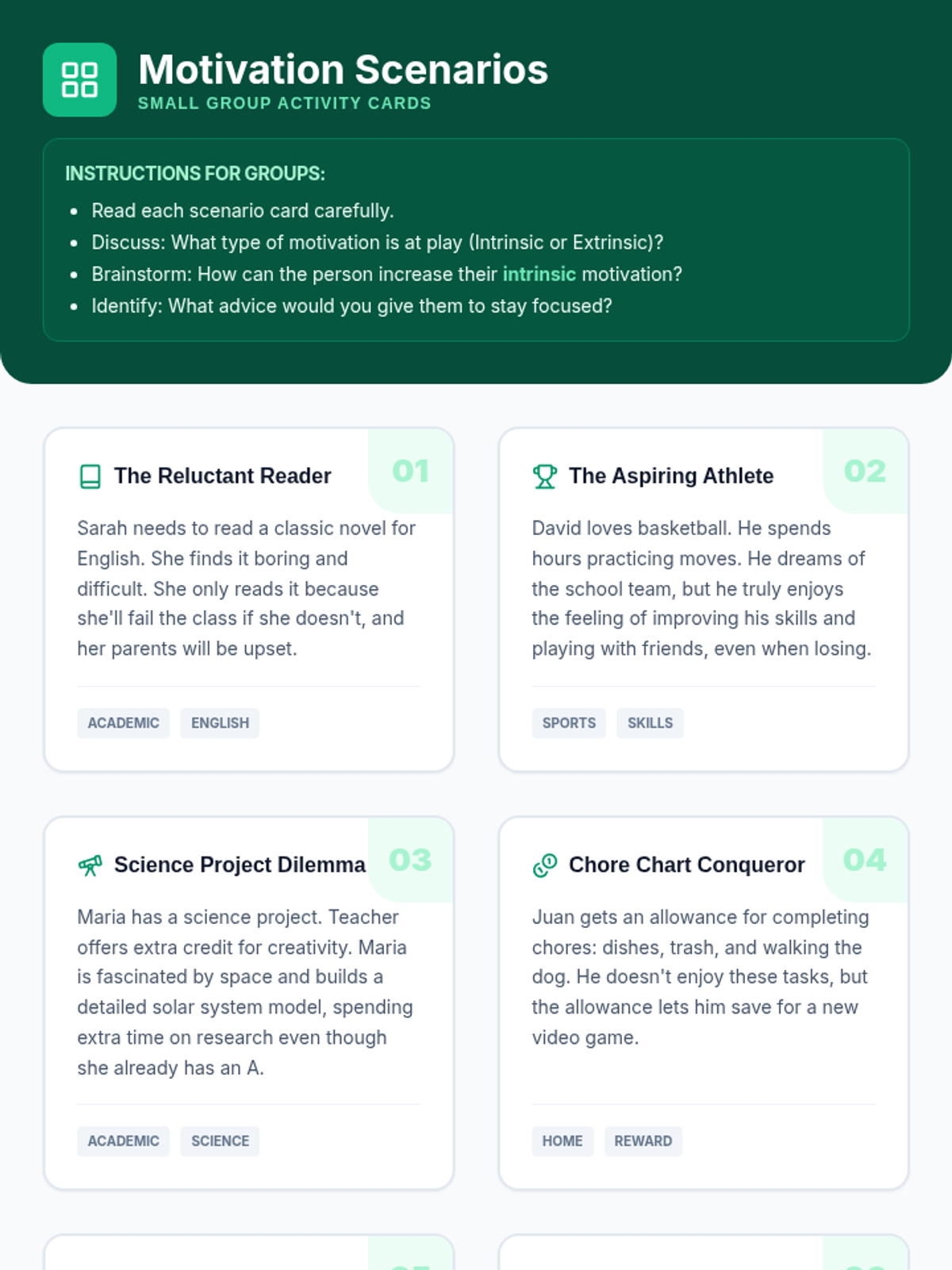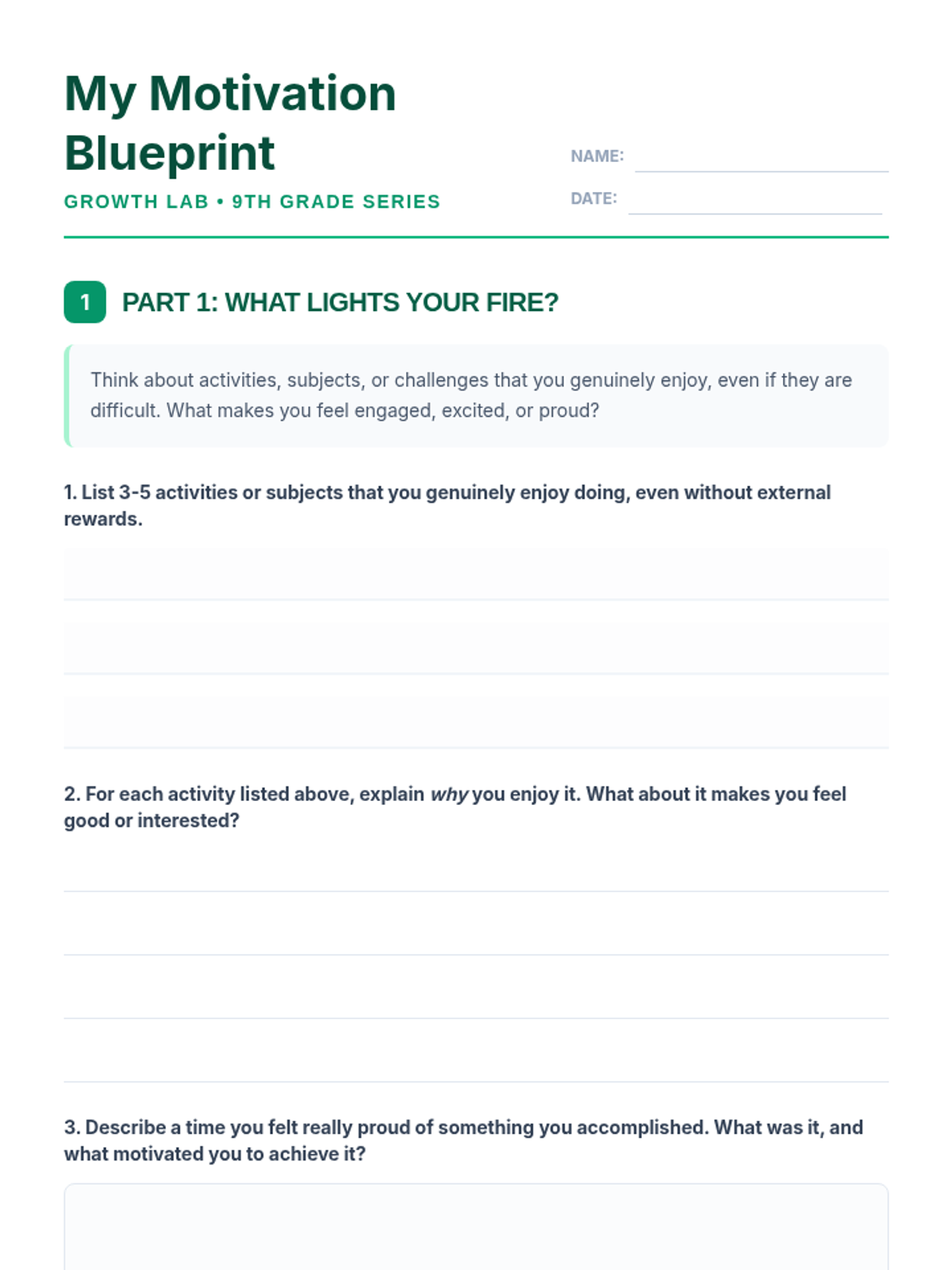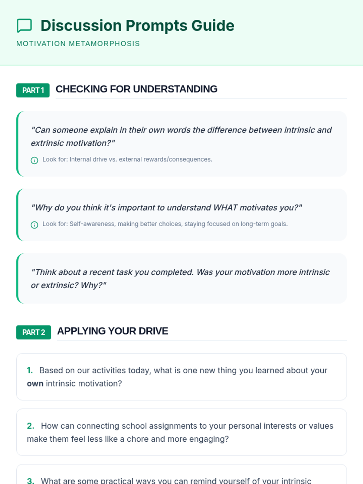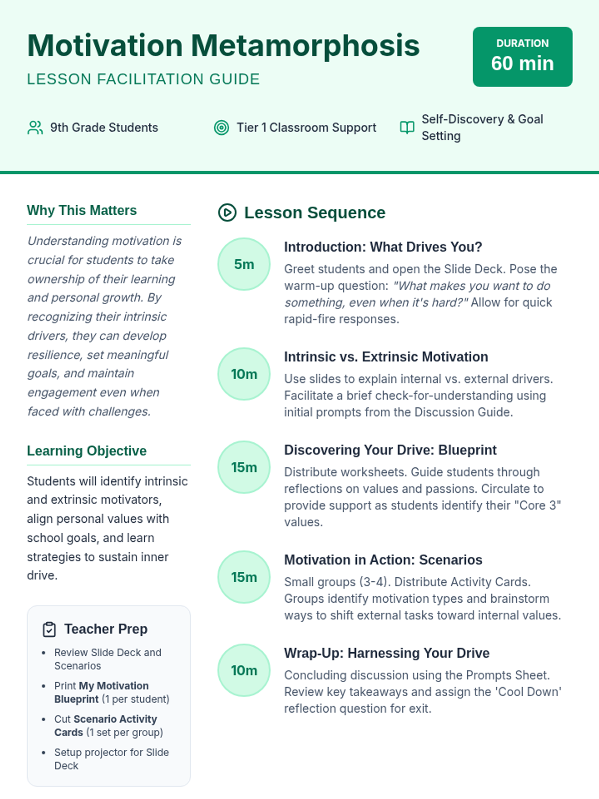 A 60-minute lesson for 9th graders to explore intrinsic and extrinsic motivation, identify personal values, and develop strategies to sustain their inner drive.