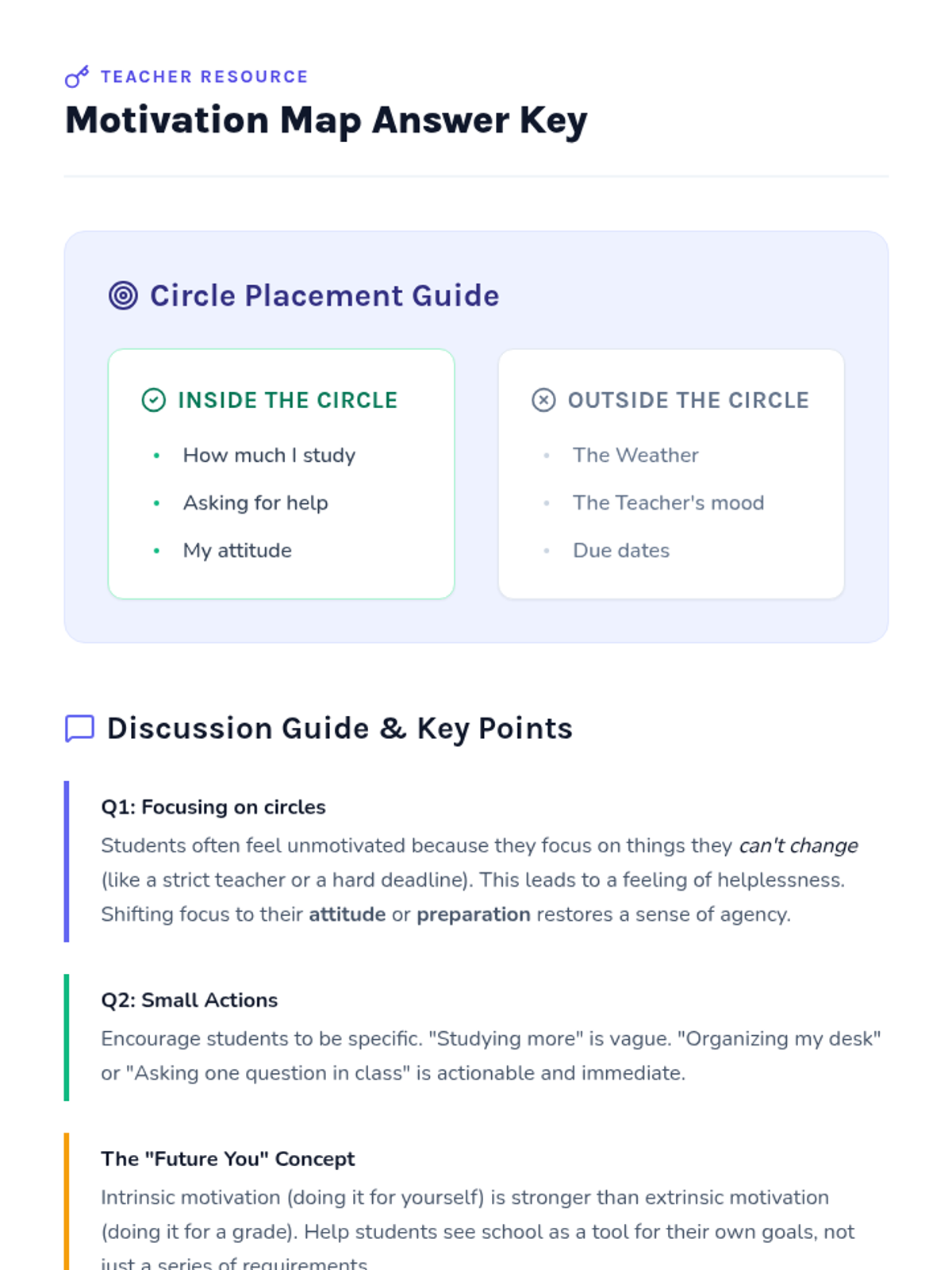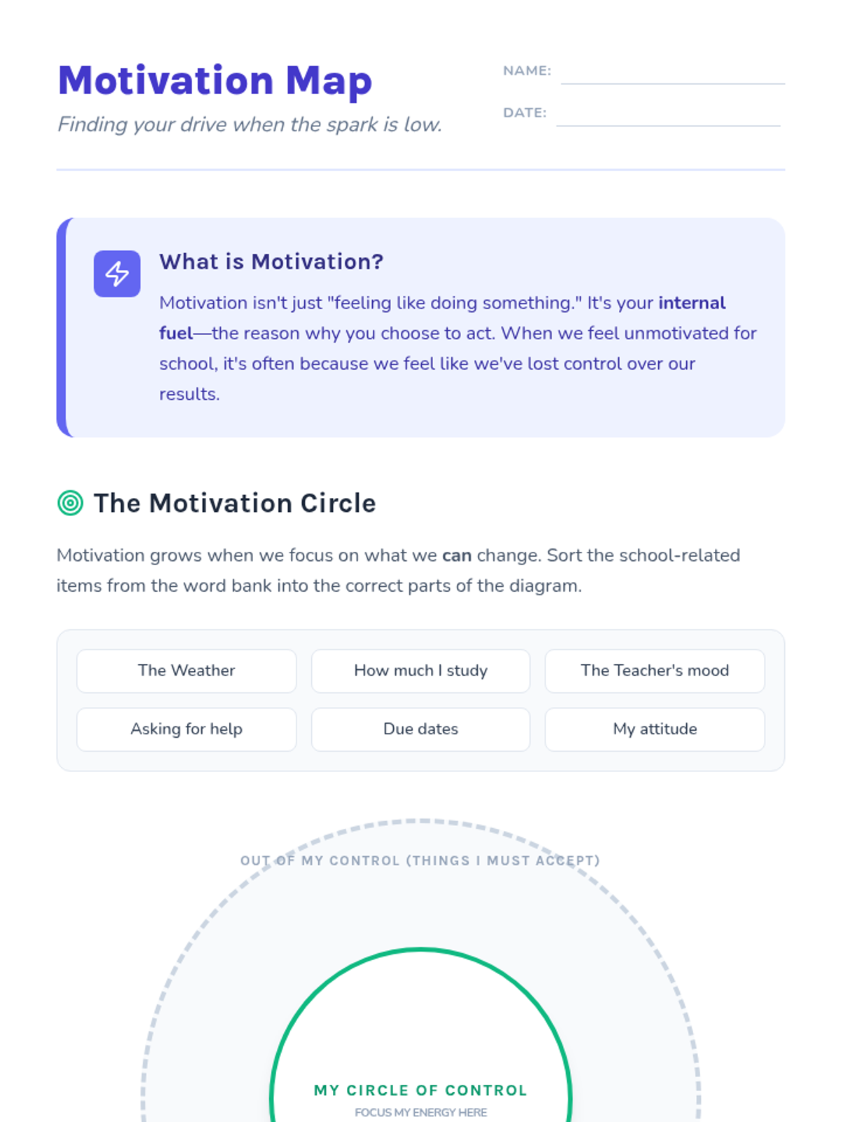 A short, reflective lesson helping students identify what they can control in their academic life to spark motivation even when things feel difficult.
