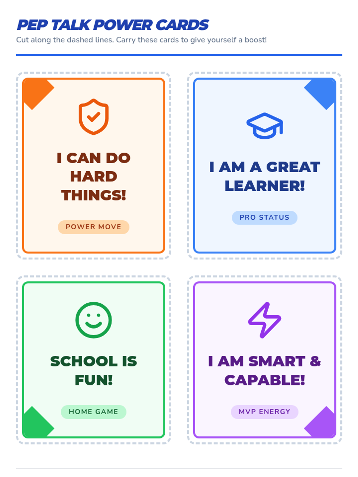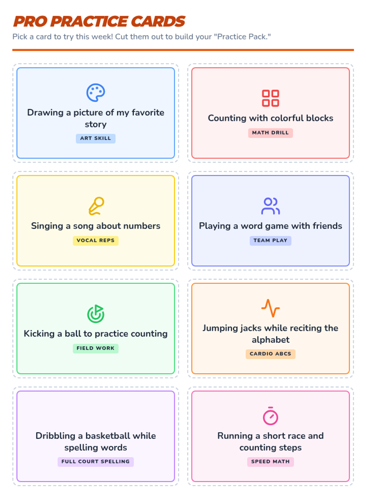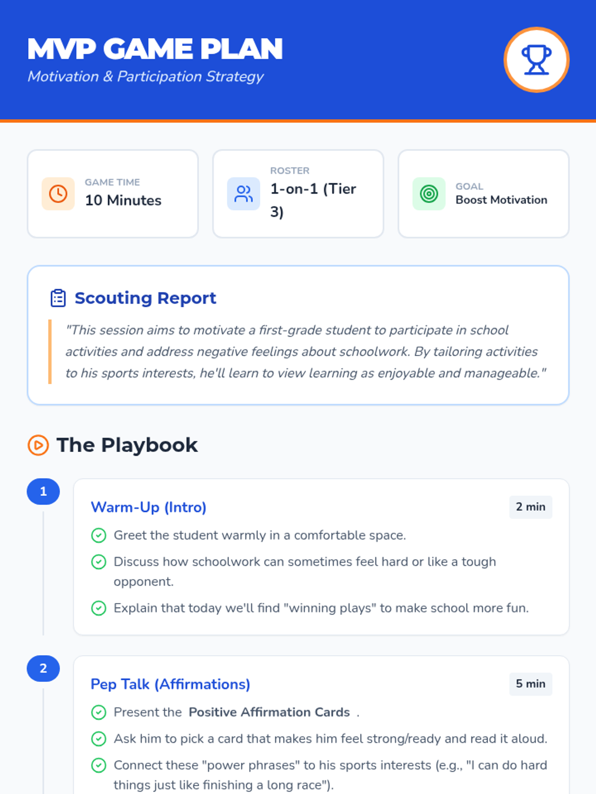 A personalized one-on-one session for a first-grade student designed to boost motivation through positive affirmations and interest-based school activities, with a focus on active, sports-themed learning.