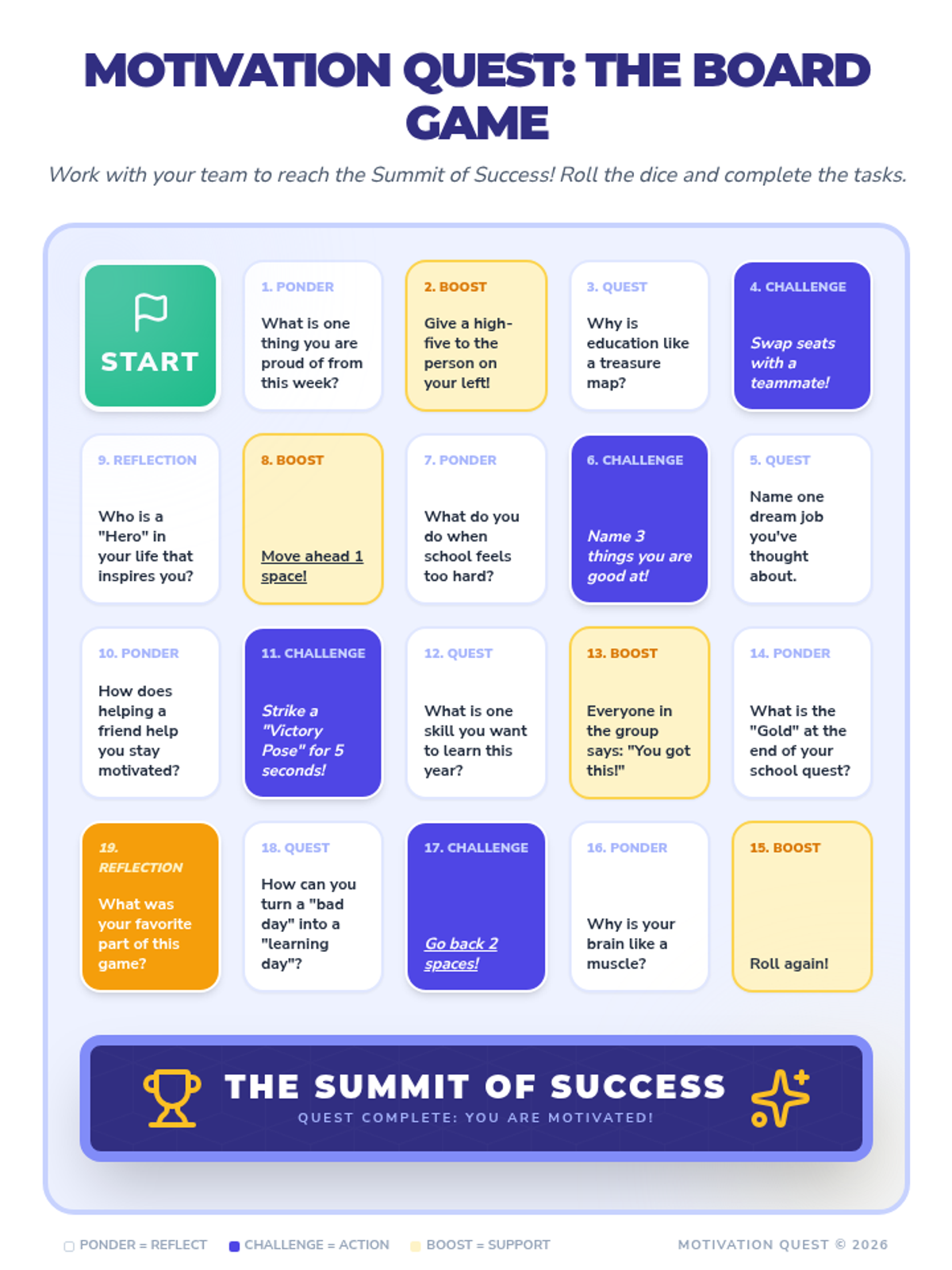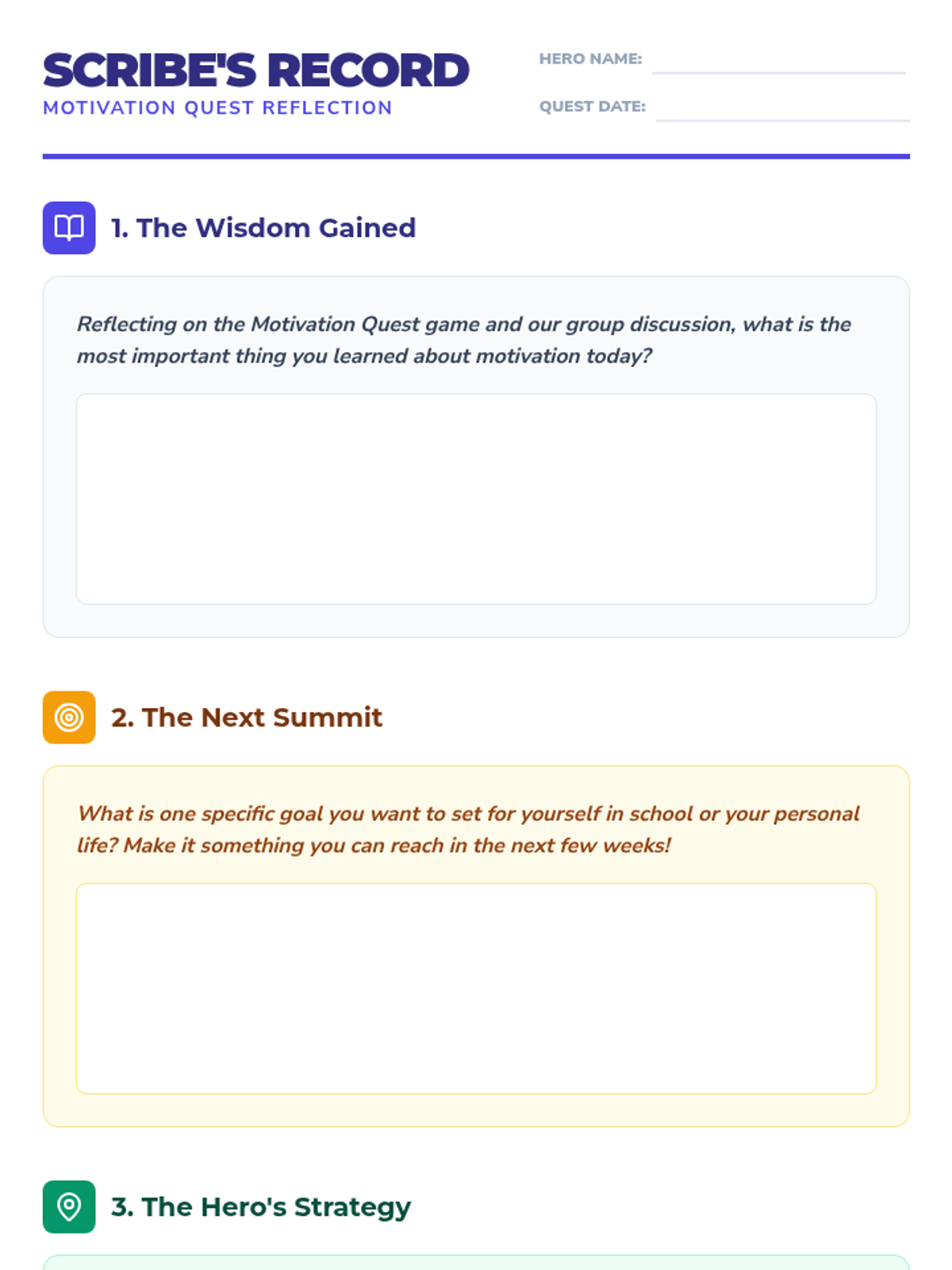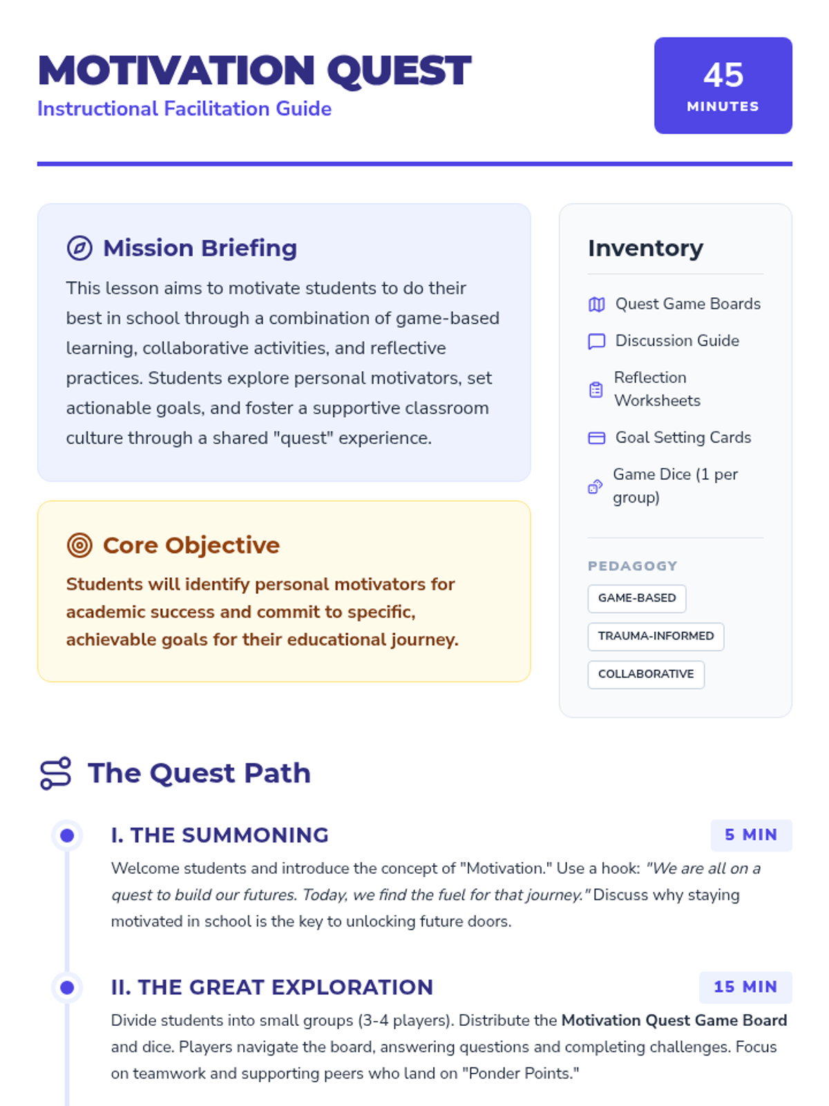 A game-based lesson designed to inspire students to excel in school through collaborative challenges, goal setting, and reflective practices. Students embark on a 'quest' to discover their personal motivators and build a supportive classroom community.