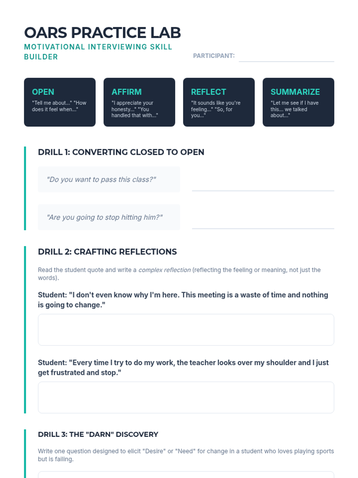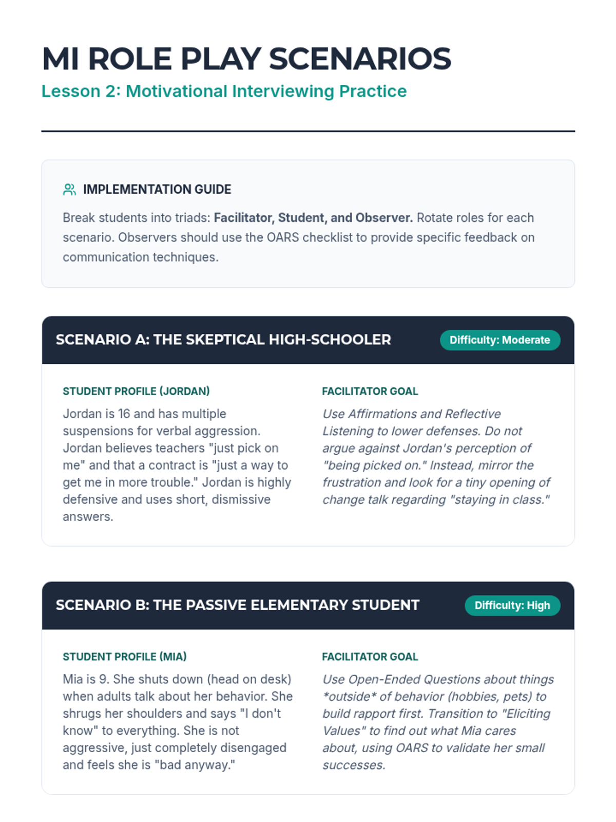 Trains students in Motivational Interviewing (MI) techniques, specifically the OARS framework, to elicit change talk and identify behavioral gaps with resistant students.