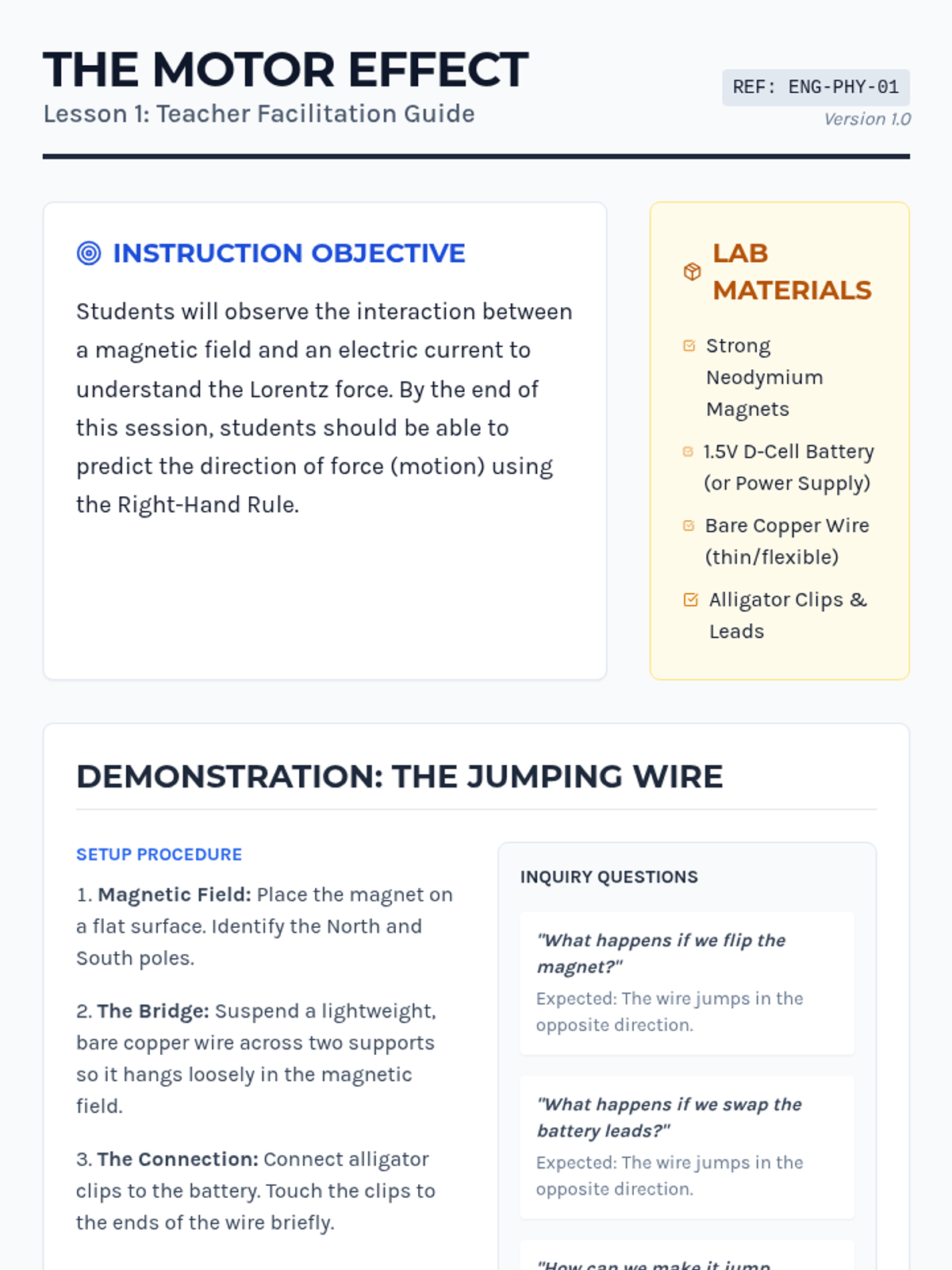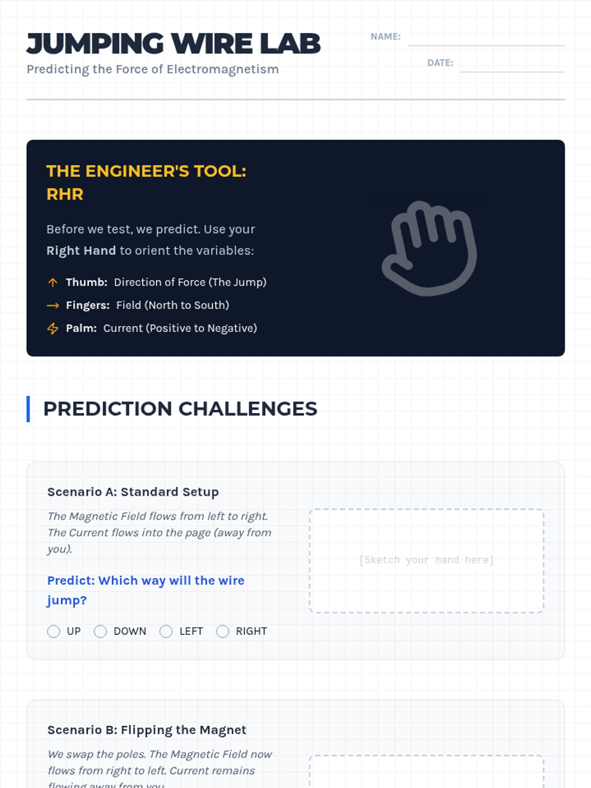 Students observe the Lorentz force in action through the 'jumping wire' demonstration and learn to predict the direction of force using the right-hand rule.