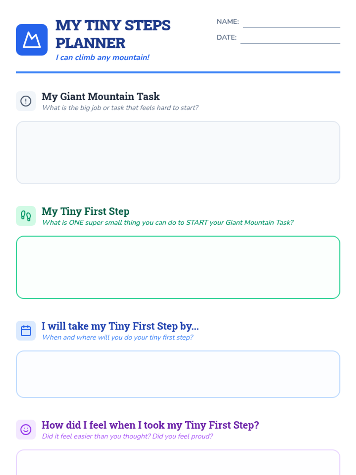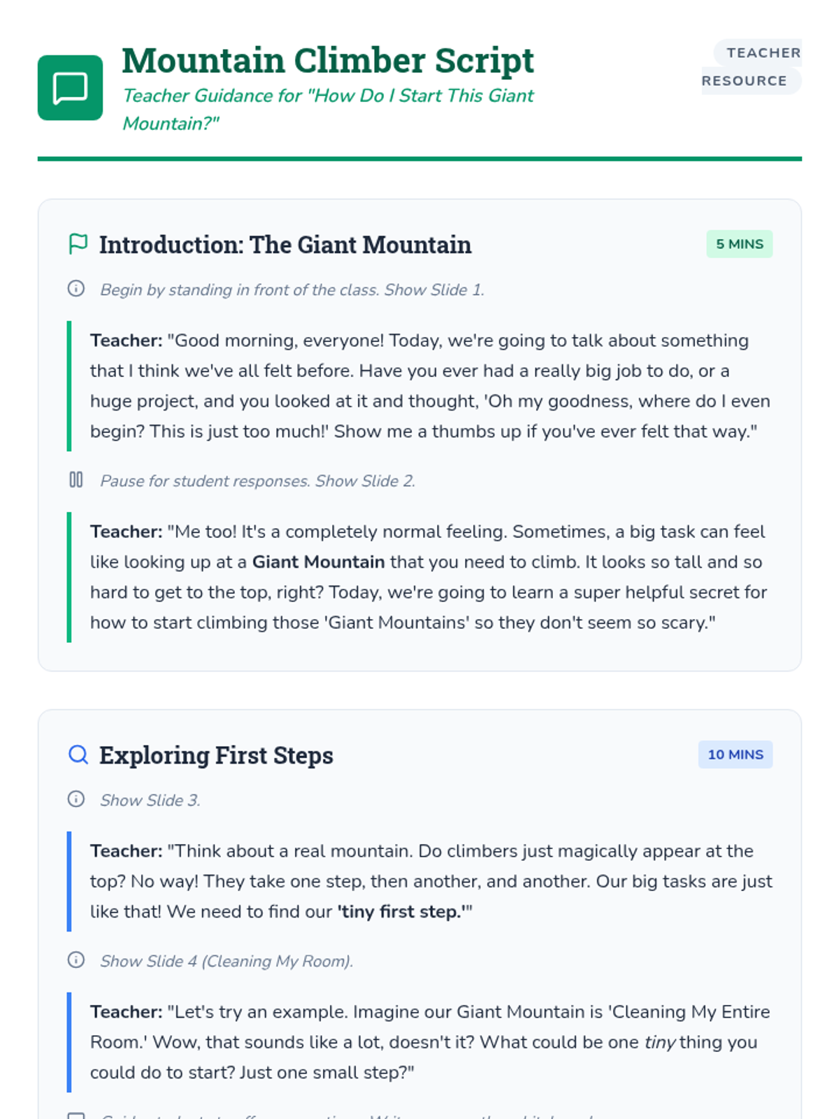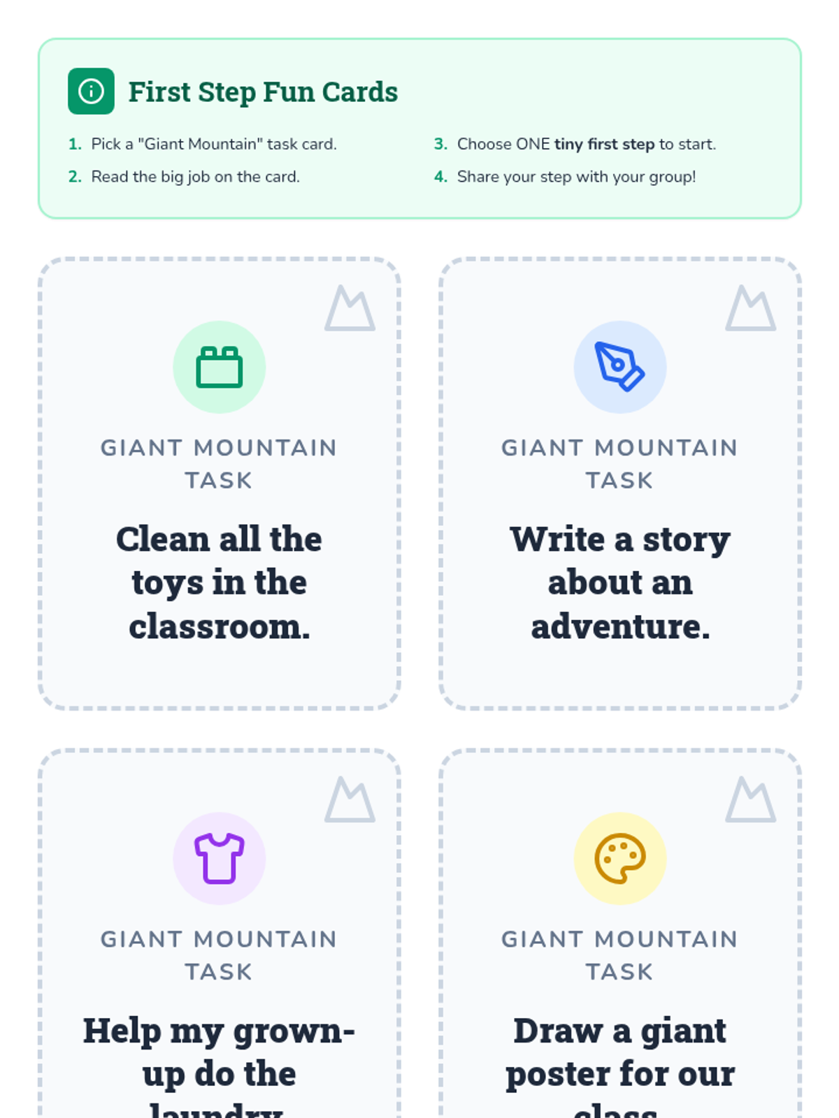 A lesson for 2nd graders focused on developing executive function skills by breaking large, overwhelming tasks into small, manageable 'first steps.' Students use a mountain-climbing metaphor to practice task initiation and reduce anxiety.