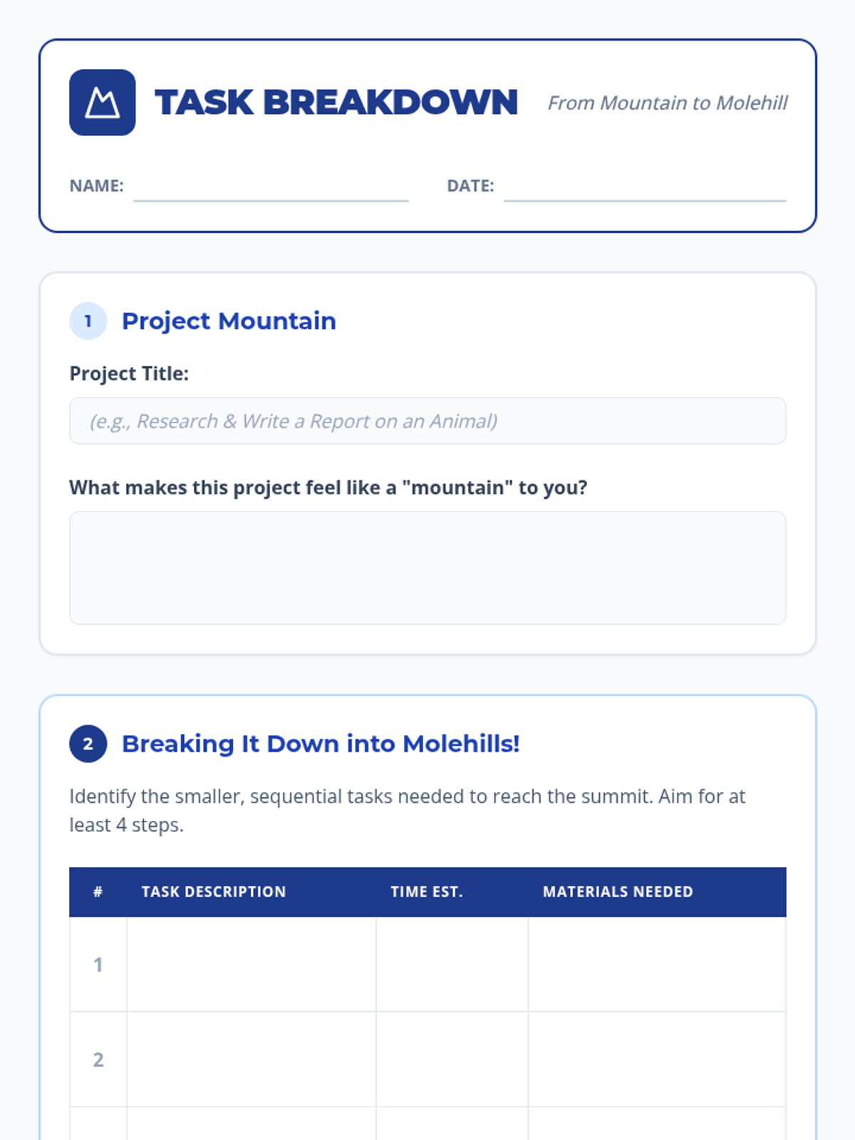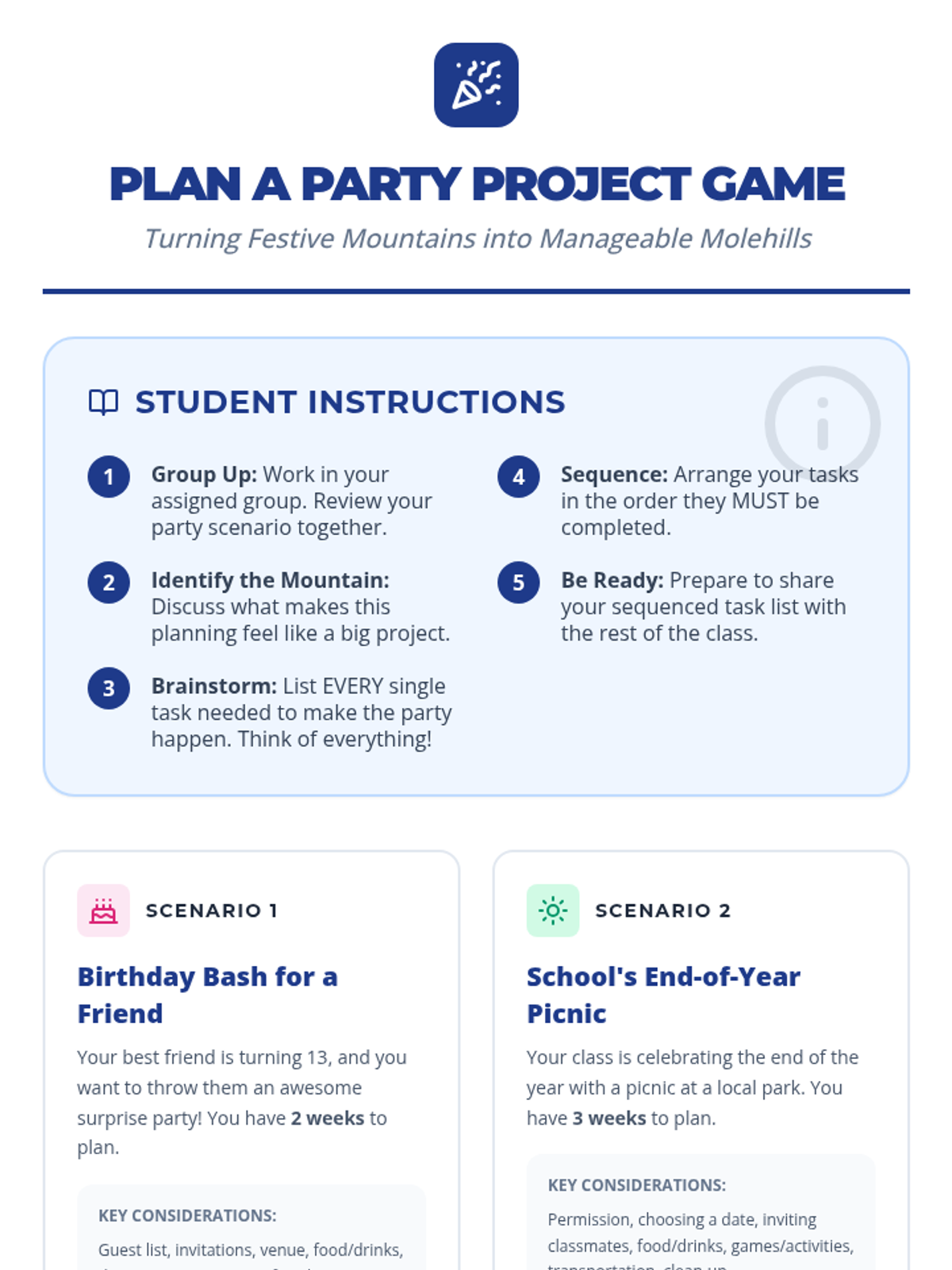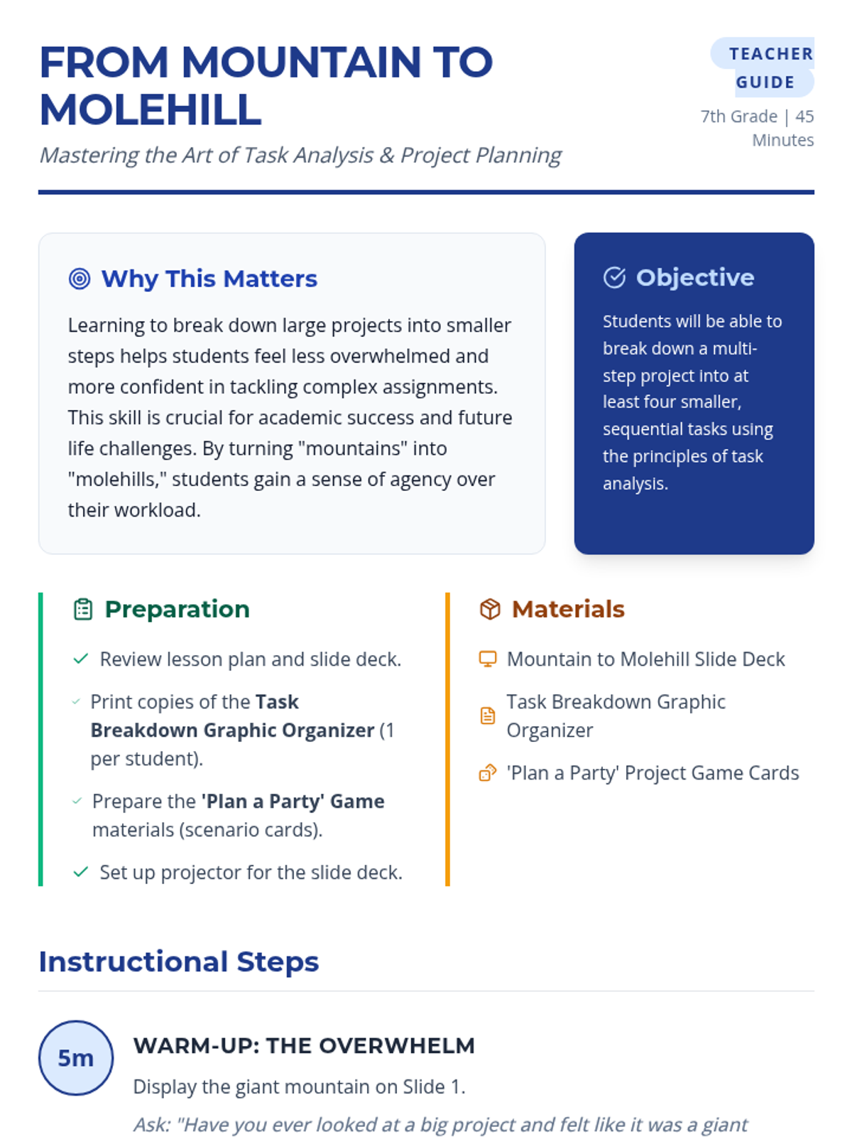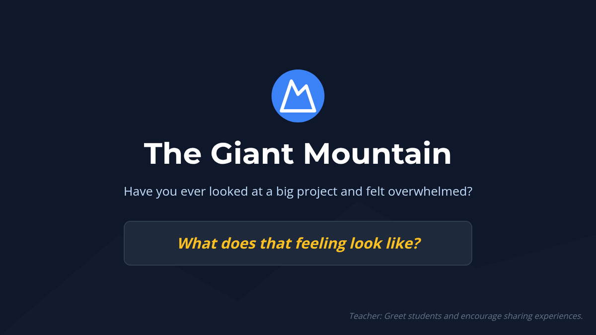 This lesson teaches 7th-grade students how to tackle large, multi-step projects by breaking them down into smaller, manageable tasks through task analysis, chunking, and sequencing.