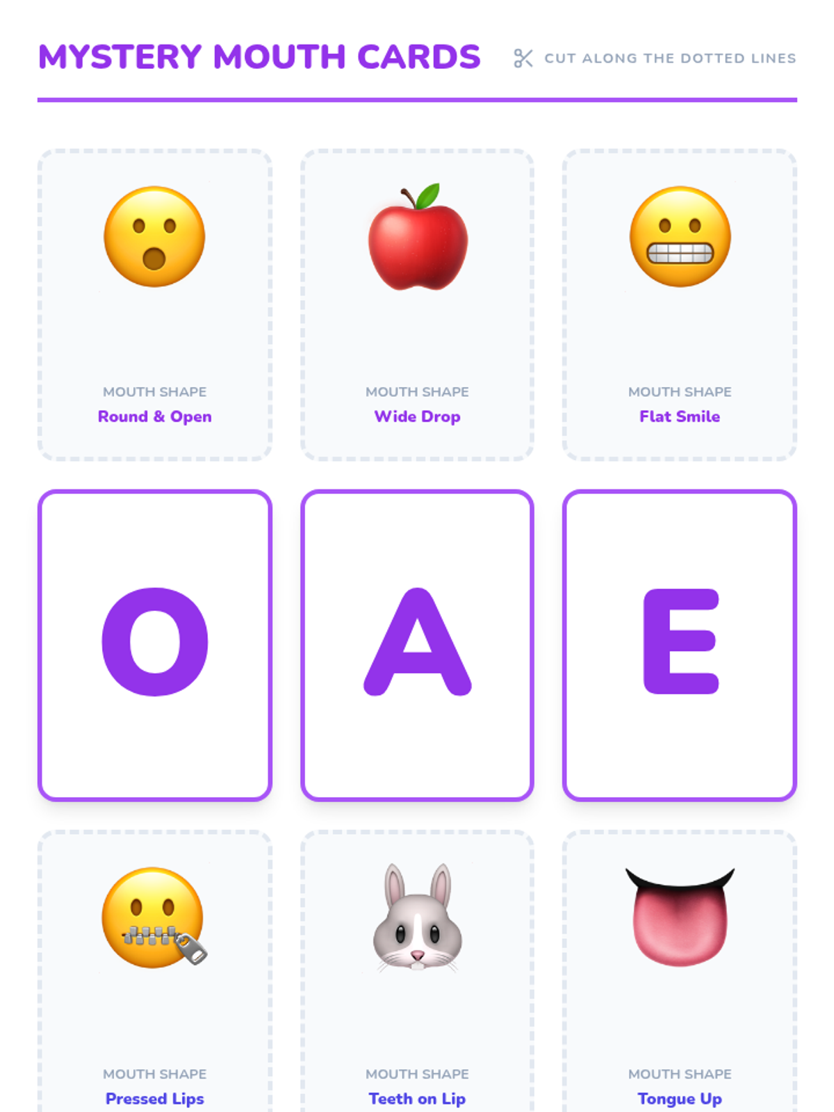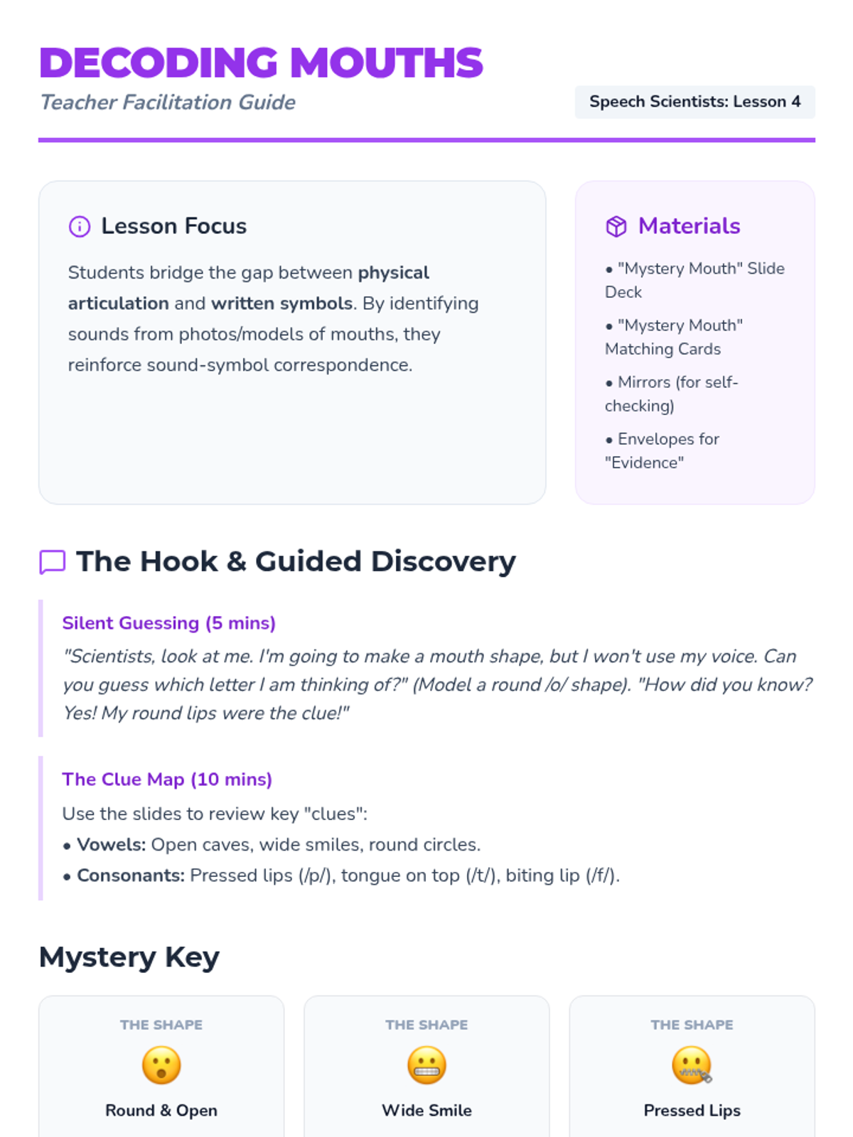 Students match physical mouth shapes to specific letter cards, participating in a 'Mouth Mystery' activity to identify sounds visually.