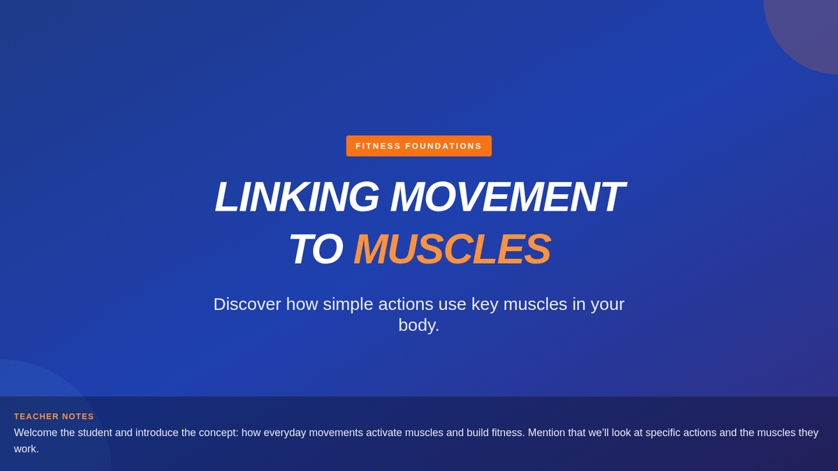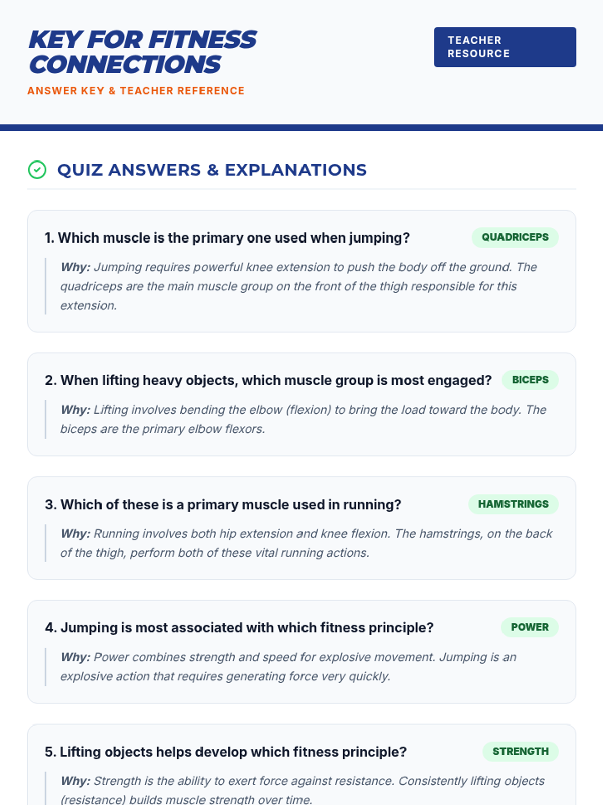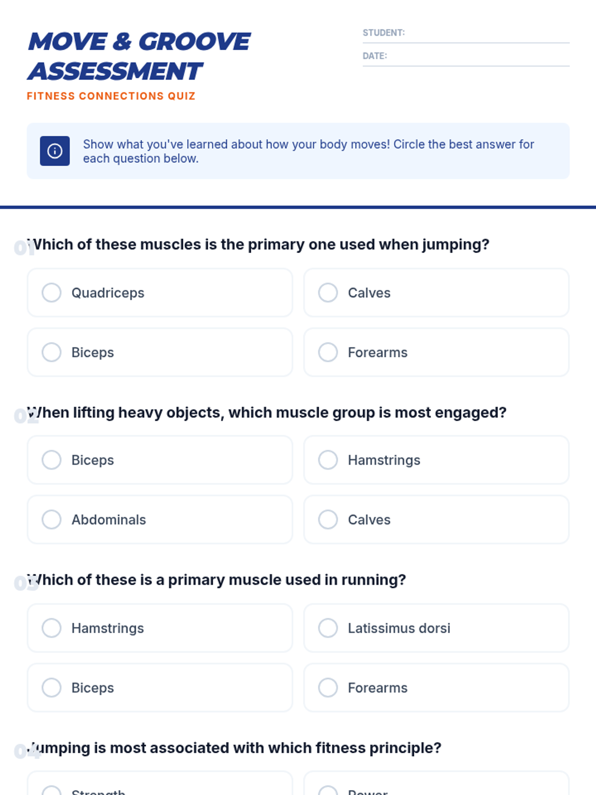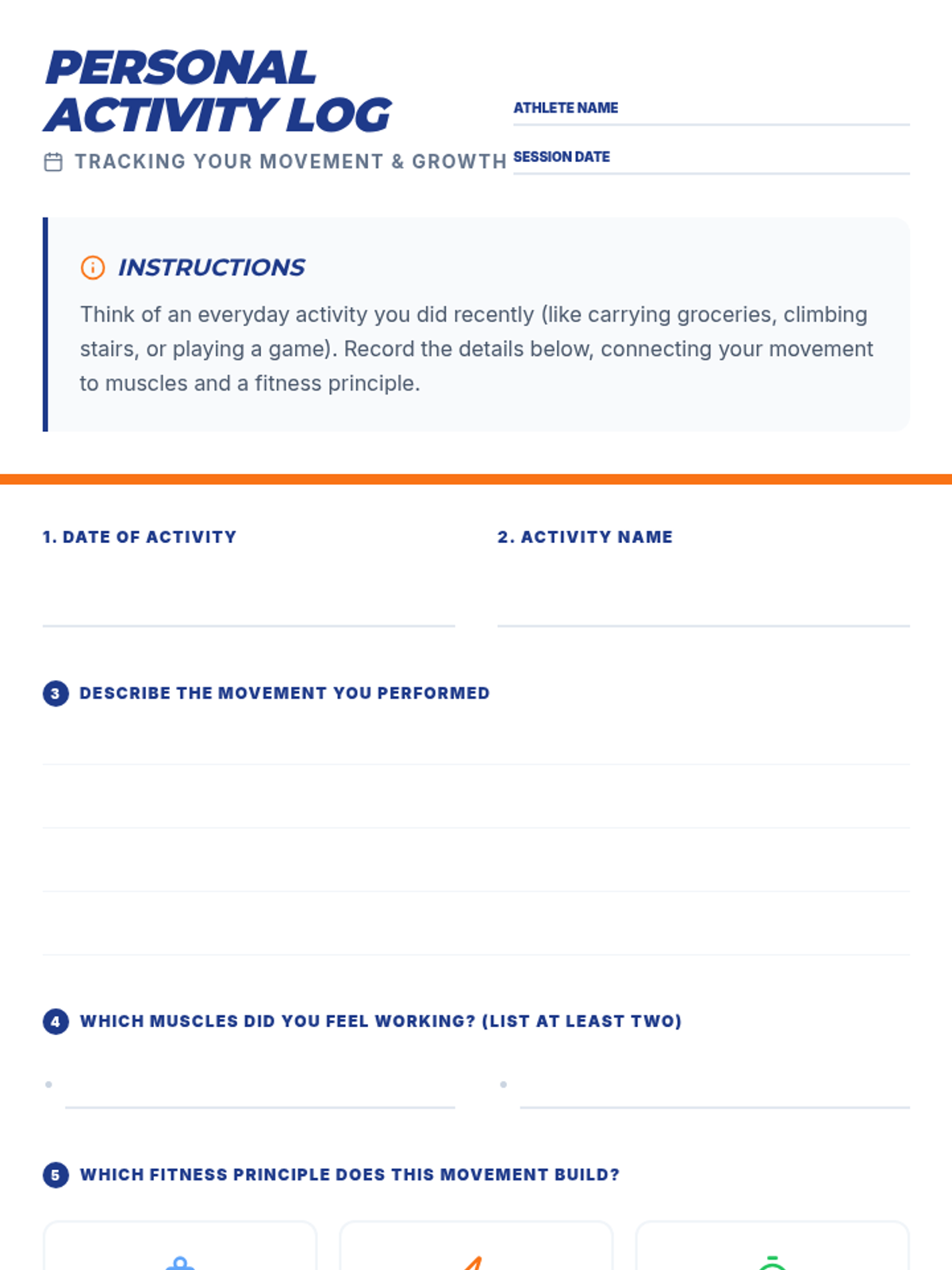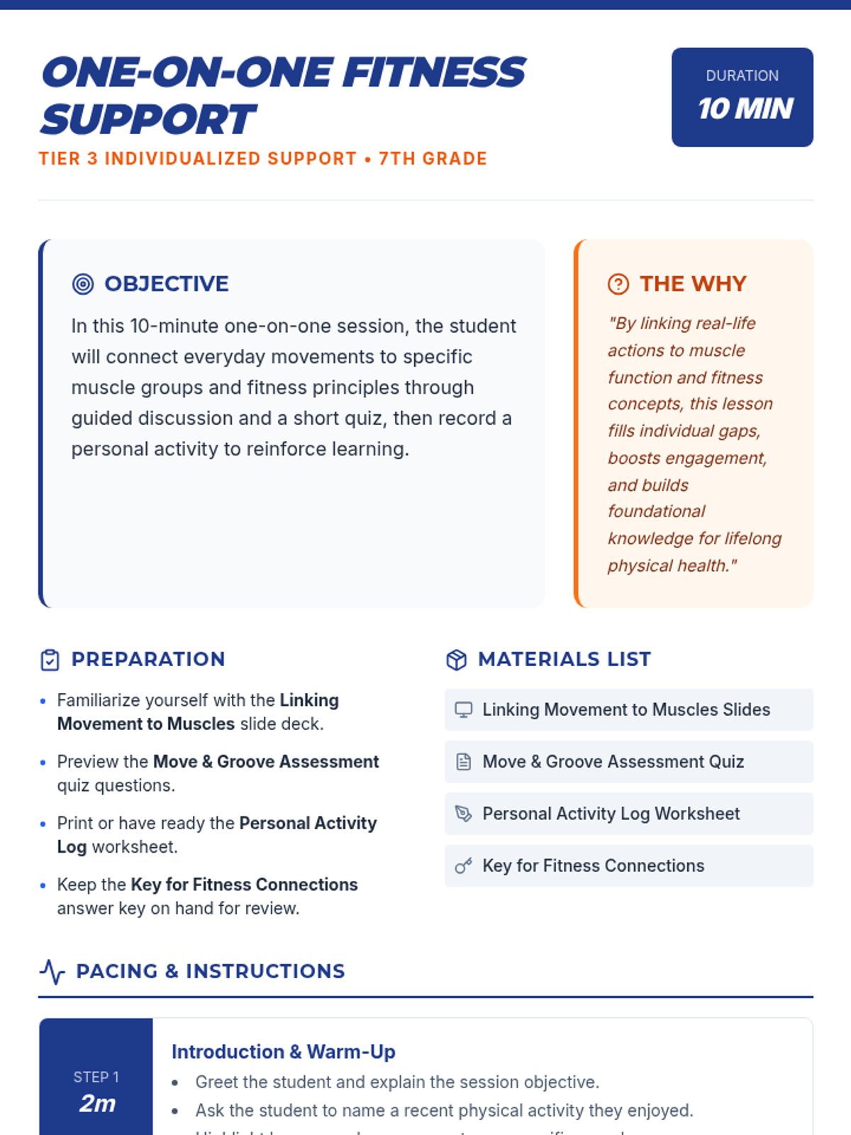 A 10-minute individualized session for 7th graders connecting everyday movements to muscle groups and fitness principles like strength, power, and endurance.