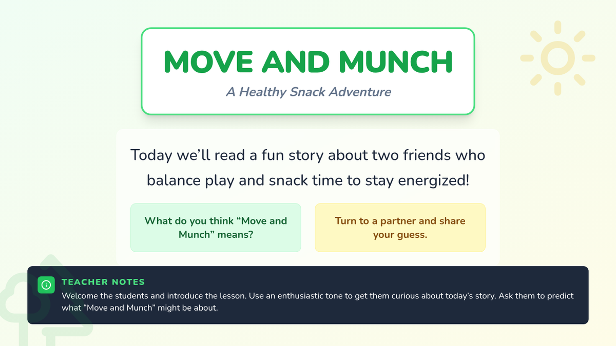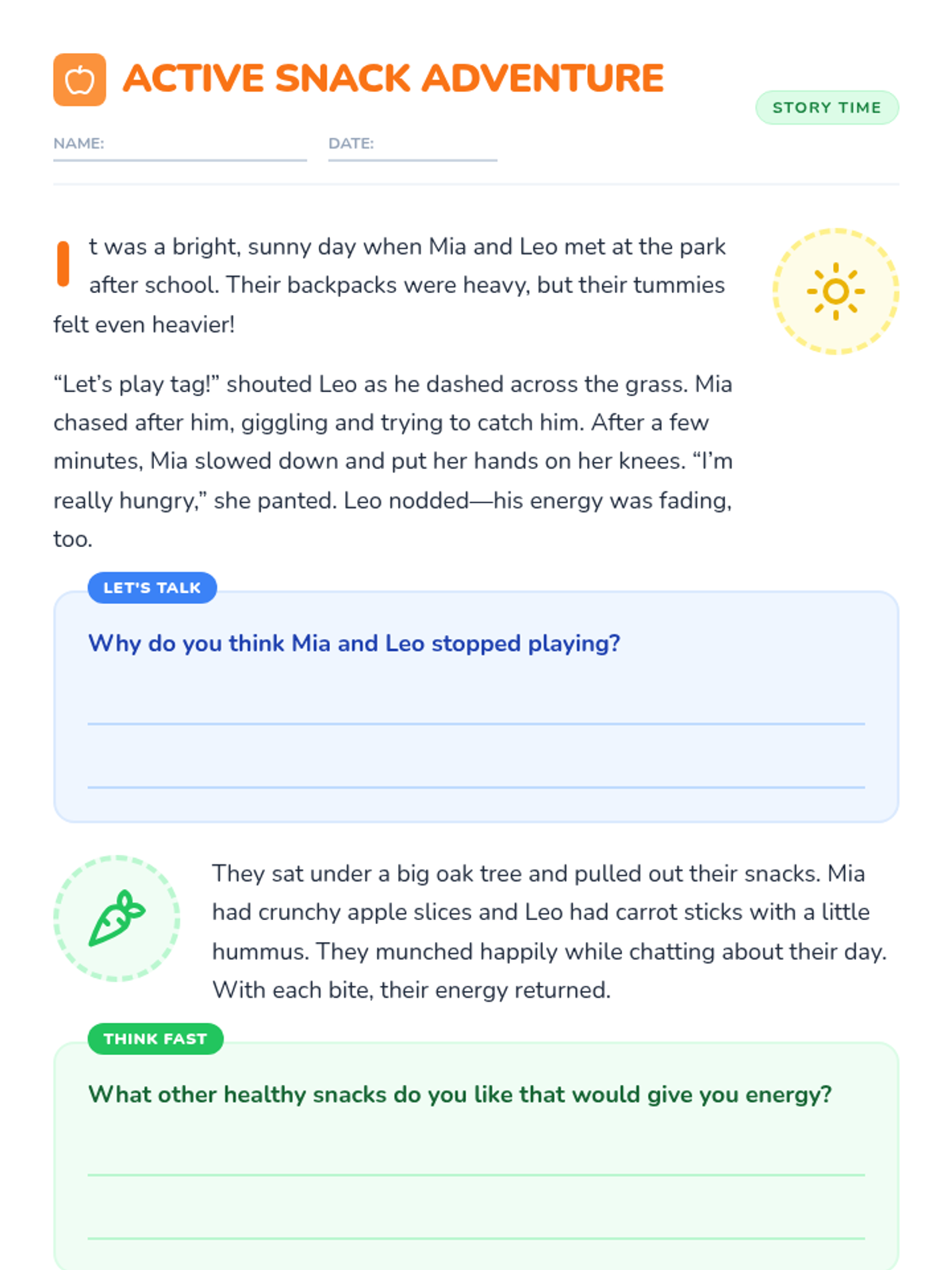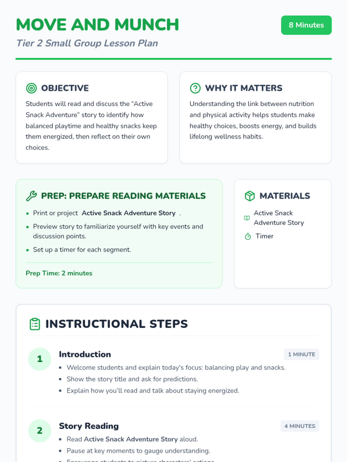 A quick, 8-minute Tier 2 small-group lesson for 2nd graders that uses a story to teach the connection between healthy snacking and physical activity. Students read about Mia and Leo's park adventure and reflect on their own healthy choices.