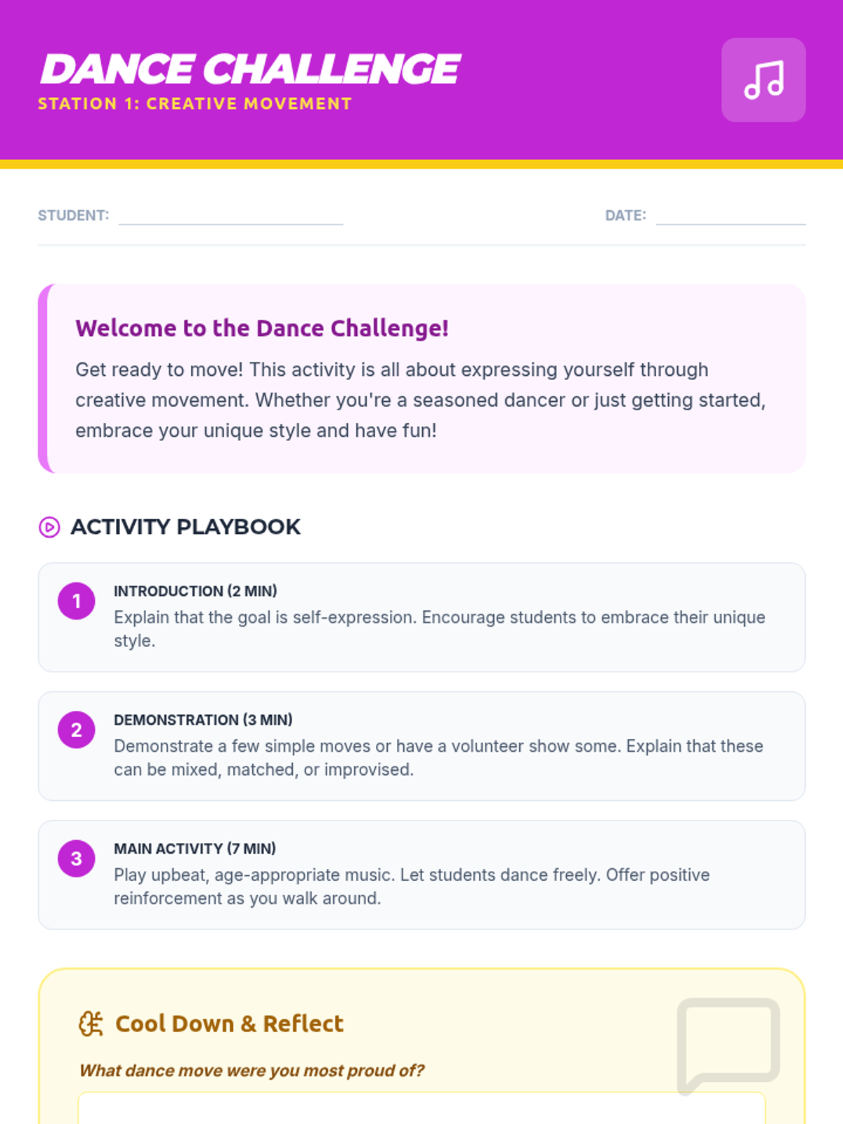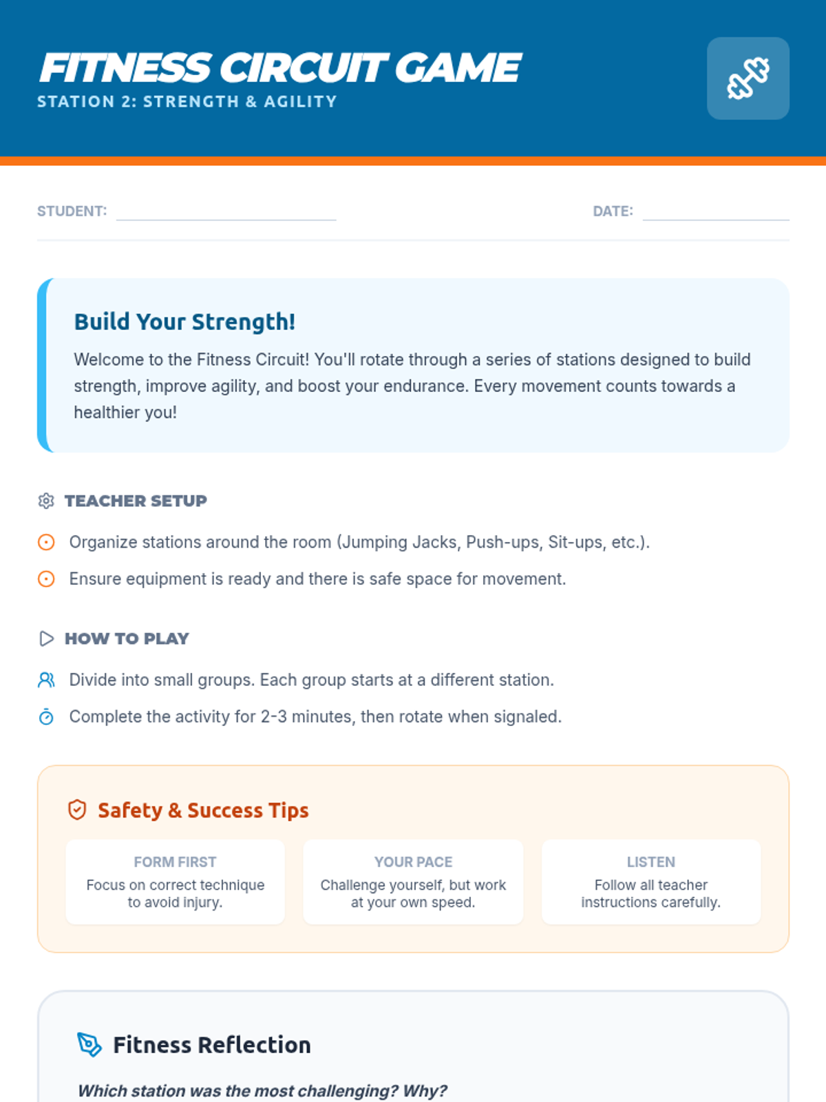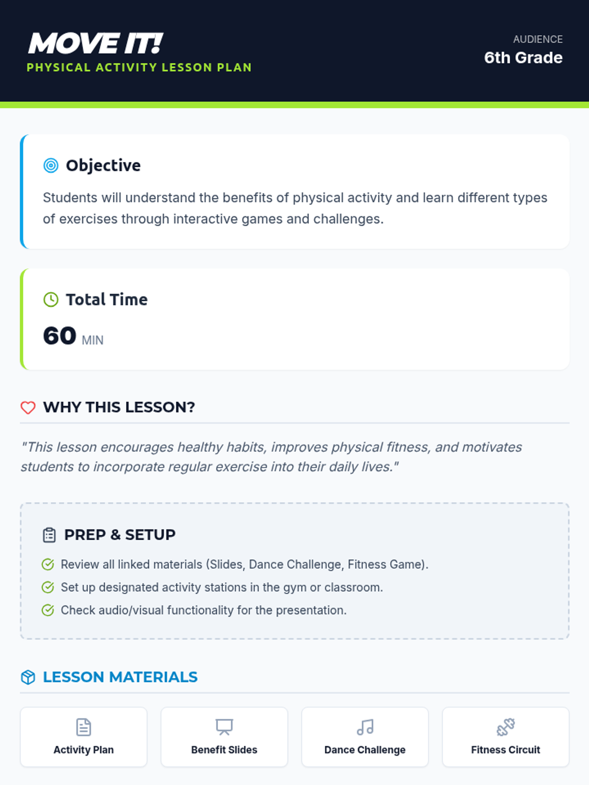 An energetic 60-minute lesson for 6th graders focused on the physical and mental benefits of exercise through interactive stations and discussion.