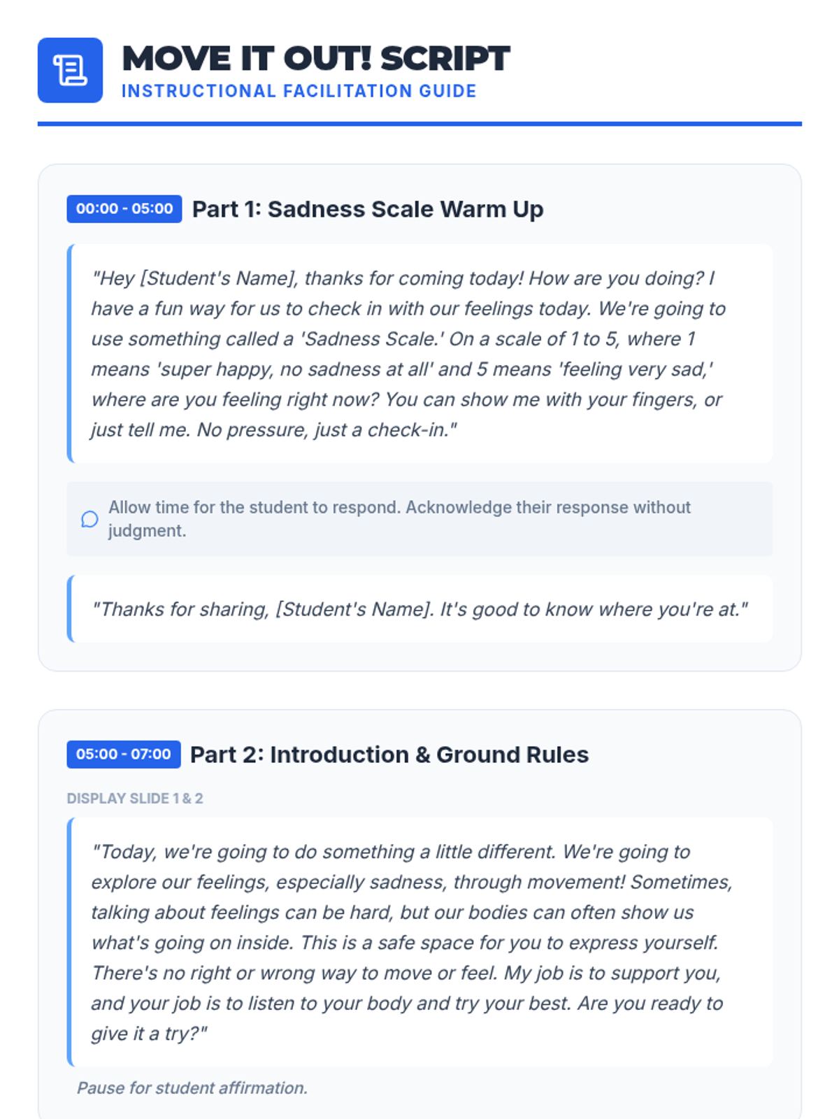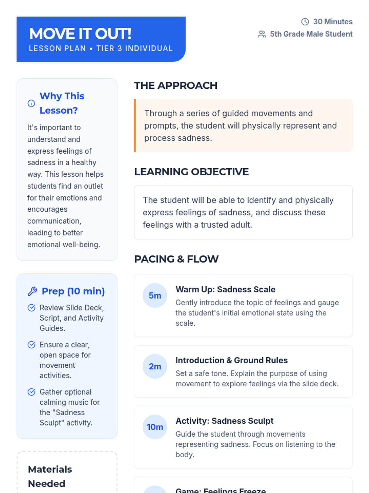 A Tier 3 individual movement-based lesson for a 5th-grade student to explore and express feelings of sadness through physical activity and reflection.