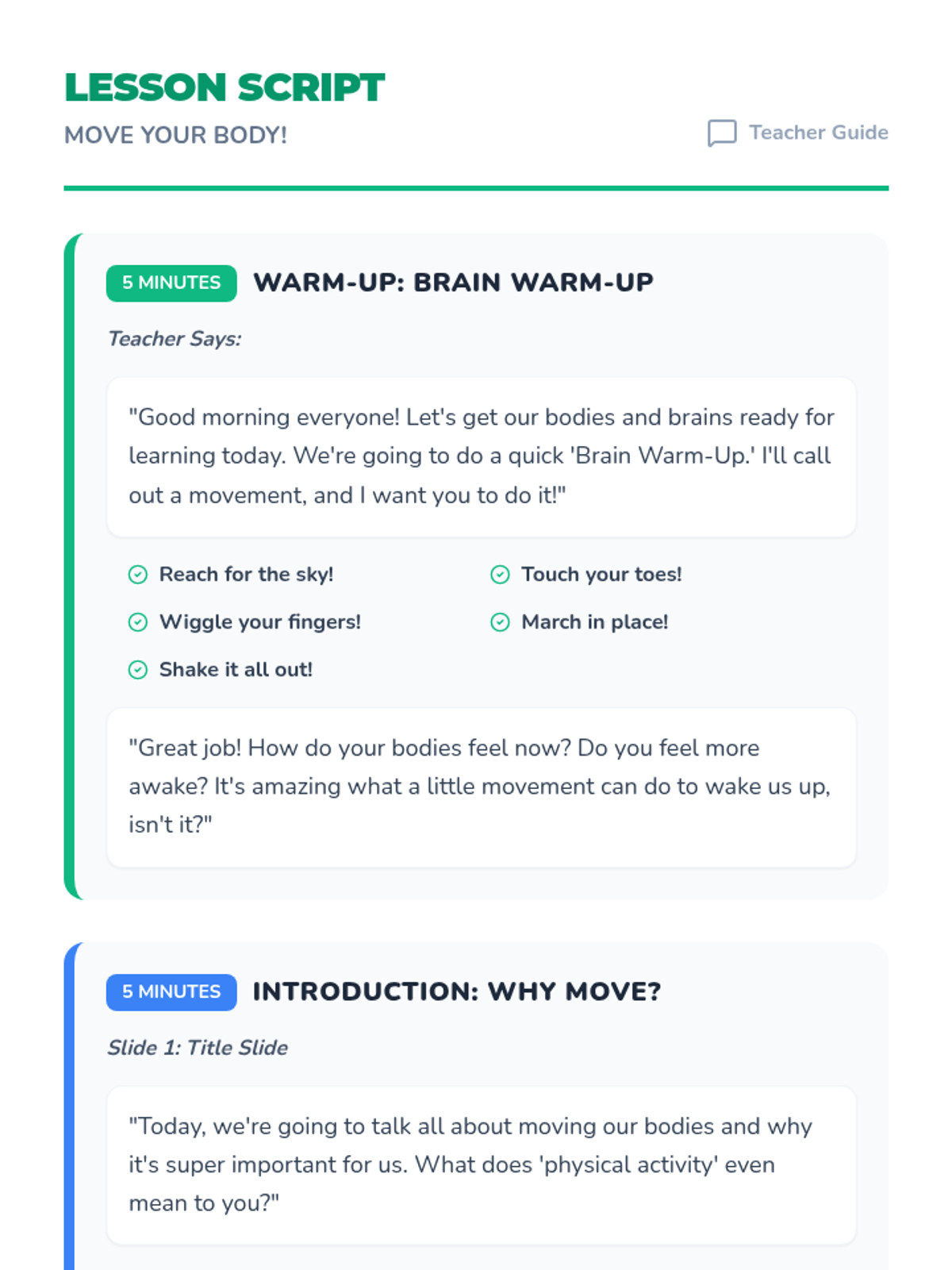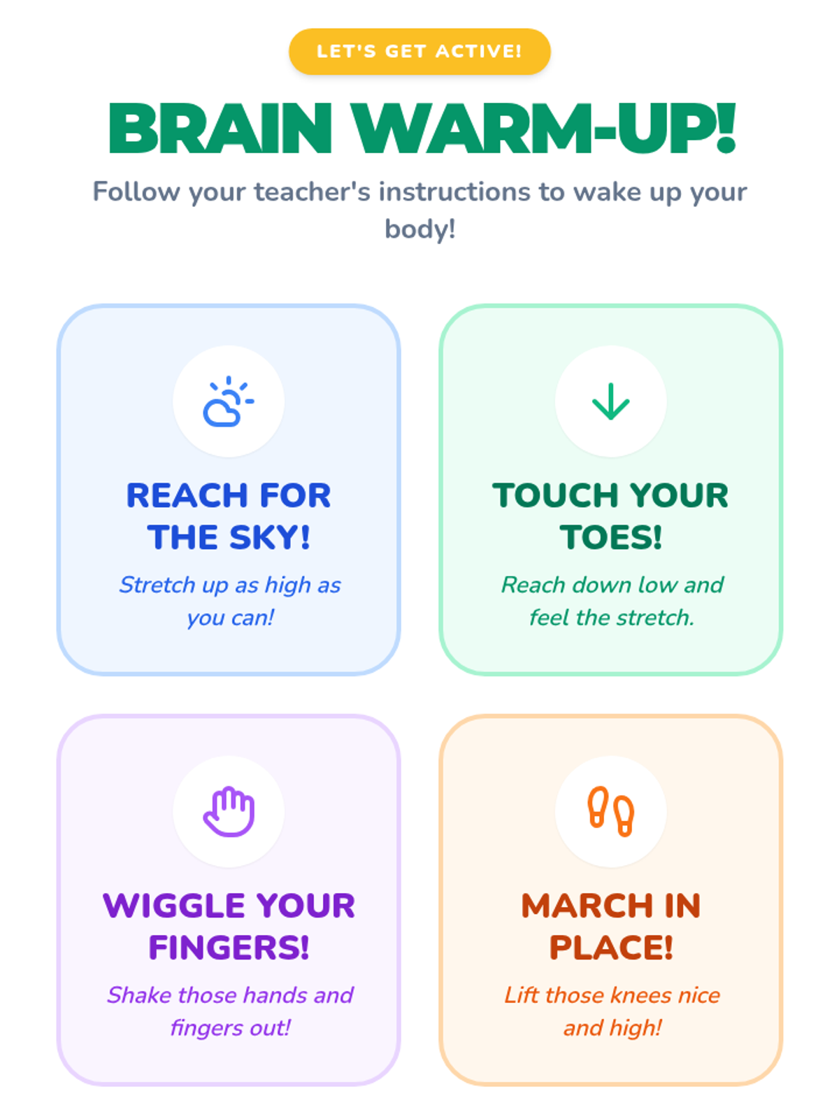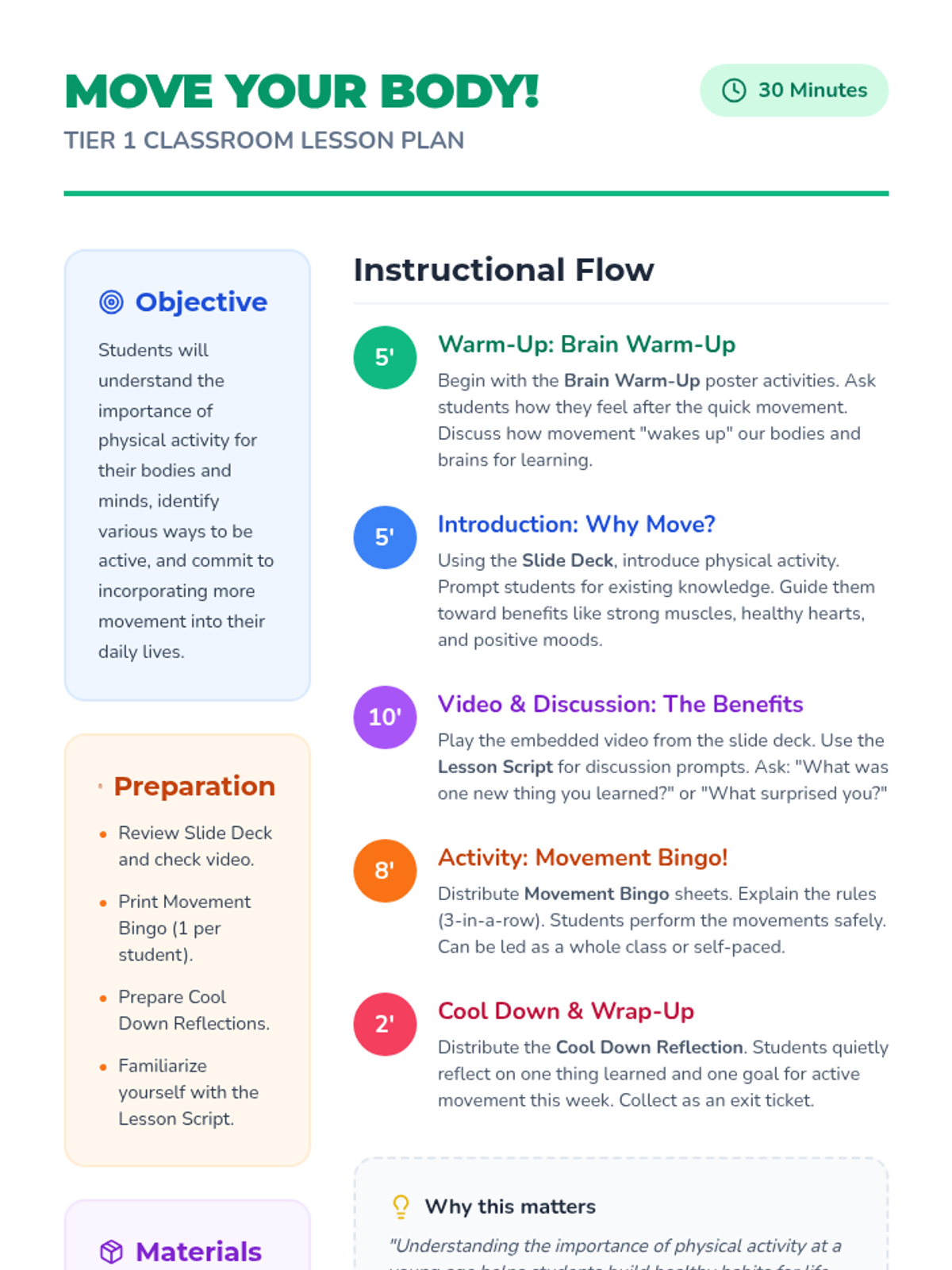 An energetic 30-minute Tier 1 lesson for 3rd graders exploring the benefits of physical activity for body and mind through movement, video, and games.