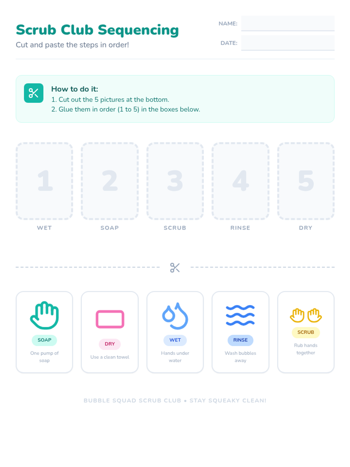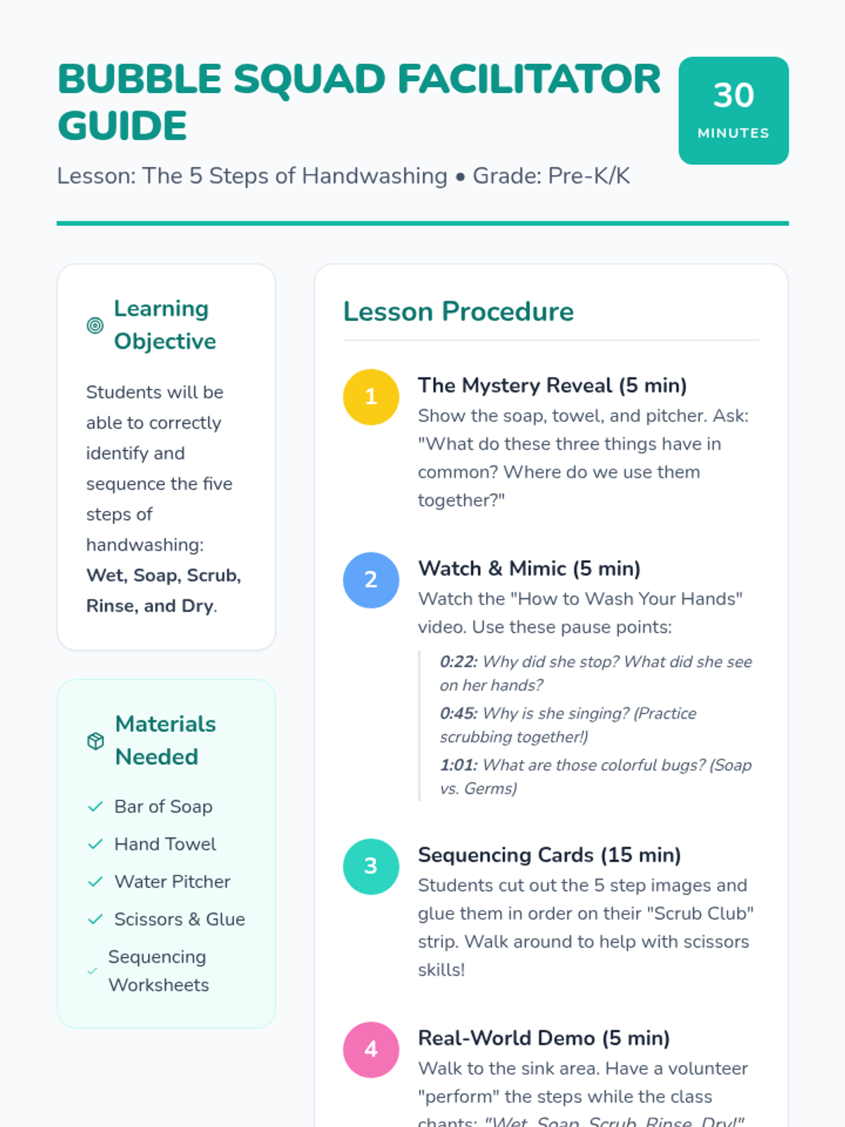 A fun, interactive lesson for Pre-K and Kindergarten students to learn the five essential steps of handwashing through a story-driven video and a hands-on sequencing activity.