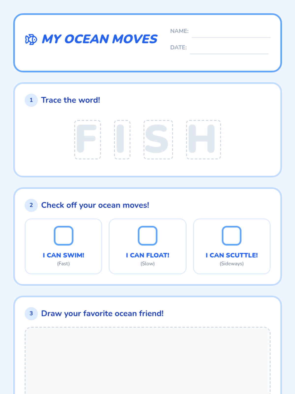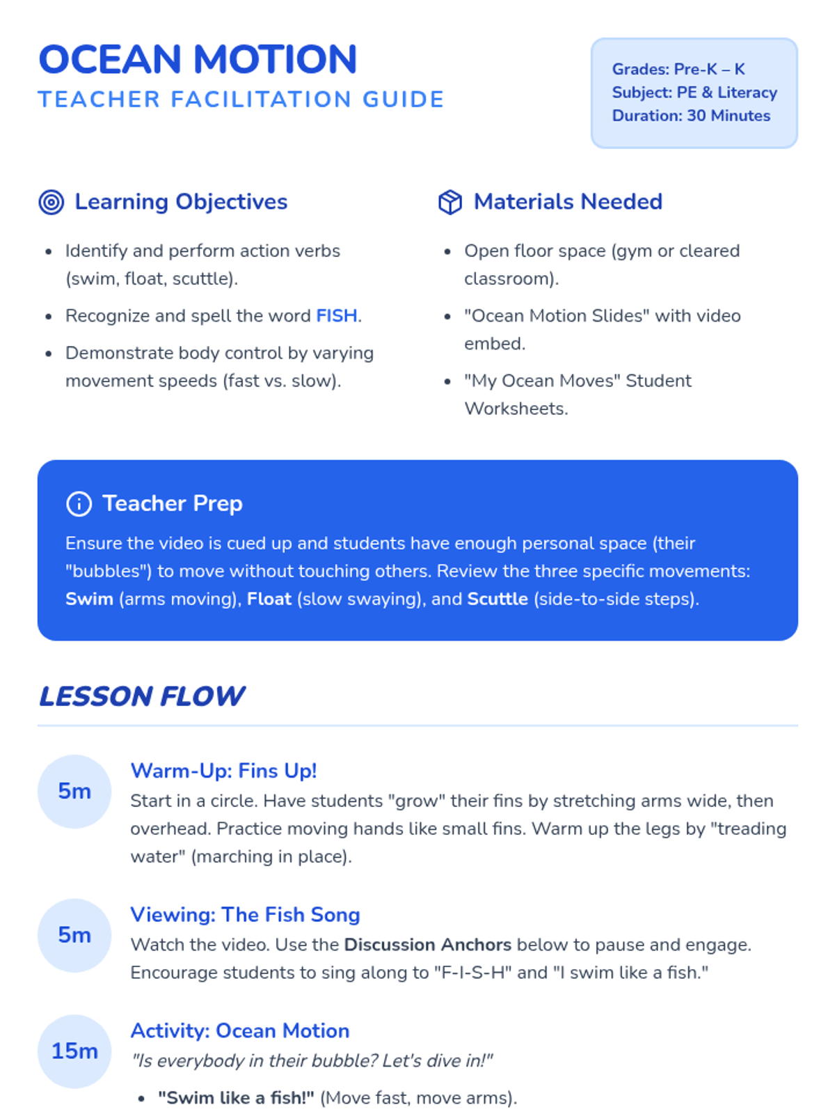 A high-energy movement lesson for Pre-K and Kindergarten students focusing on action verbs, spelling the word 'fish', and creative physical expression inspired by ocean life.