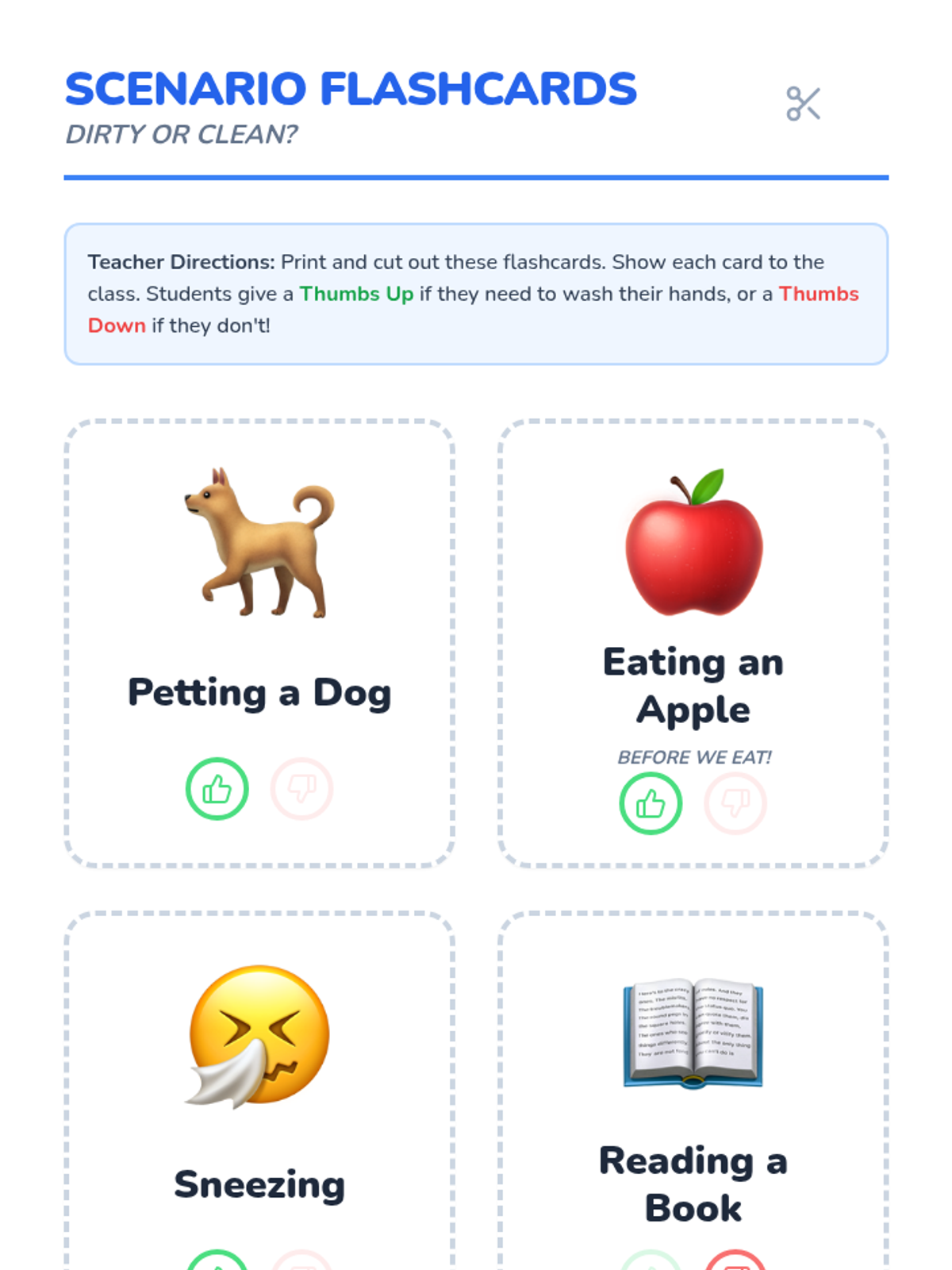 A fun, interactive lesson for Pre-K and Kindergarten students to identify the specific times they need to wash their hands to stay healthy.
