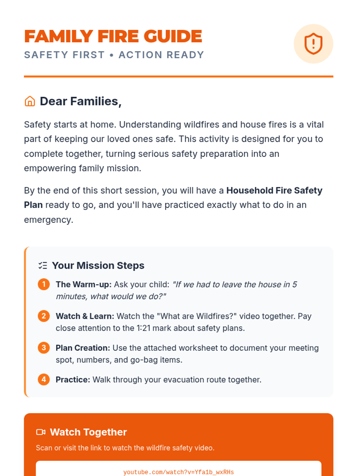 A comprehensive family-focused lesson designed to help households prepare for fire emergencies. It includes a warm-up discussion, a video exploration of wildfires, and the creation of a concrete safety plan and evacuation practice.