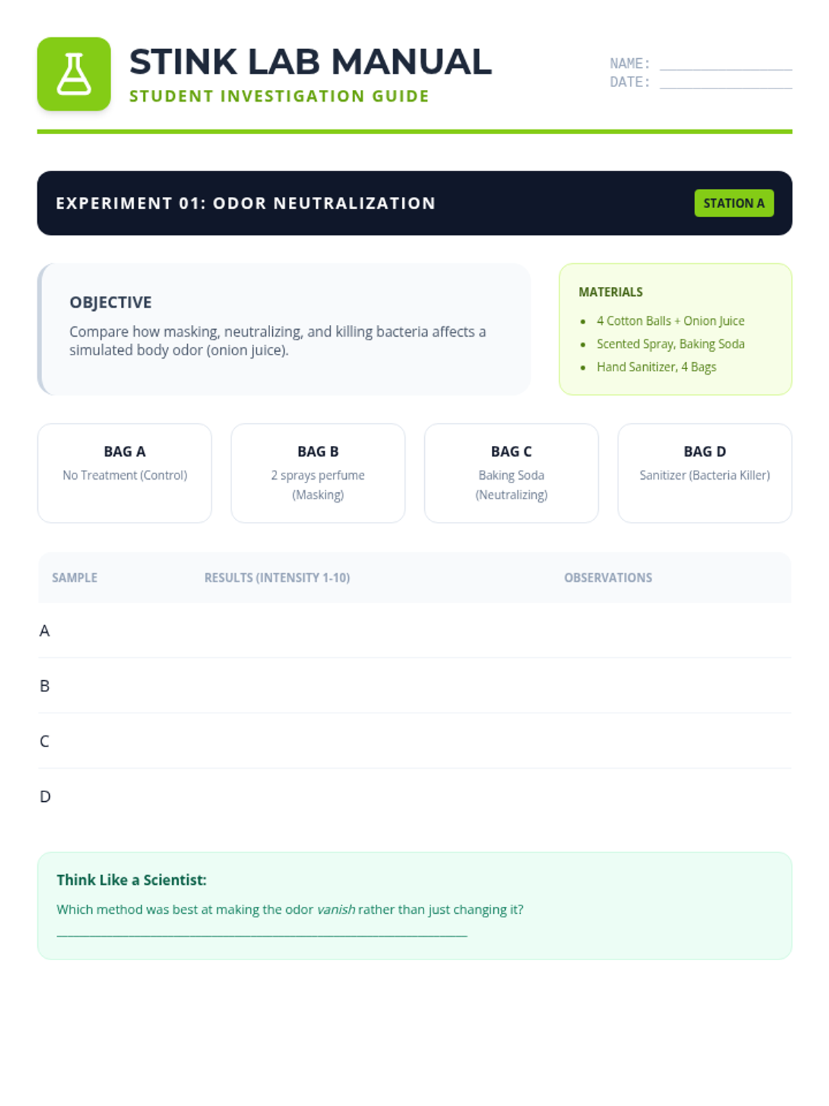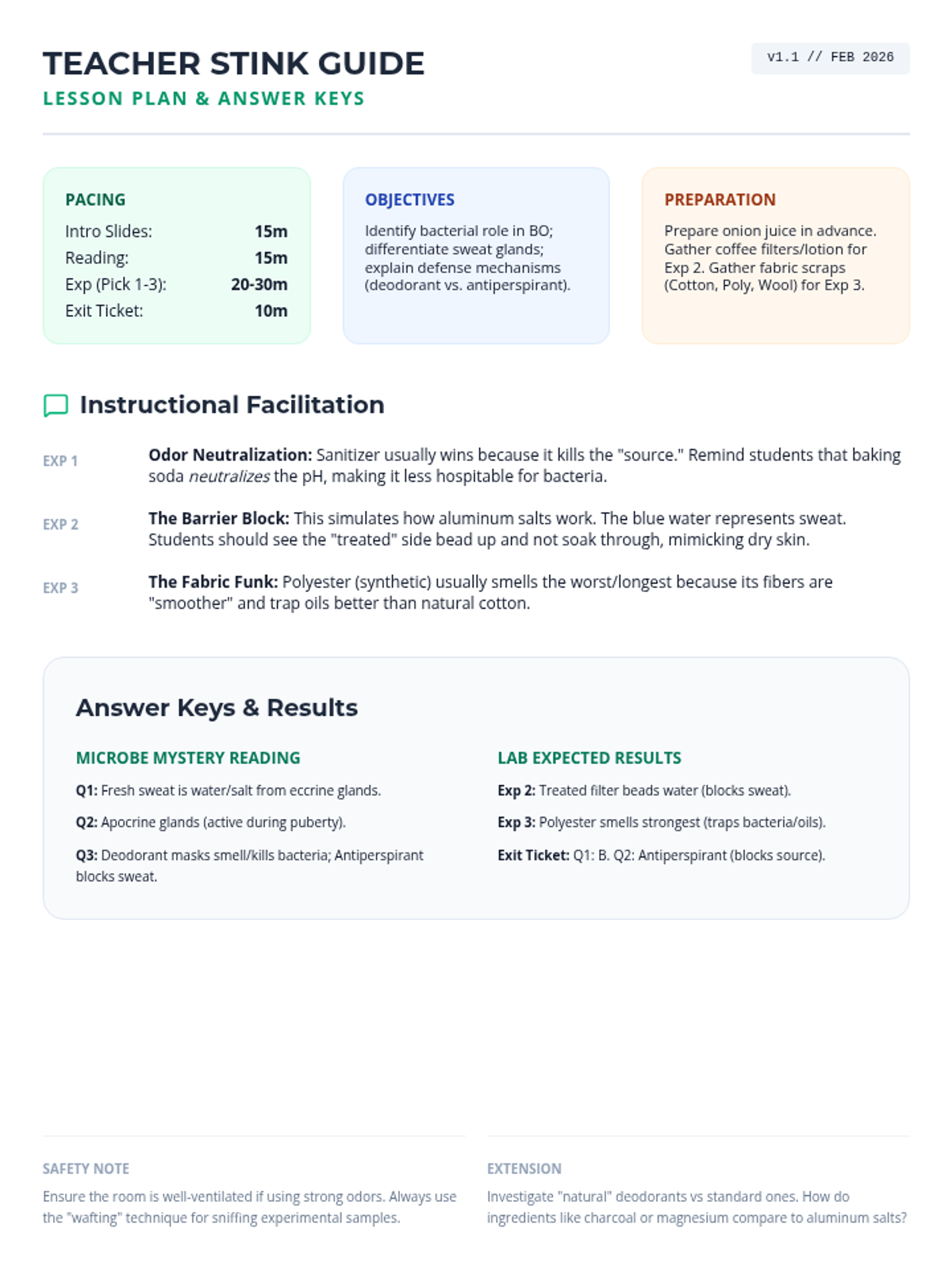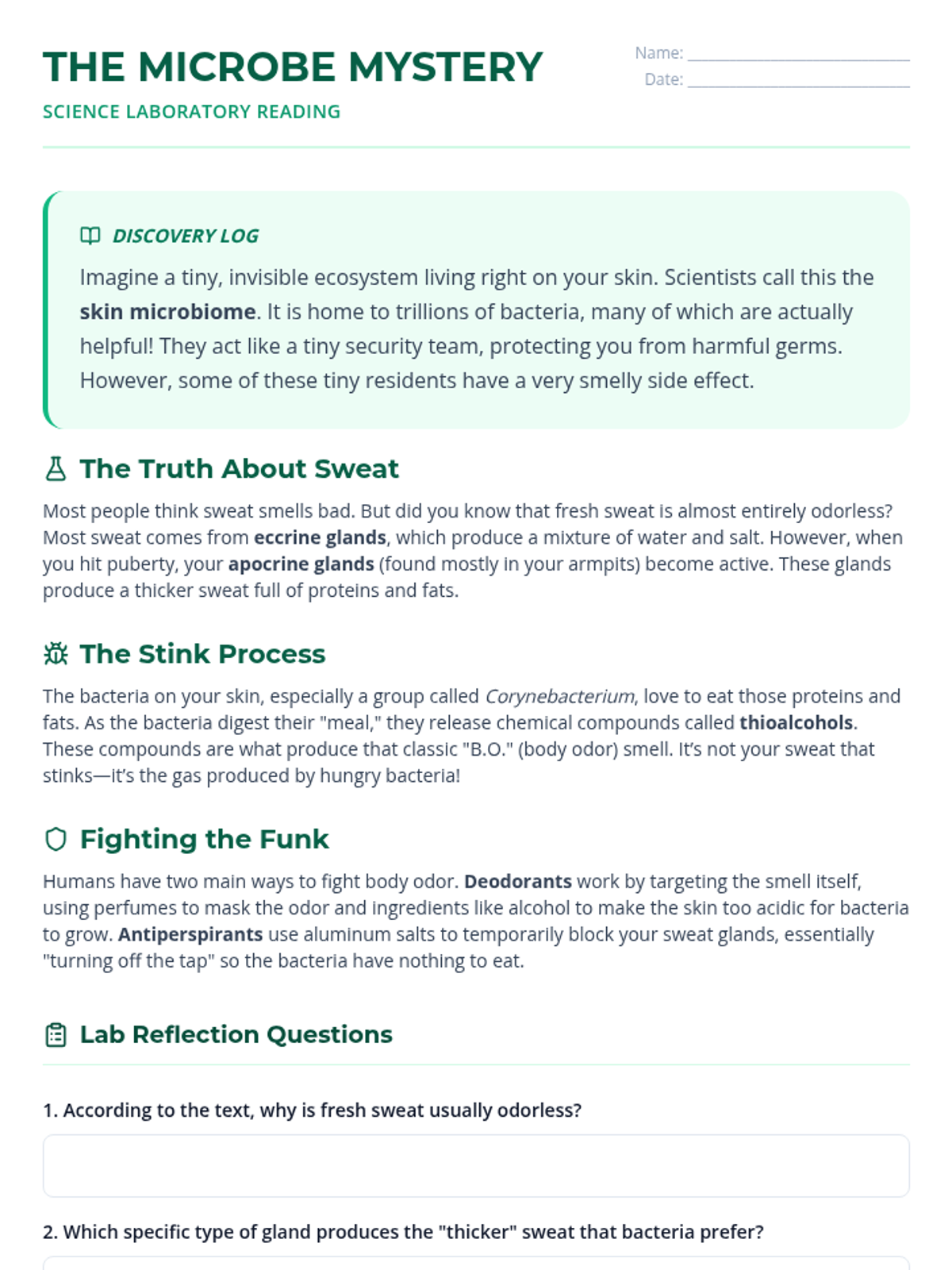 A comprehensive science lesson exploring the relationship between skin bacteria and body odor, explaining how deodorants and antiperspirants work to keep us fresh.