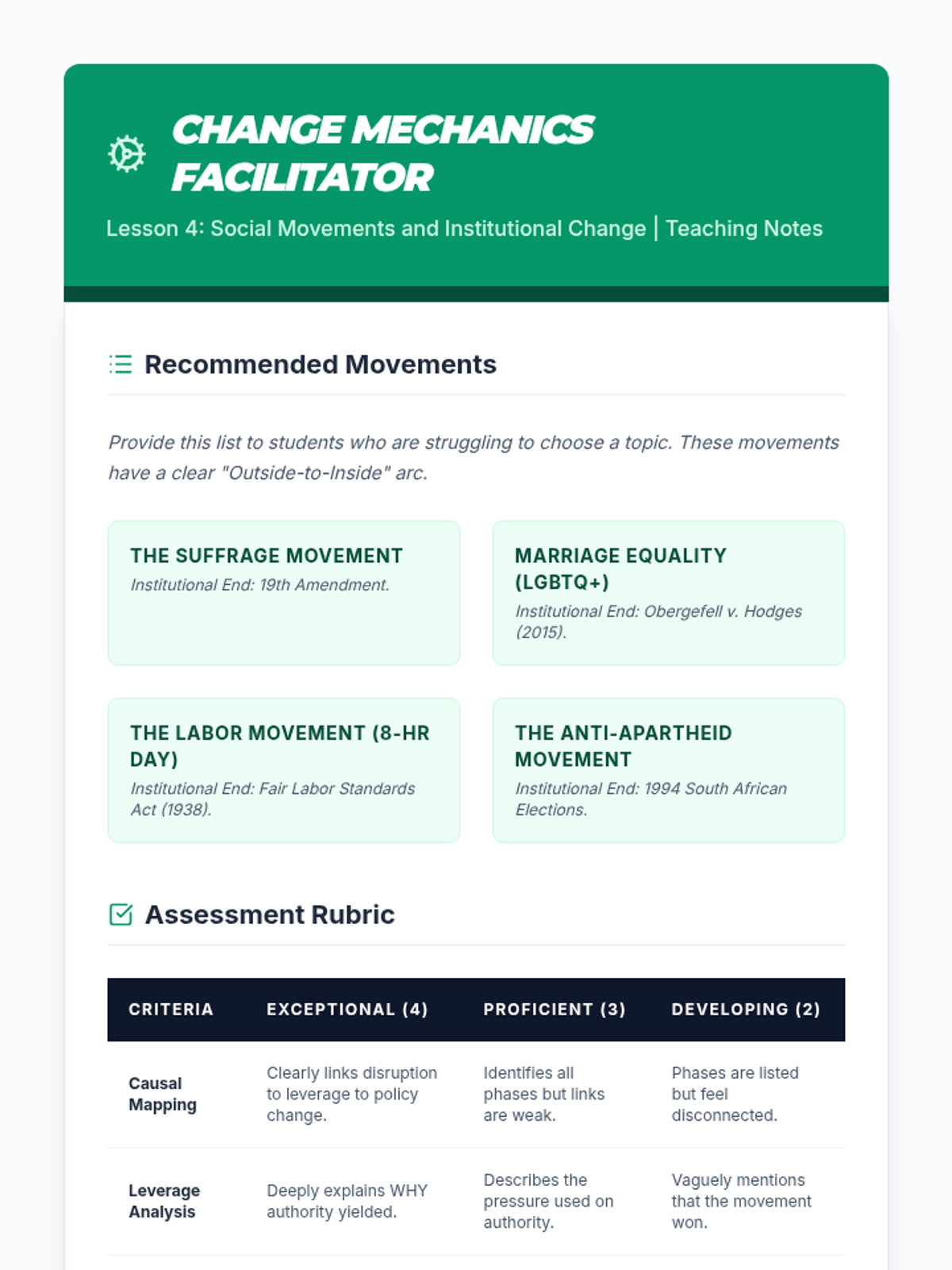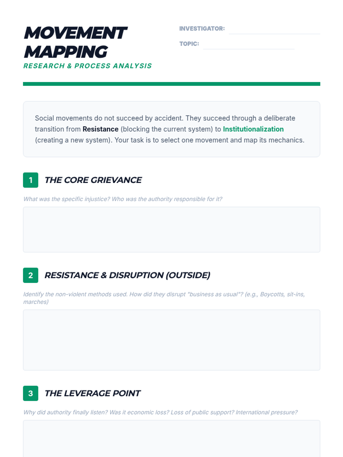 Students map the transition from grassroots protest to institutional policy change, researching the mechanics of successful social movements.