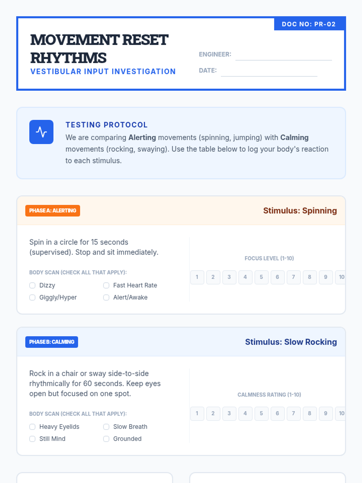 Students investigate how movement affects arousal, distinguishing between alerting and calming vestibular input to find their reset rhythm.