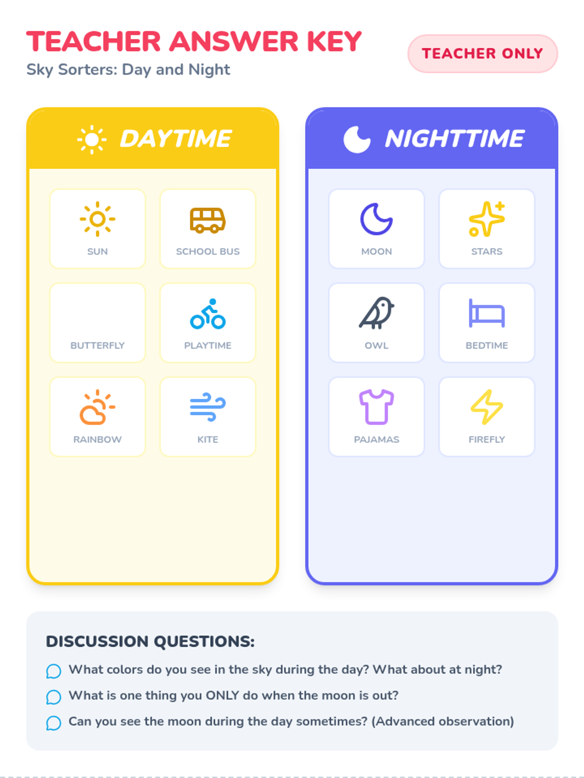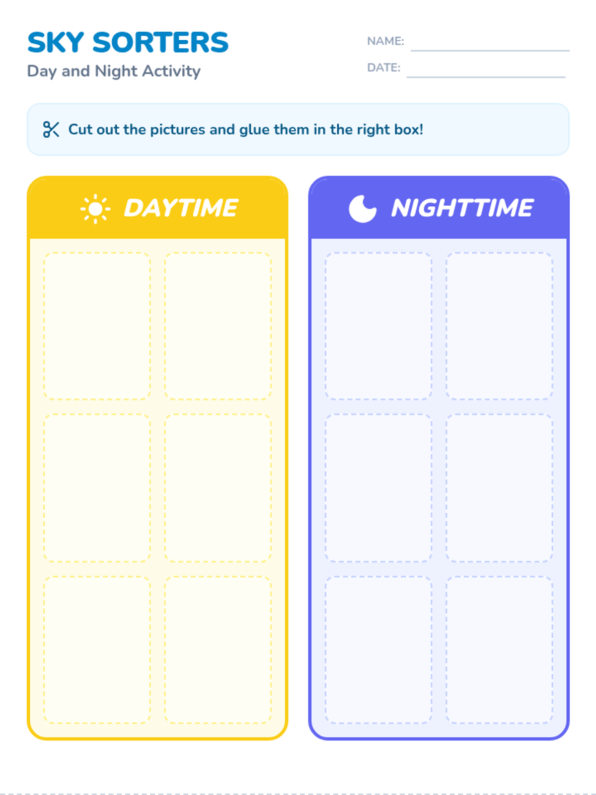 A Pre-K lesson focused on identifying and categorizing objects and activities associated with daytime and nighttime. Students will develop fine motor skills through cutting and pasting while building early science and observation skills.