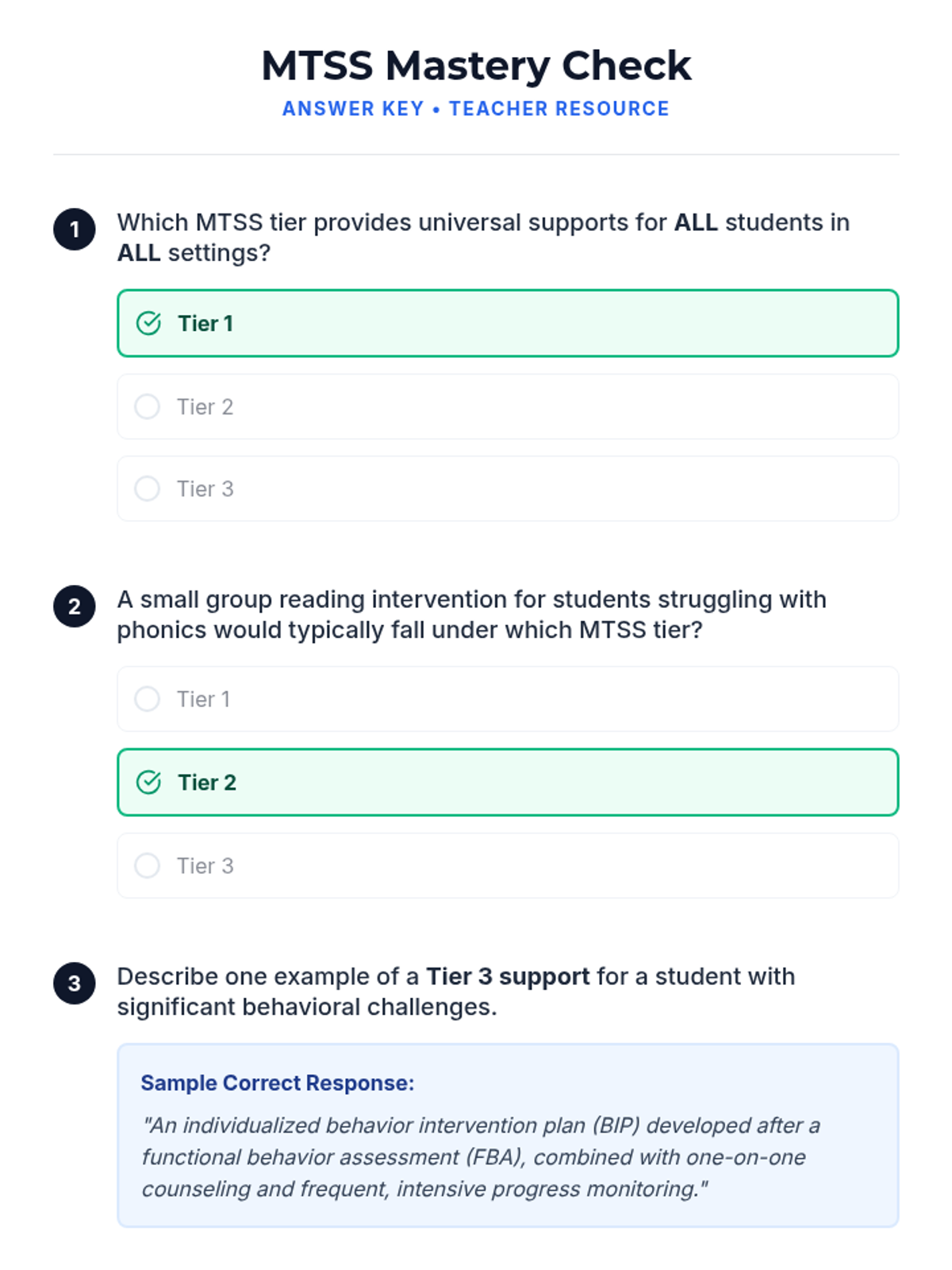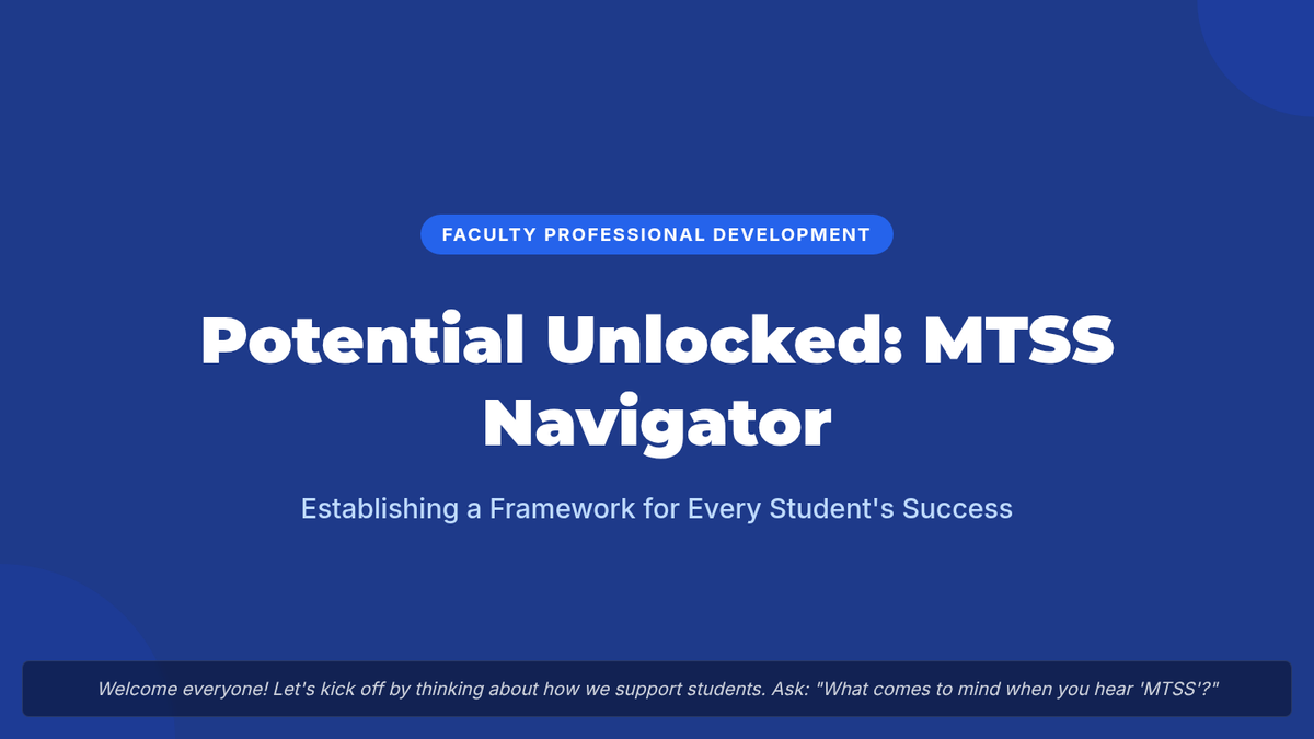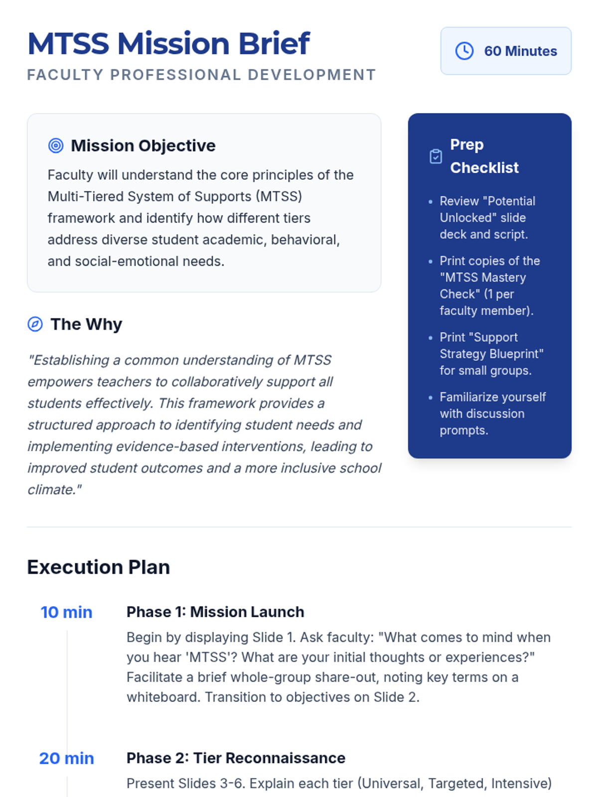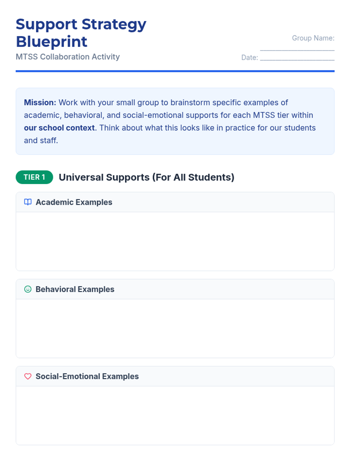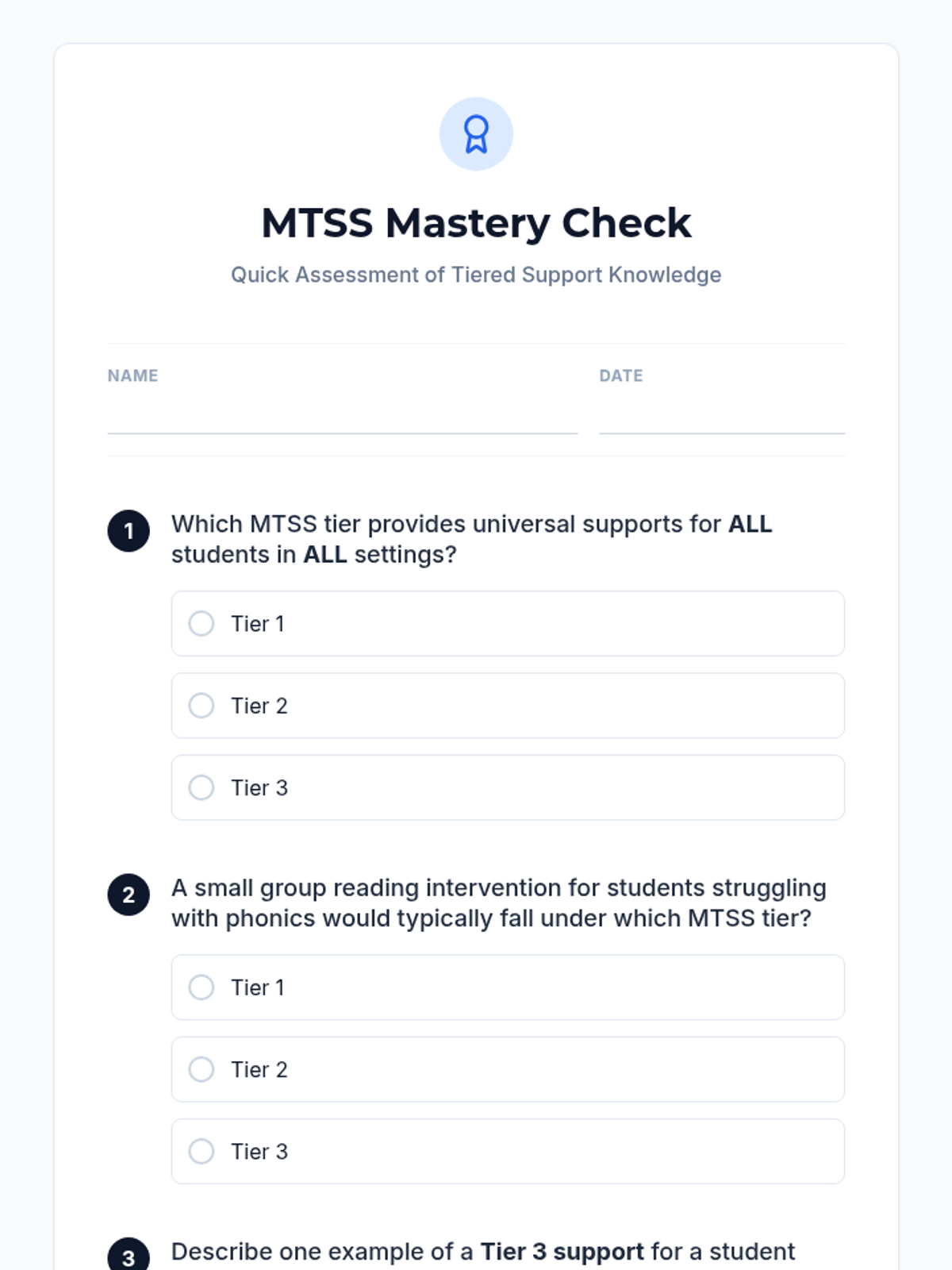 A professional development lesson for K-12 faculty introducing the Multi-Tiered System of Supports (MTSS) framework. Educators will learn to differentiate between Tier 1, 2, and 3 interventions and brainstorm practical applications for their school context.
