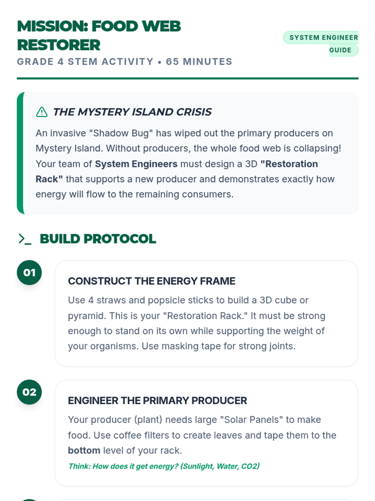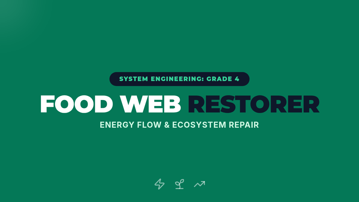 Students design and build 'Food Web Restoration' models to visualize and explain the flow of energy from producers to multiple consumers on Mystery Island.