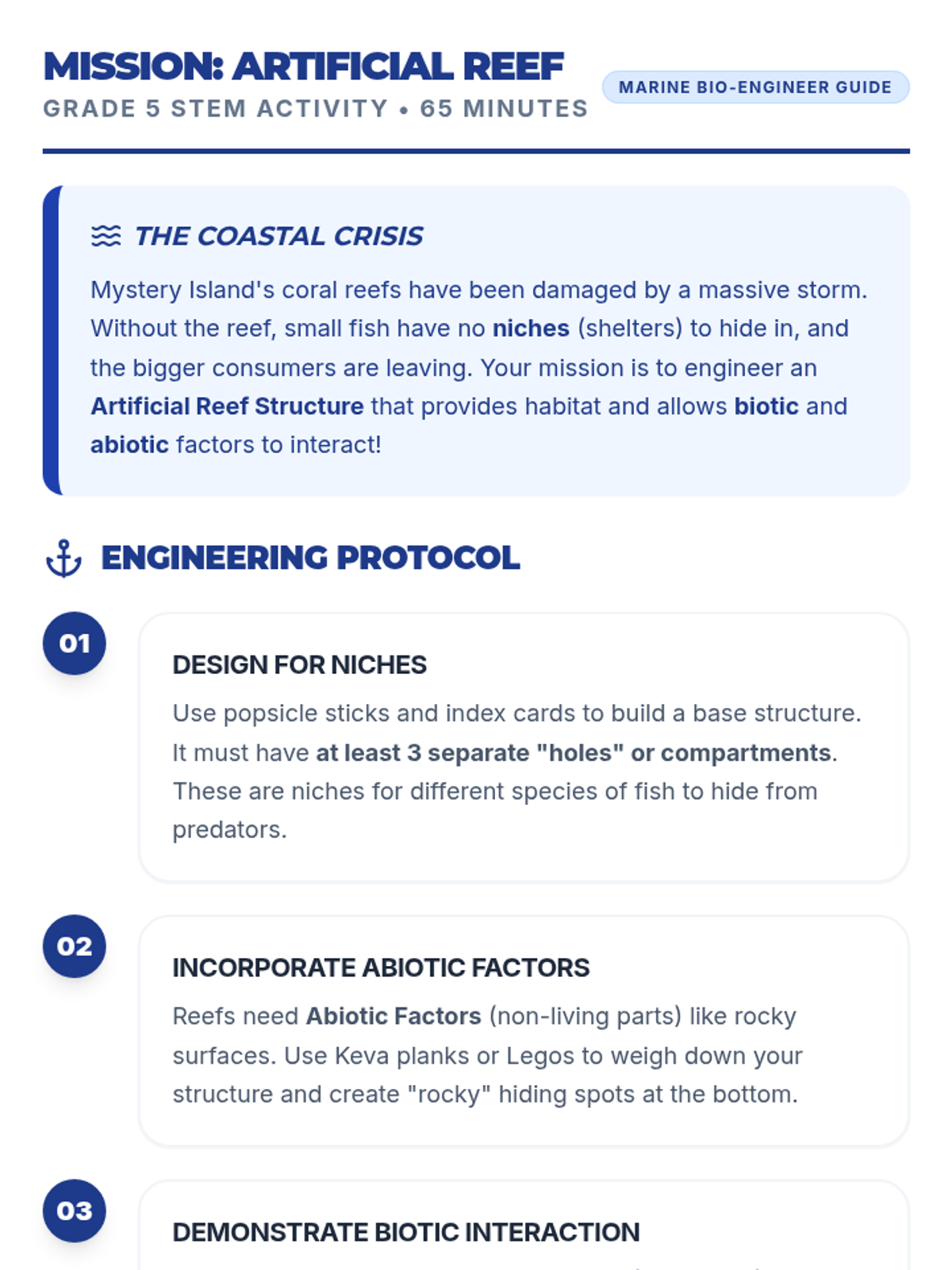 Students act as 'Marine Bio-Engineers' to design and build artificial reef structures that support a healthy ecosystem on Mystery Island's coast, focusing on biotic and abiotic interactions.