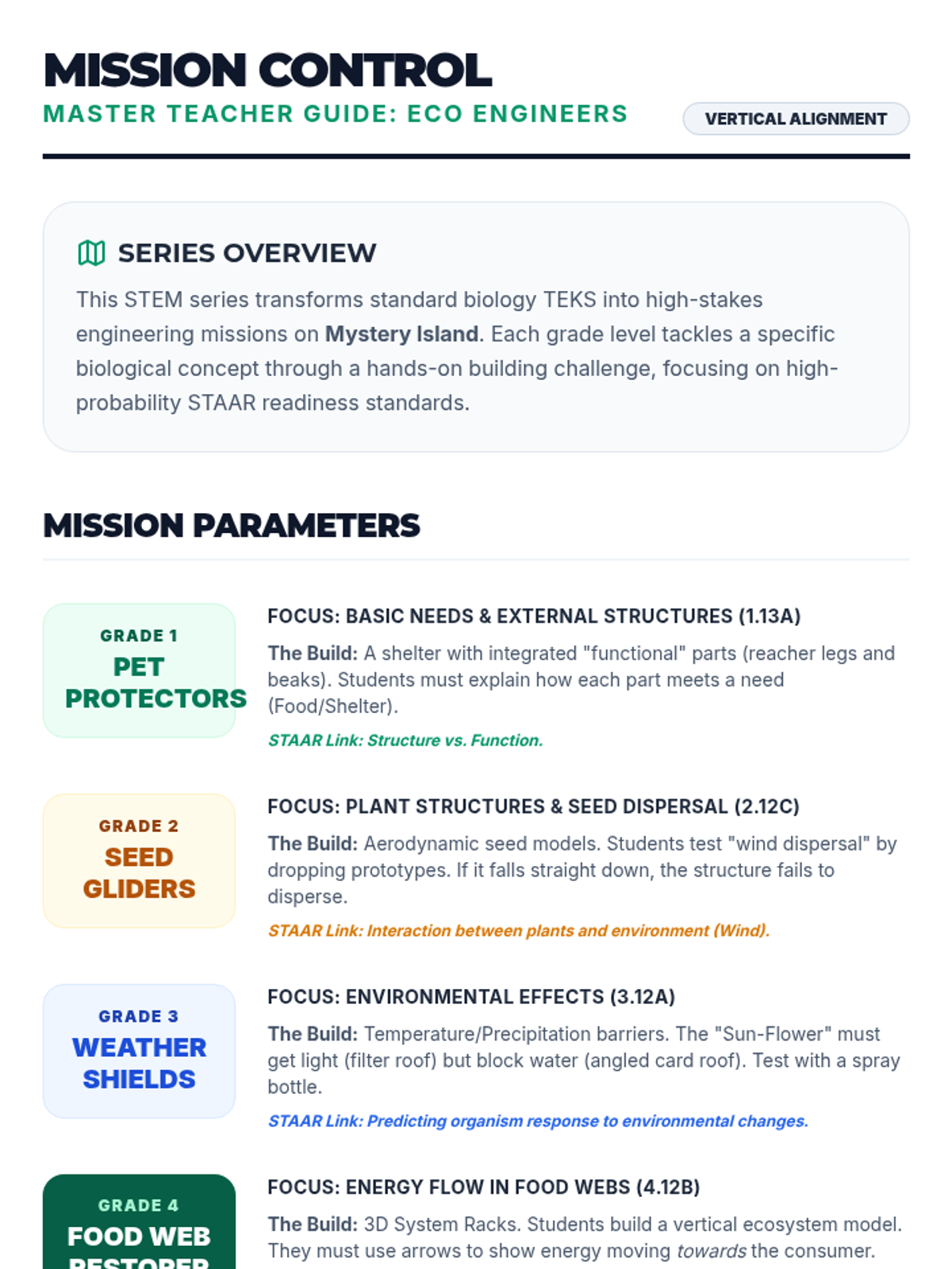 Students act as 'Botanical Engineers' to design and build seed models that can travel through the air to reach new parts of Mystery Island, focusing on seed dispersal methods.