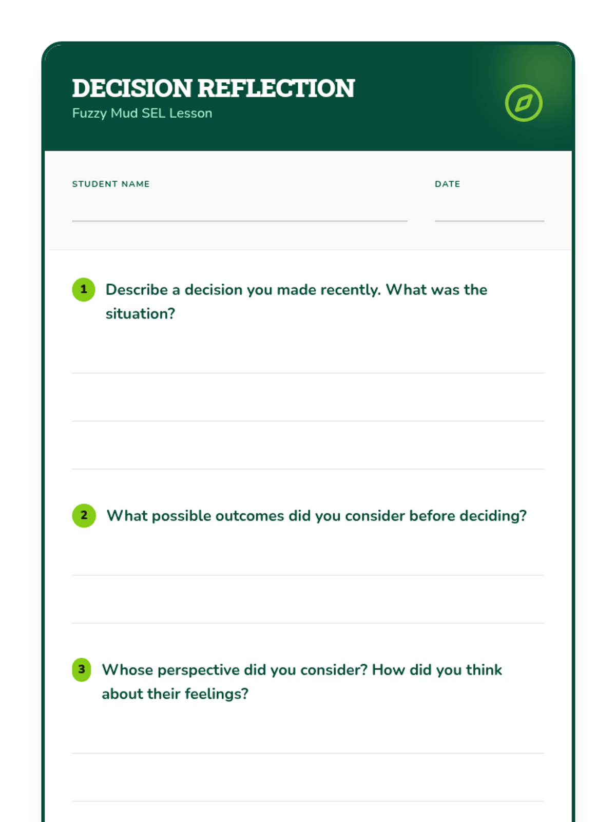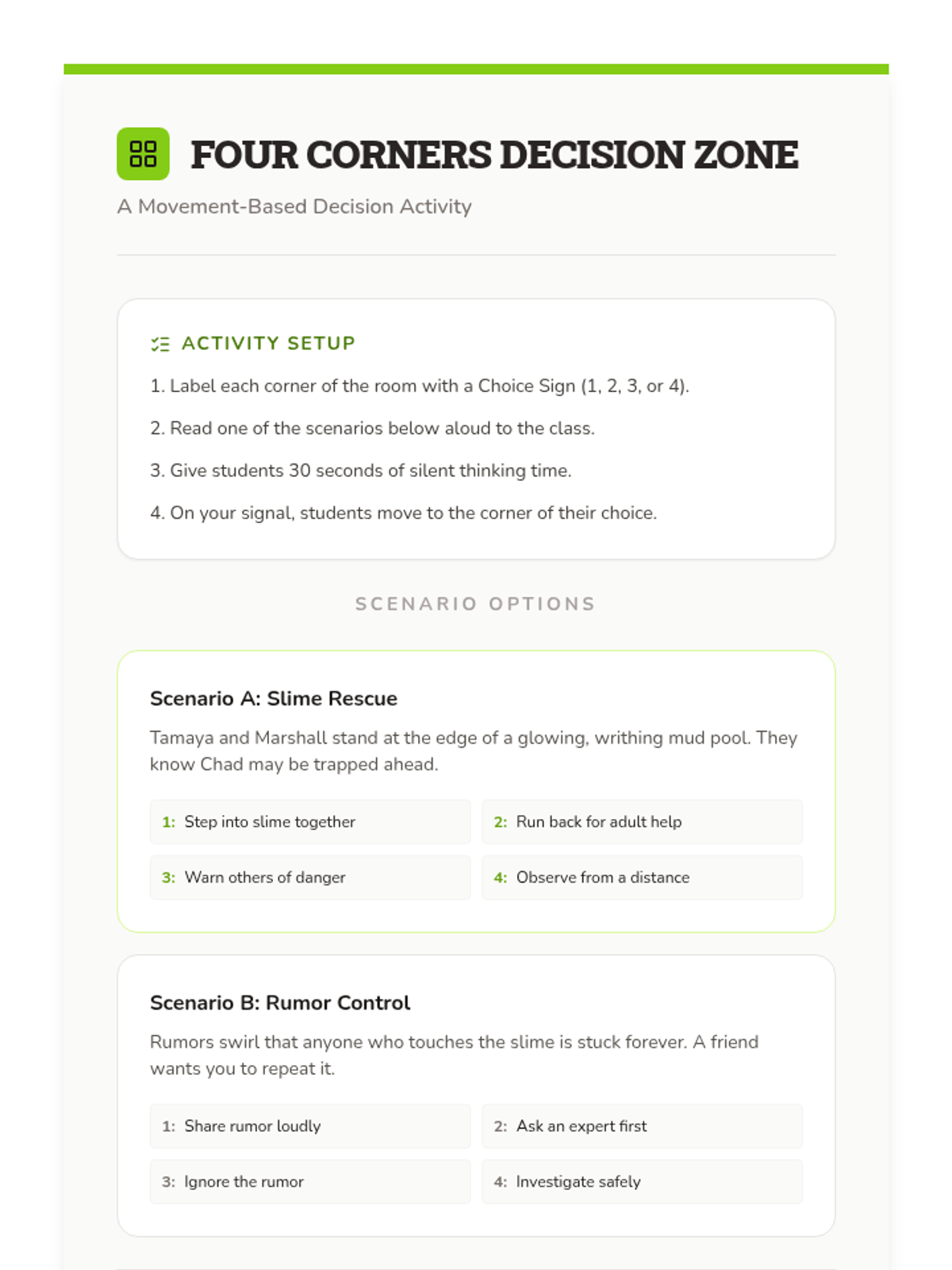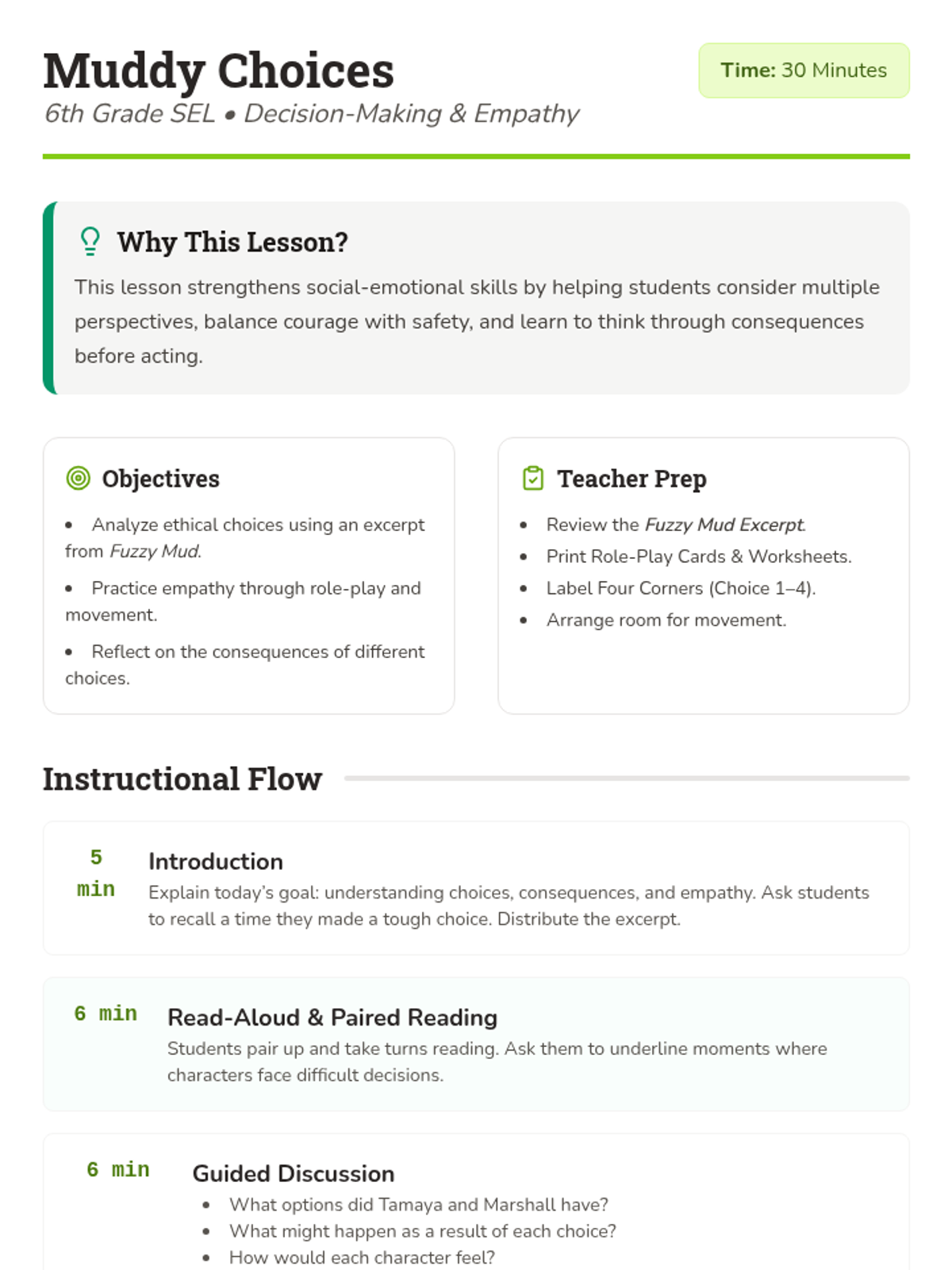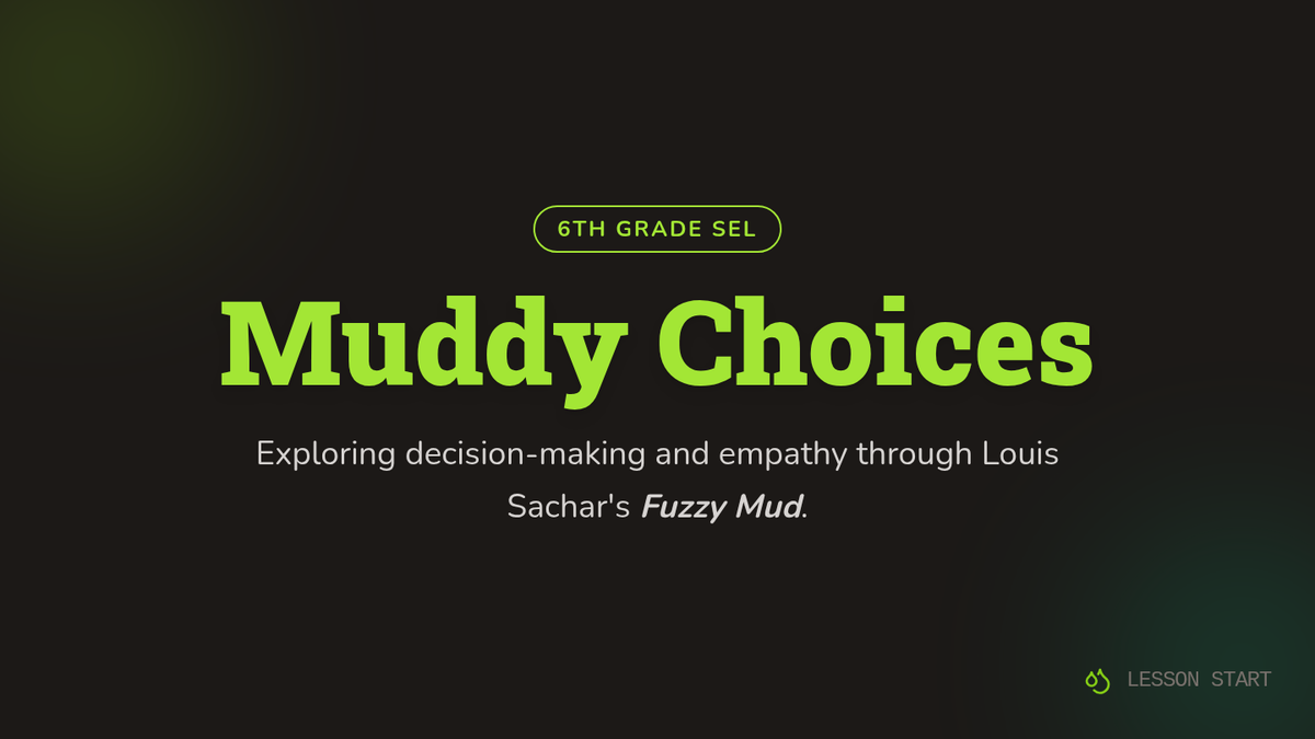 In this 30-minute SEL lesson, 6th graders explore decision-making, empathy, and ethical choices through an excerpt from Louis Sachar’s Fuzzy Mud. Students engage in role-play, a movement-based decision activity, and individual reflection to understand the impact of their choices on others.