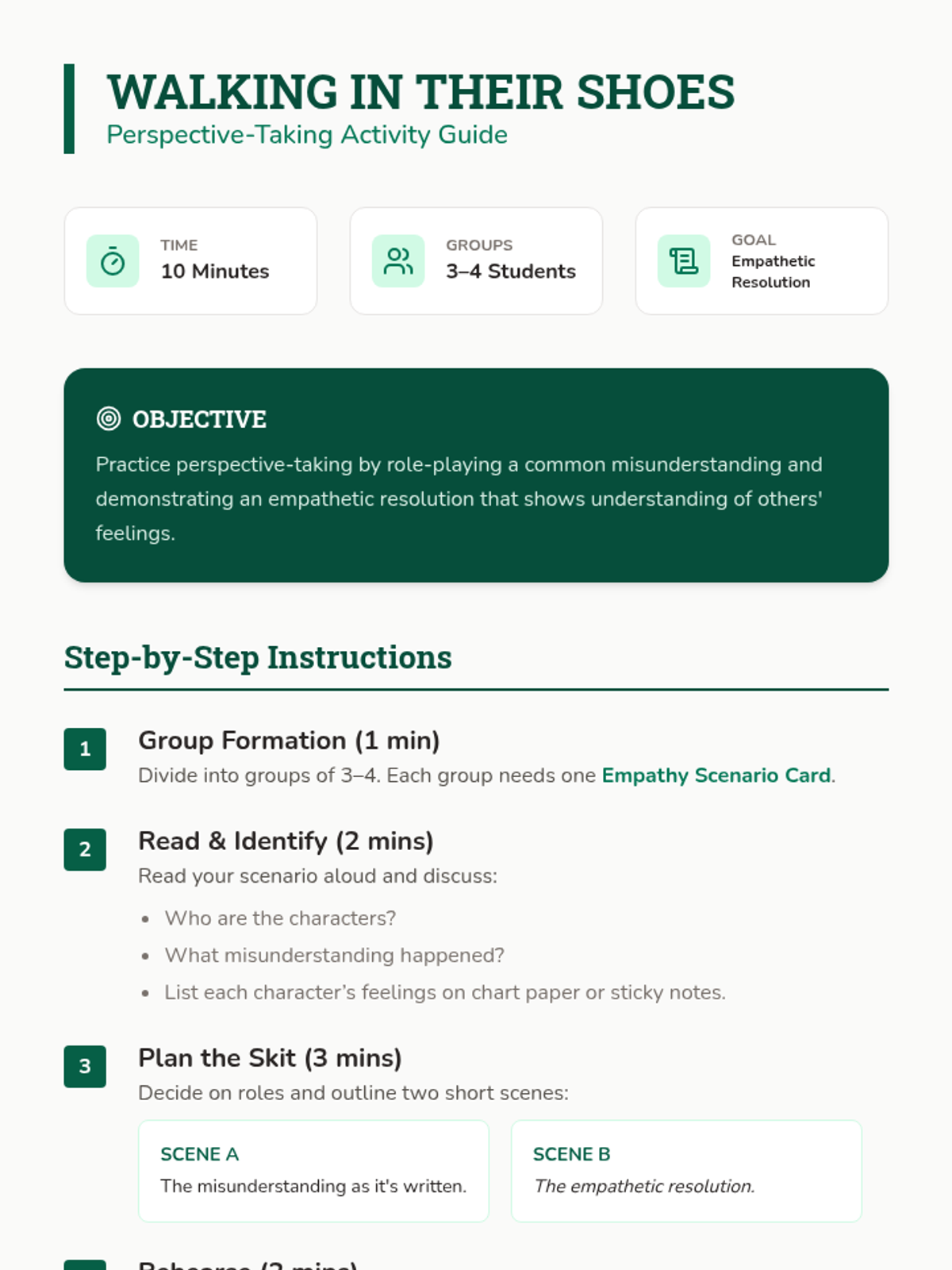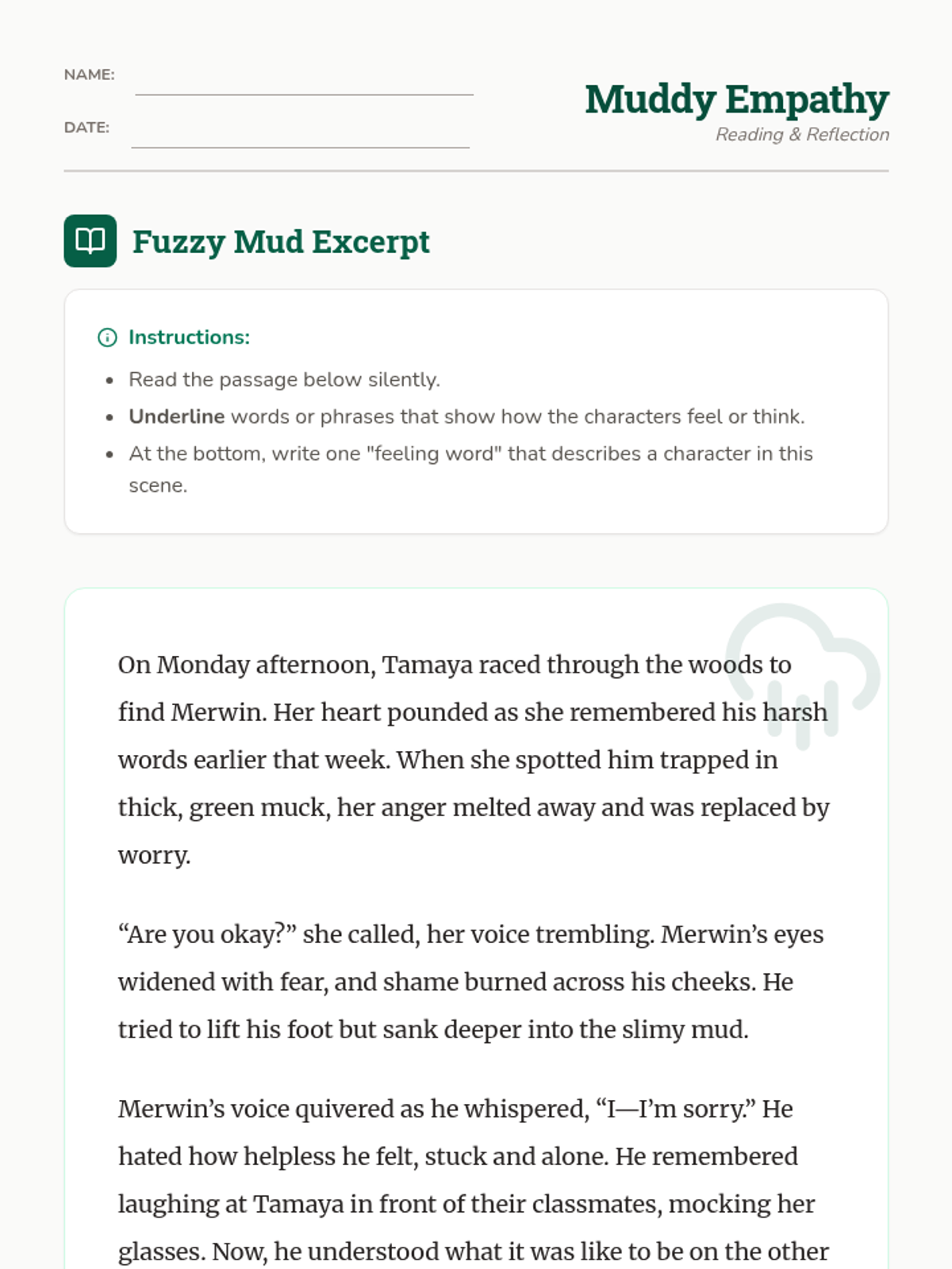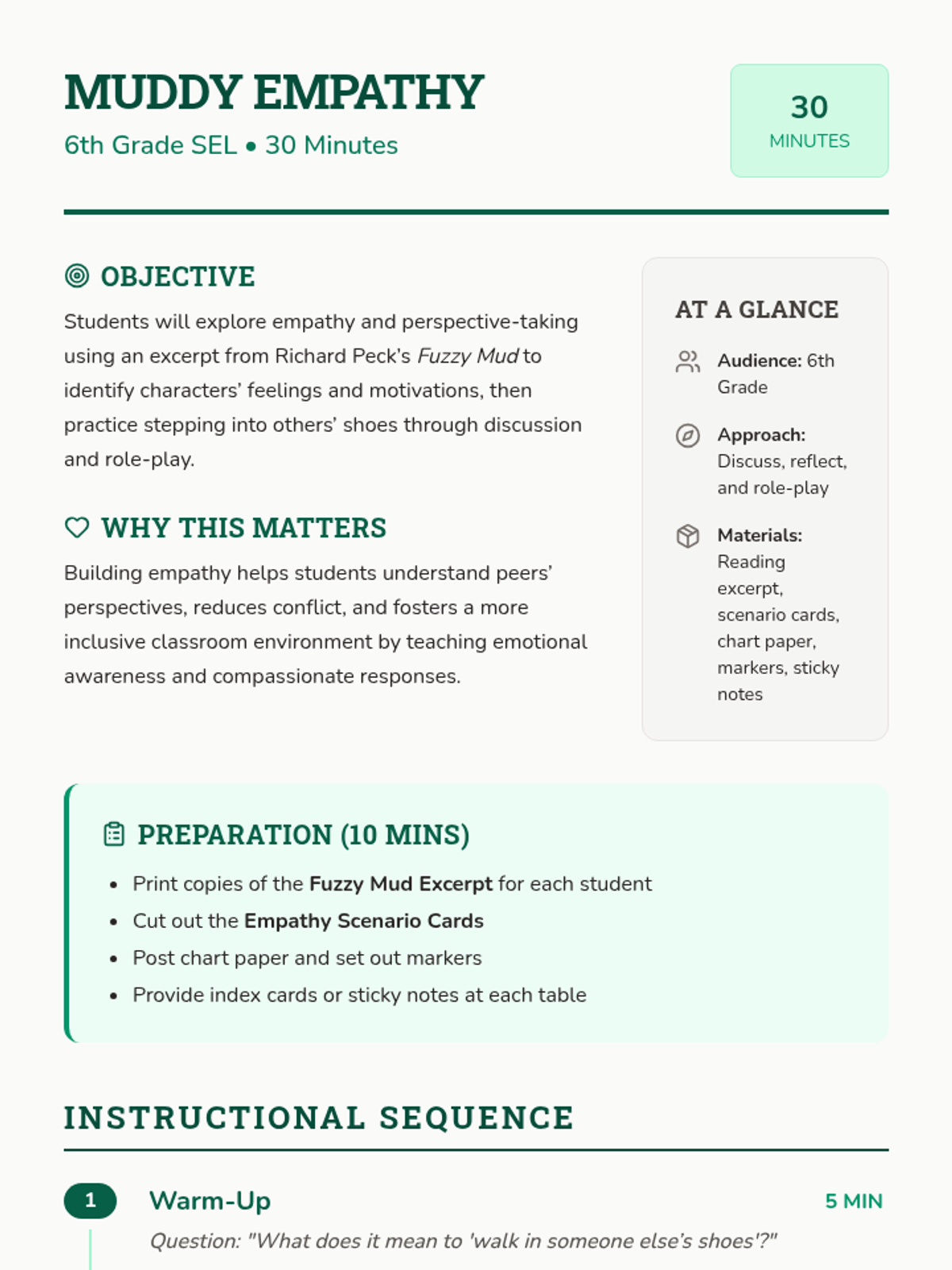 A 30-minute SEL lesson for 6th graders exploring empathy and perspective-taking using an excerpt from Richard Peck's Fuzzy Mud. Students engage in discussion and role-play to practice stepping into others' shoes.