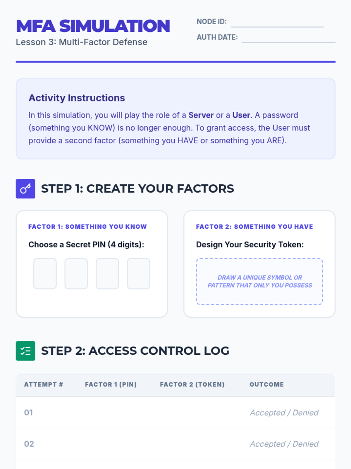 Students learn the principles of multi-factor authentication through simulations, understanding why multiple layers of defense are necessary.