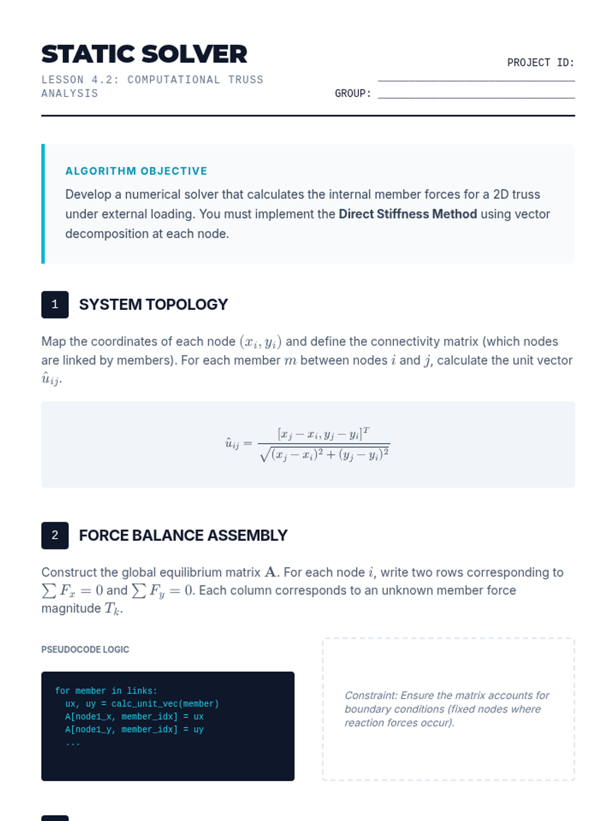 Developing numerical methods for summing and resolving complex multi-force systems. Students design algorithms for static and dynamic equilibrium analysis.