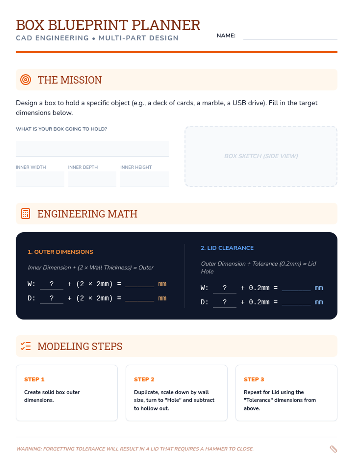 A project-based lesson where students design a box and lid, applying their knowledge of wall thickness and fit.