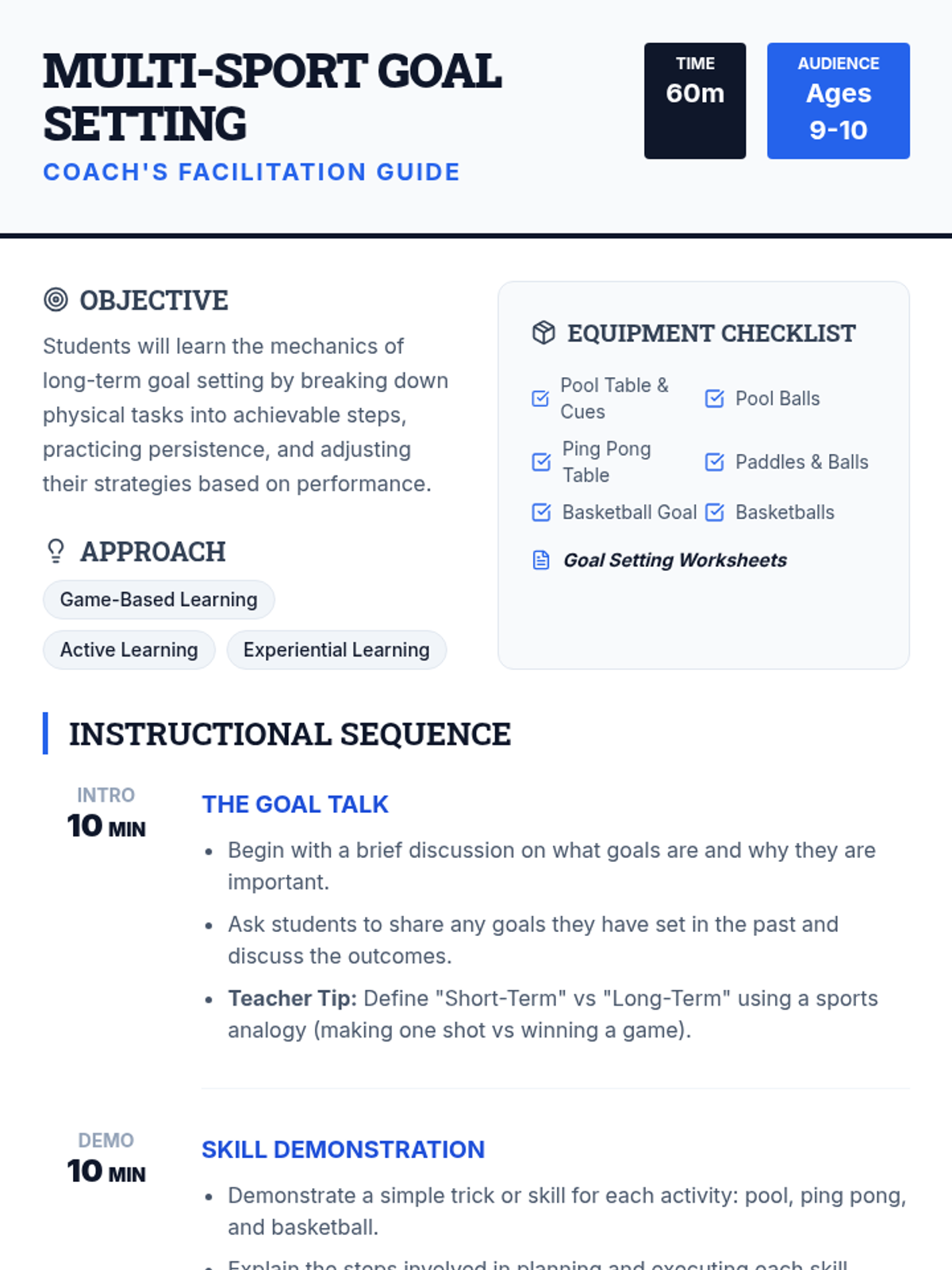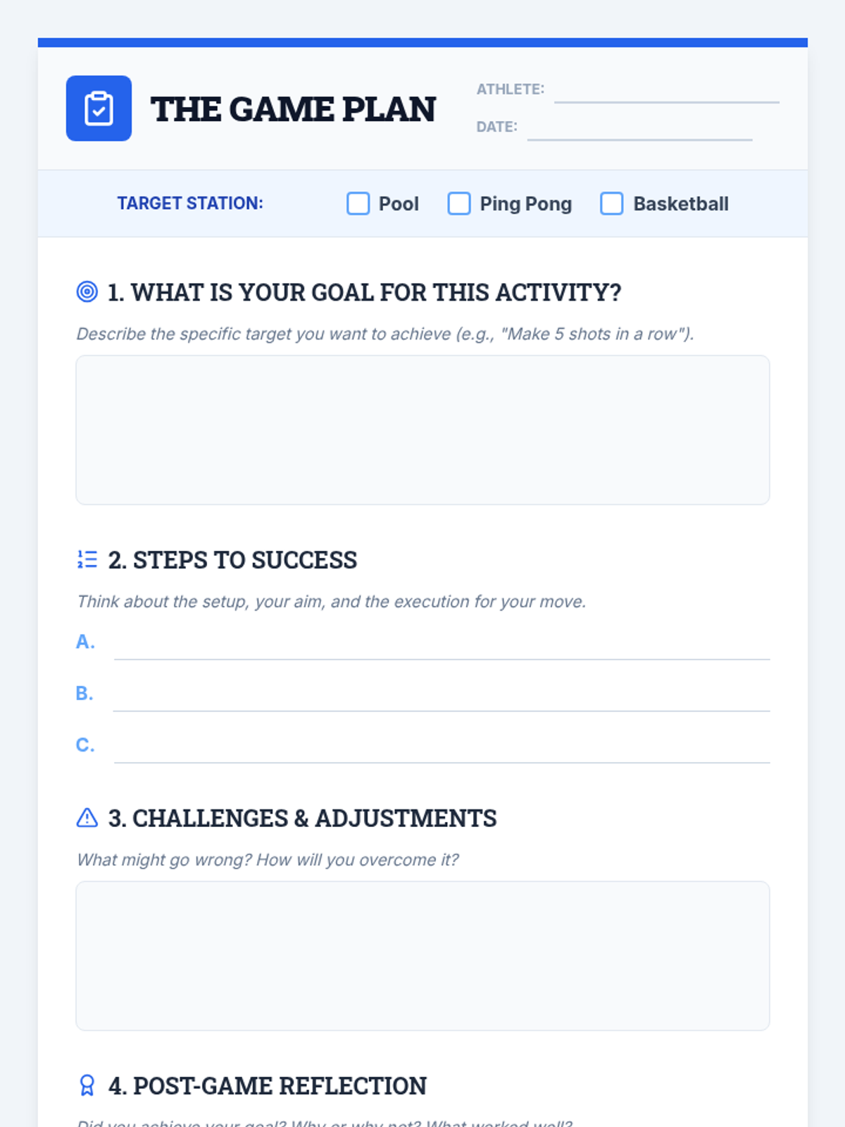A high-energy lesson where students practice long-term goal setting and strategic planning through rotations of pool, ping pong, and basketball.