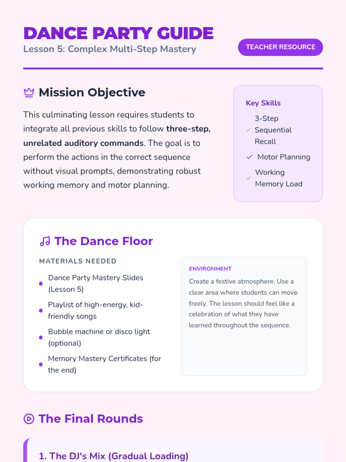 In this culminating lesson, students combine unrelated actions into a three-step sequence. The focus is on retaining the full auditory chain without visual prompts through a high-energy dance party theme.
