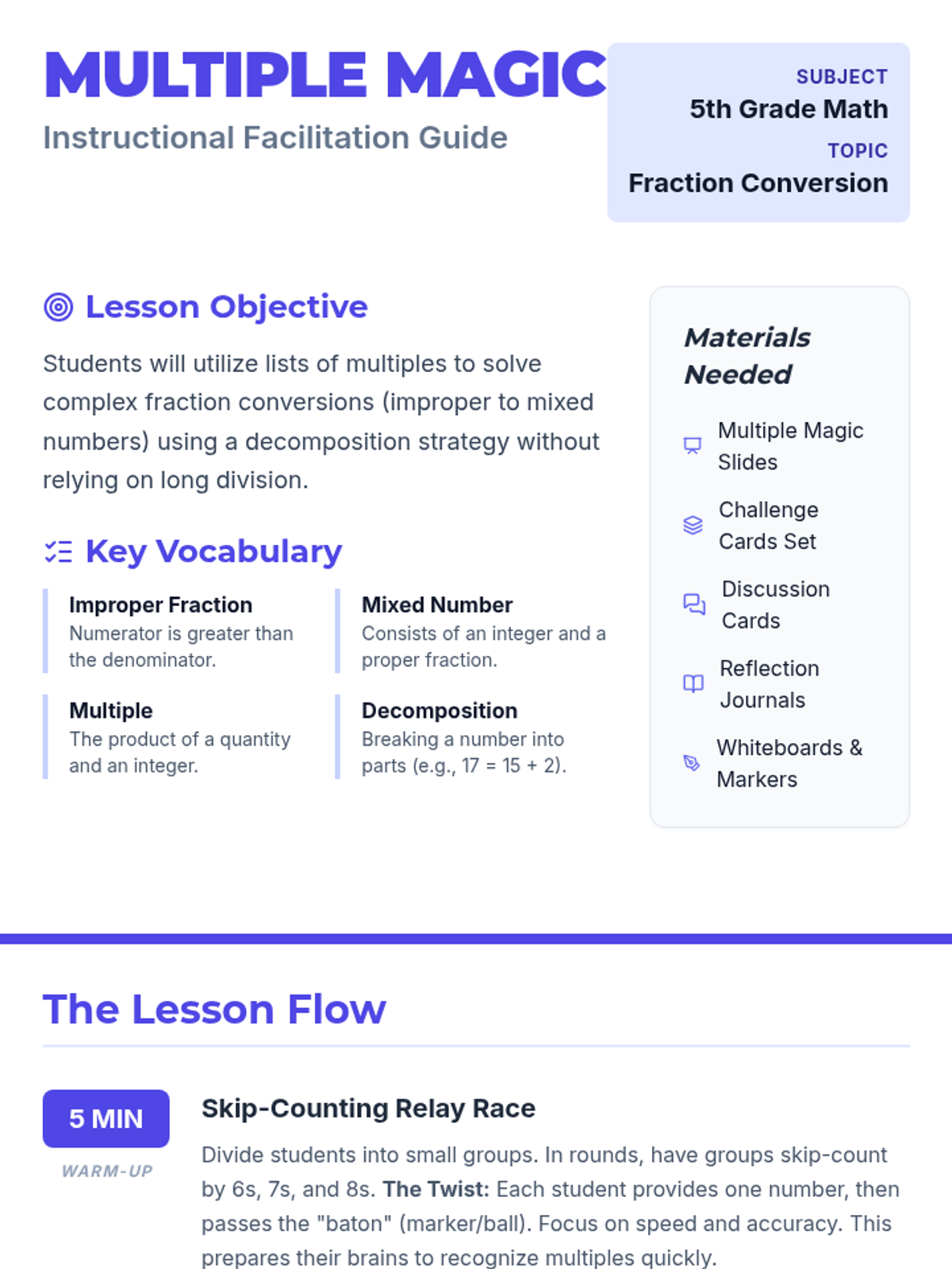 A 5th-grade lesson focusing on converting improper fractions to mixed numbers by identifying the highest multiple of the denominator less than the numerator, using a systematic listing strategy.