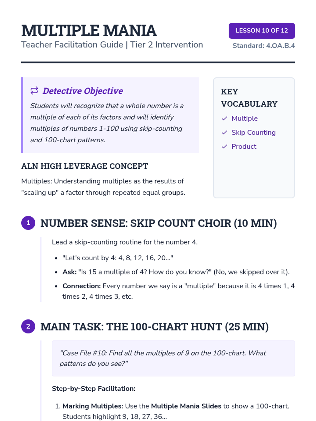 Discovering multiples through skip counting and 100-chart patterns, identifying common multiples.