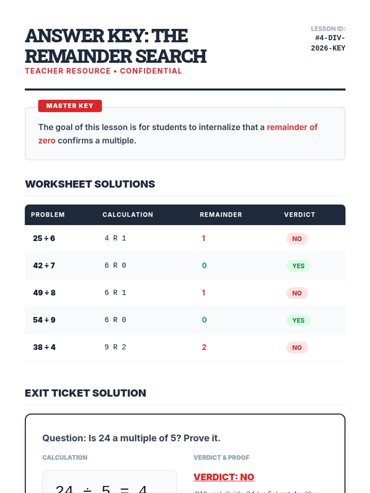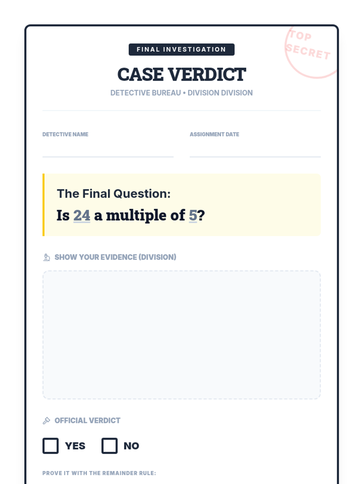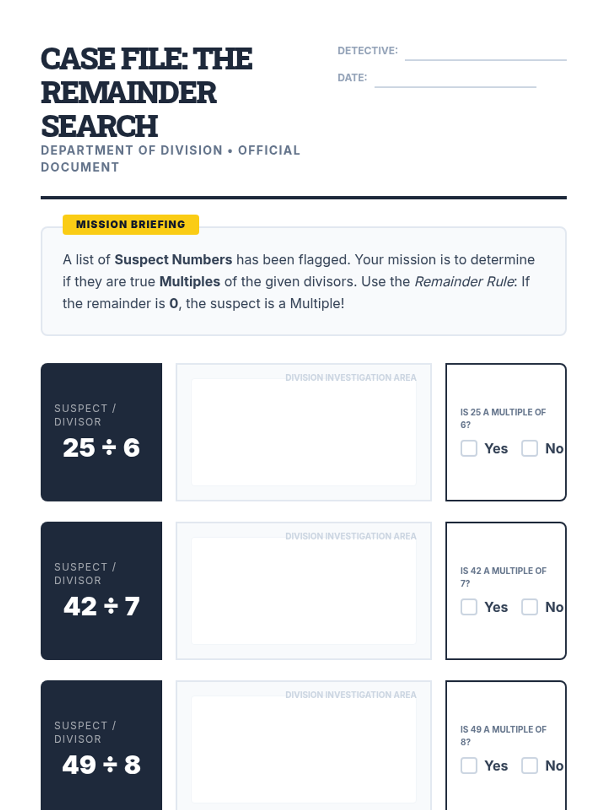 Students become 'Remainder Detectives' as they use division to investigate whether two-digit numbers are multiples of one-digit divisors by looking for remainders.