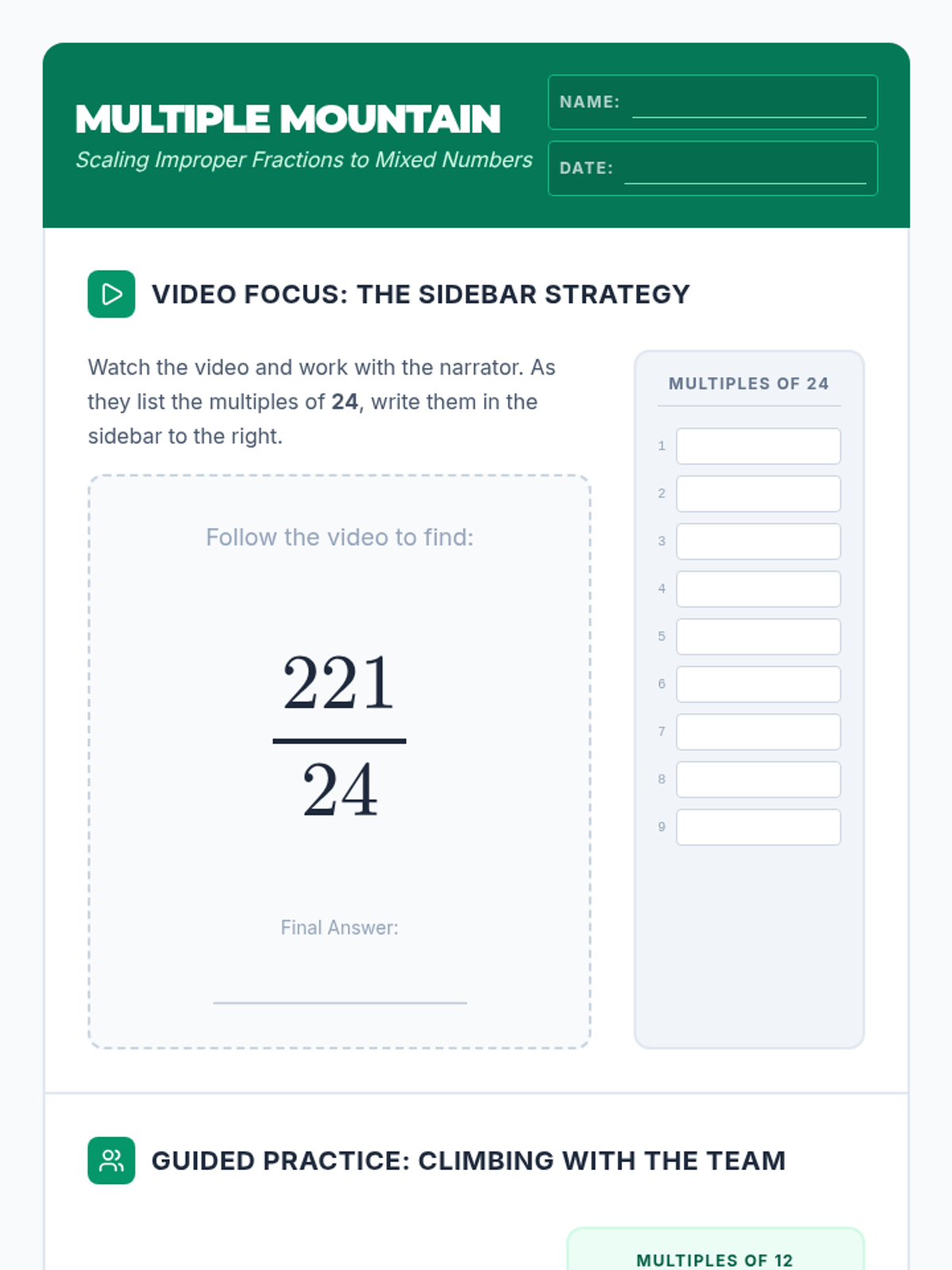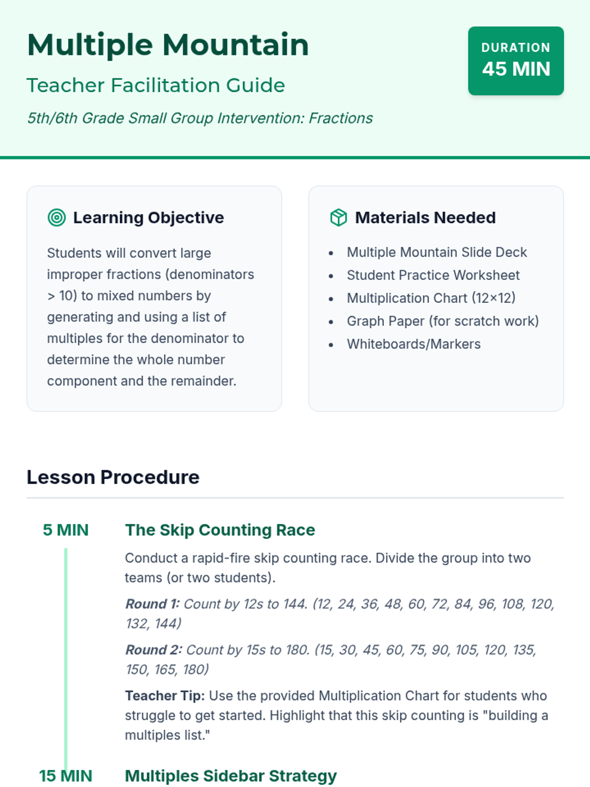 A small-group intervention lesson focused on converting large improper fractions to mixed numbers by creating systematic lists of multiples for the denominator.