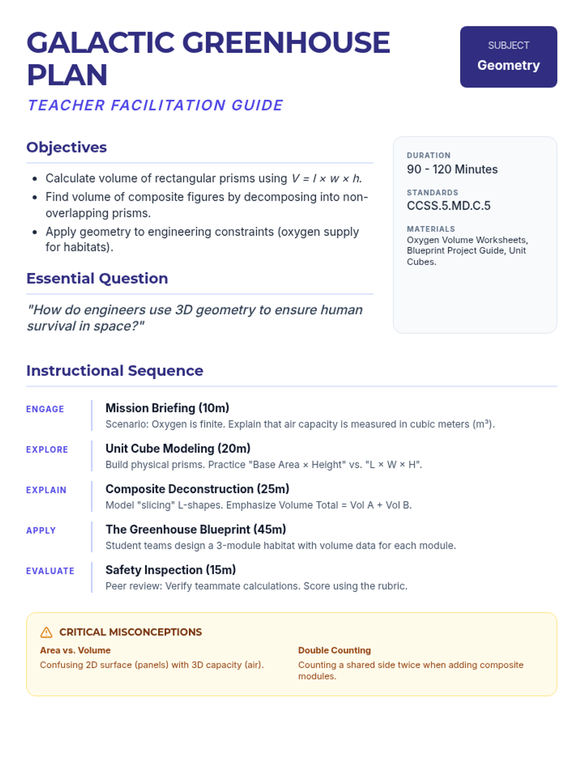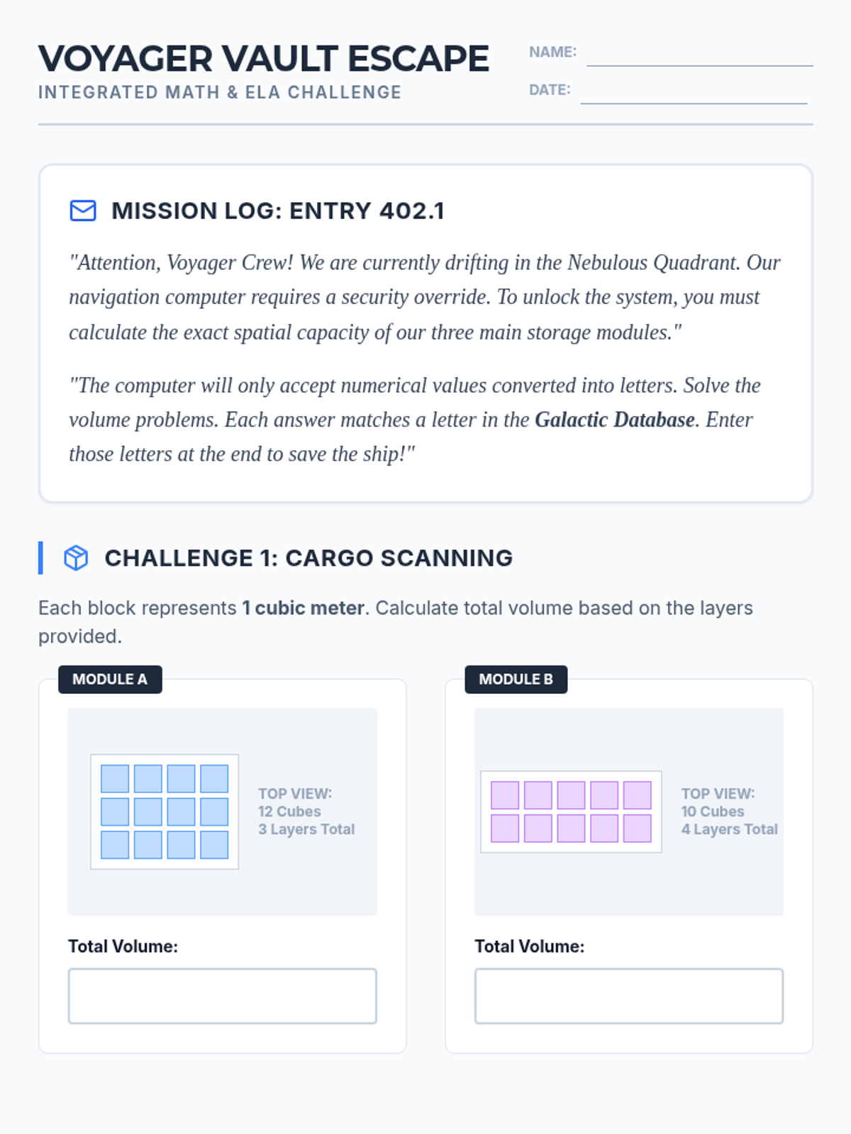 A 5th-grade integrated lesson where students solve volume-based math challenges within a space-themed narrative to unlock a starship's navigation system. Students apply math formulas and reading comprehension skills to crack the code and save the mission.