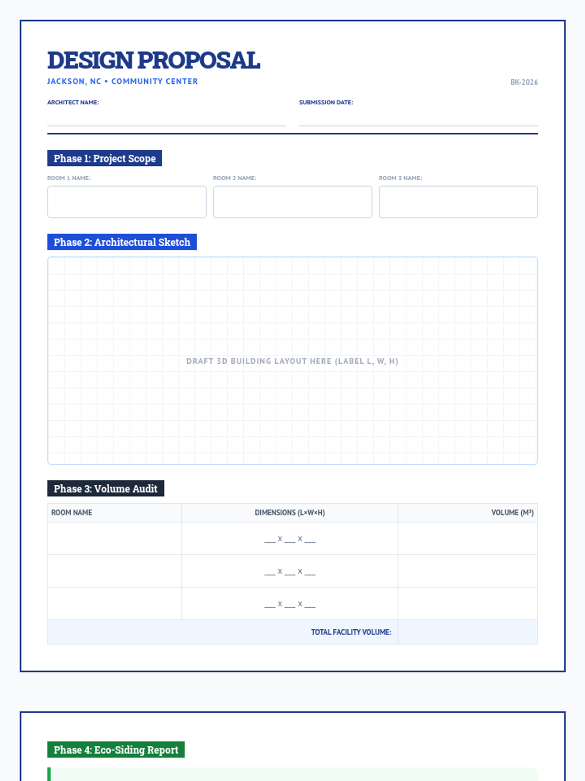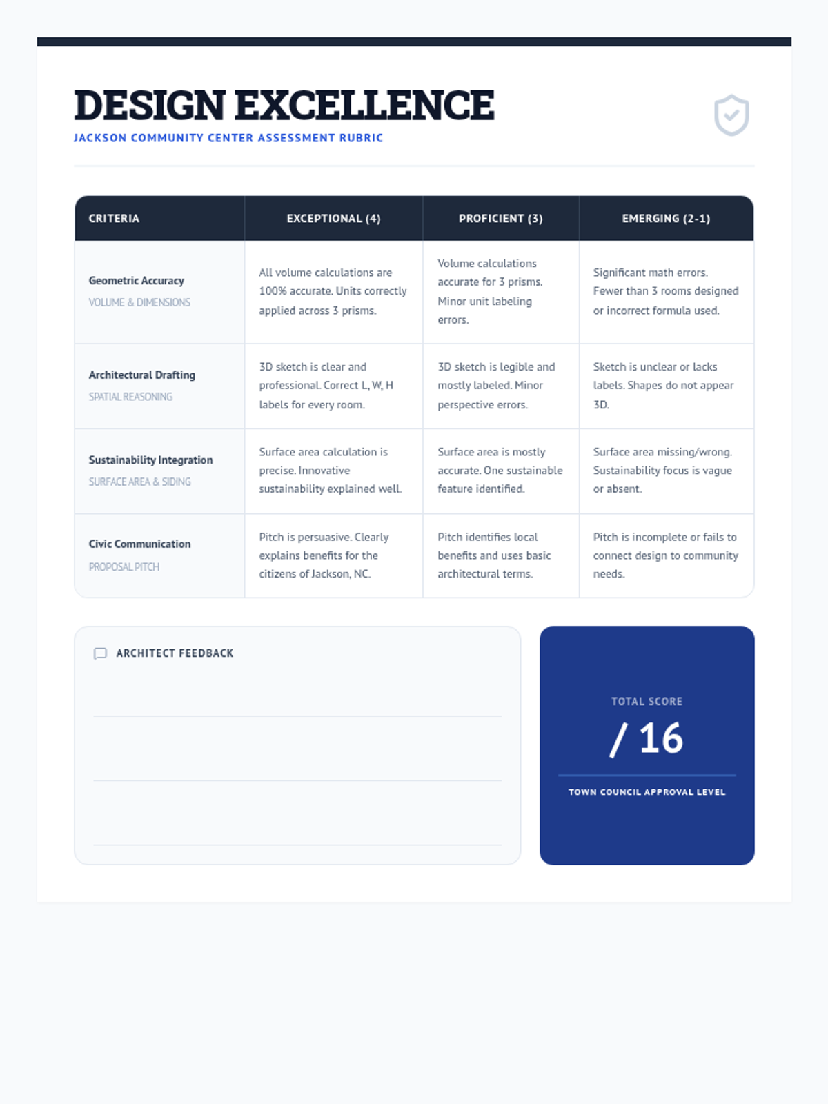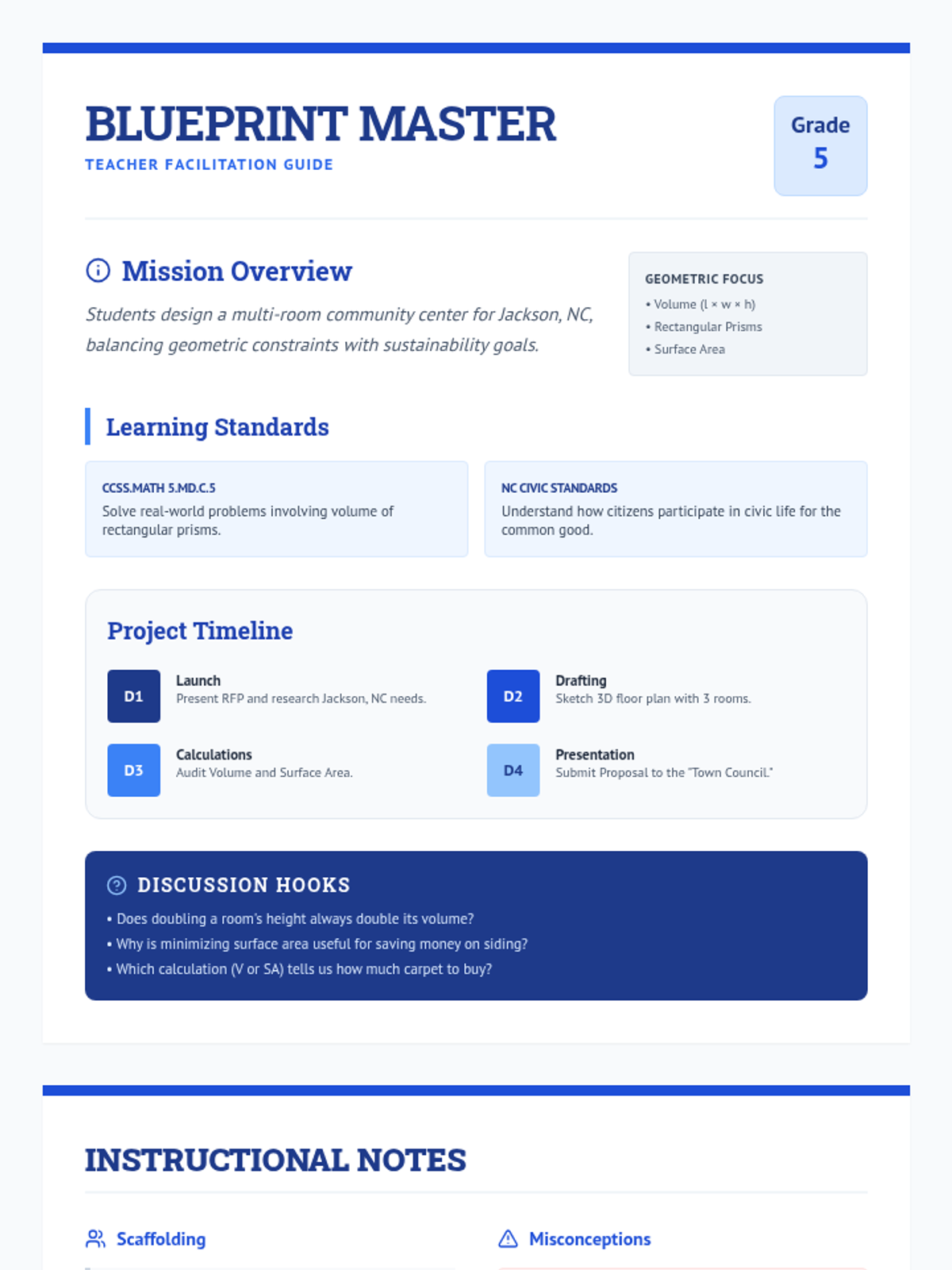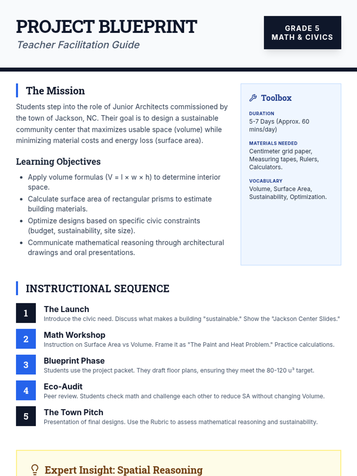 A project-based learning experience where 5th graders apply volume and surface area concepts to design a sustainable community center for Jackson, NC. Students bridge geometric standards with civic engineering and spatial reasoning through architectural drafting and calculation.