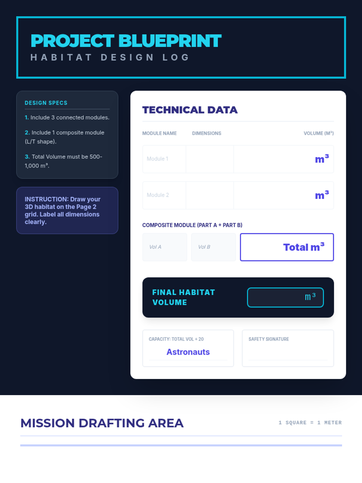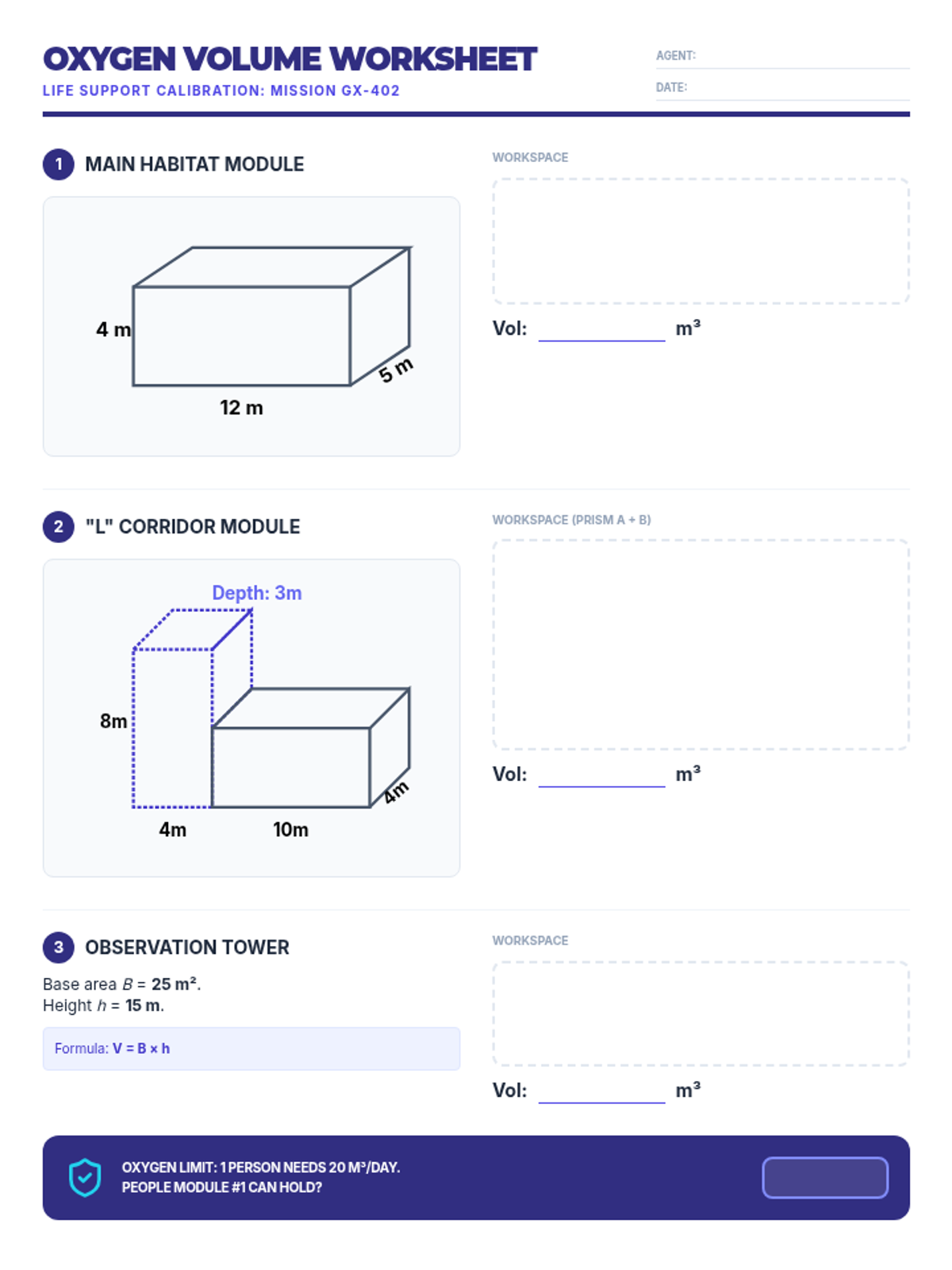 Students design futuristic space habitats by calculating the volume of rectangular prisms and composite figures to determine oxygen requirements. This lesson blends geometry with space exploration concepts for 4th and 5th grade students.