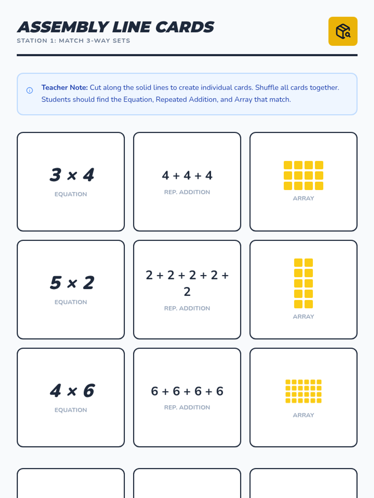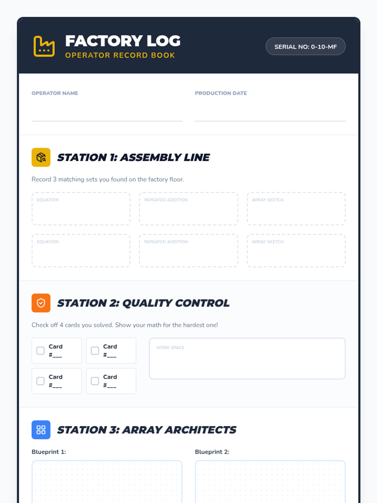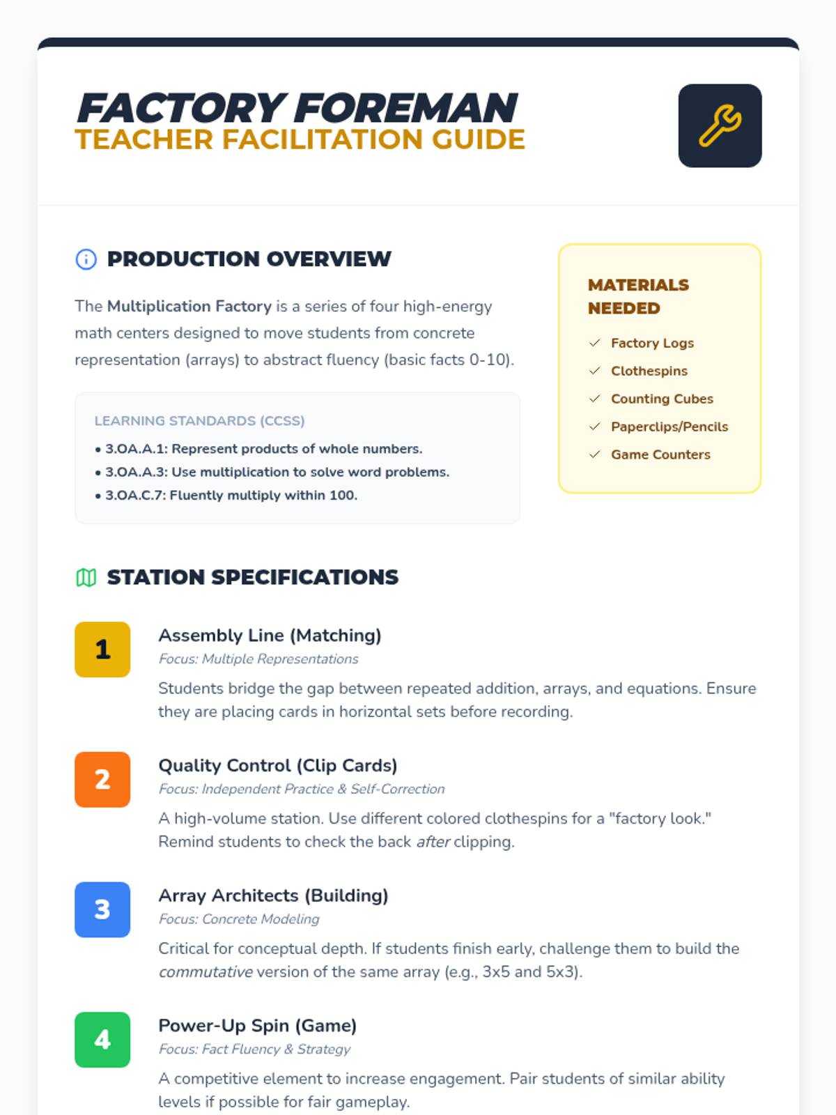 A collection of hands-on math centers designed to master multiplication facts 0-10 through arrays, repeated addition, and problem-solving. Students rotate through various 'factory stations' to build their fluency and conceptual understanding.