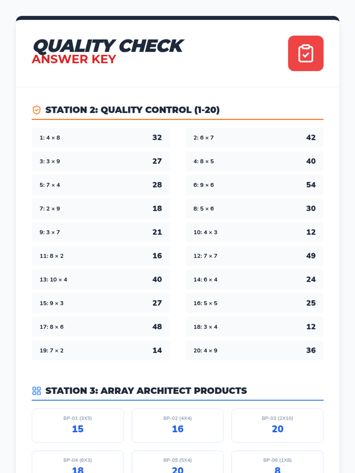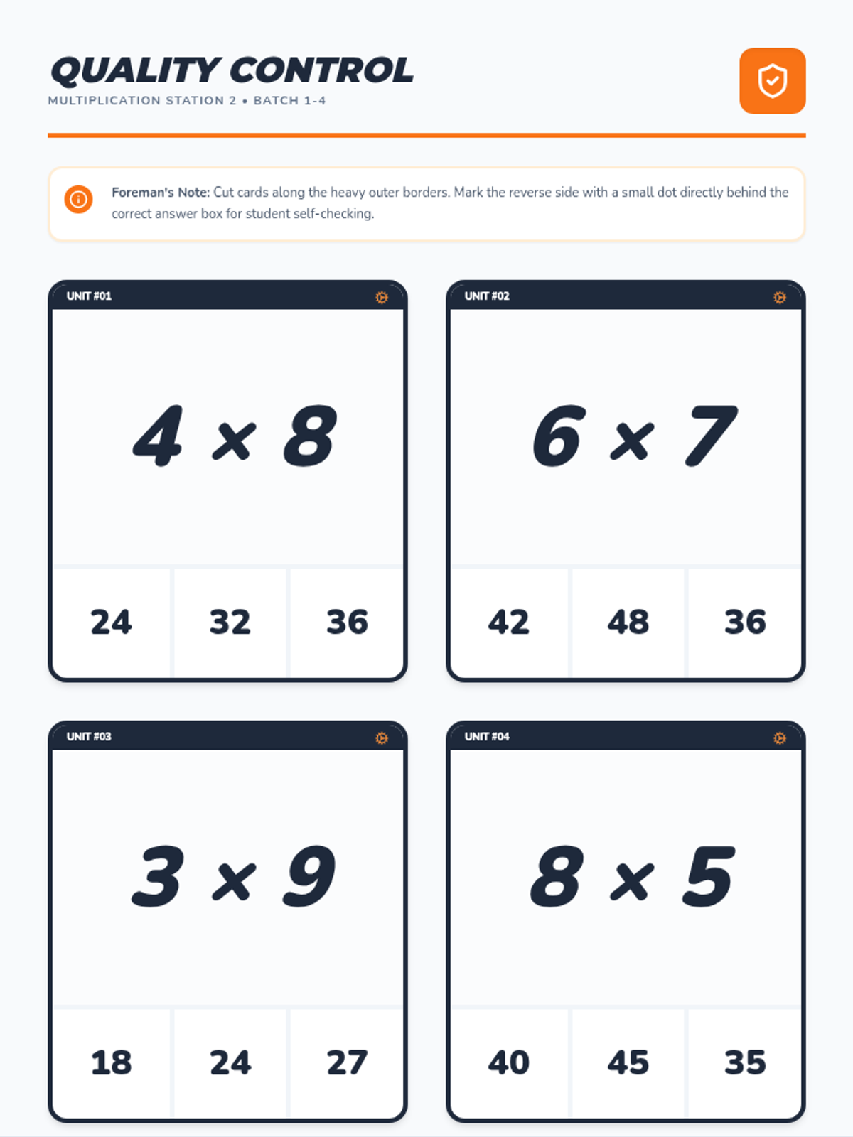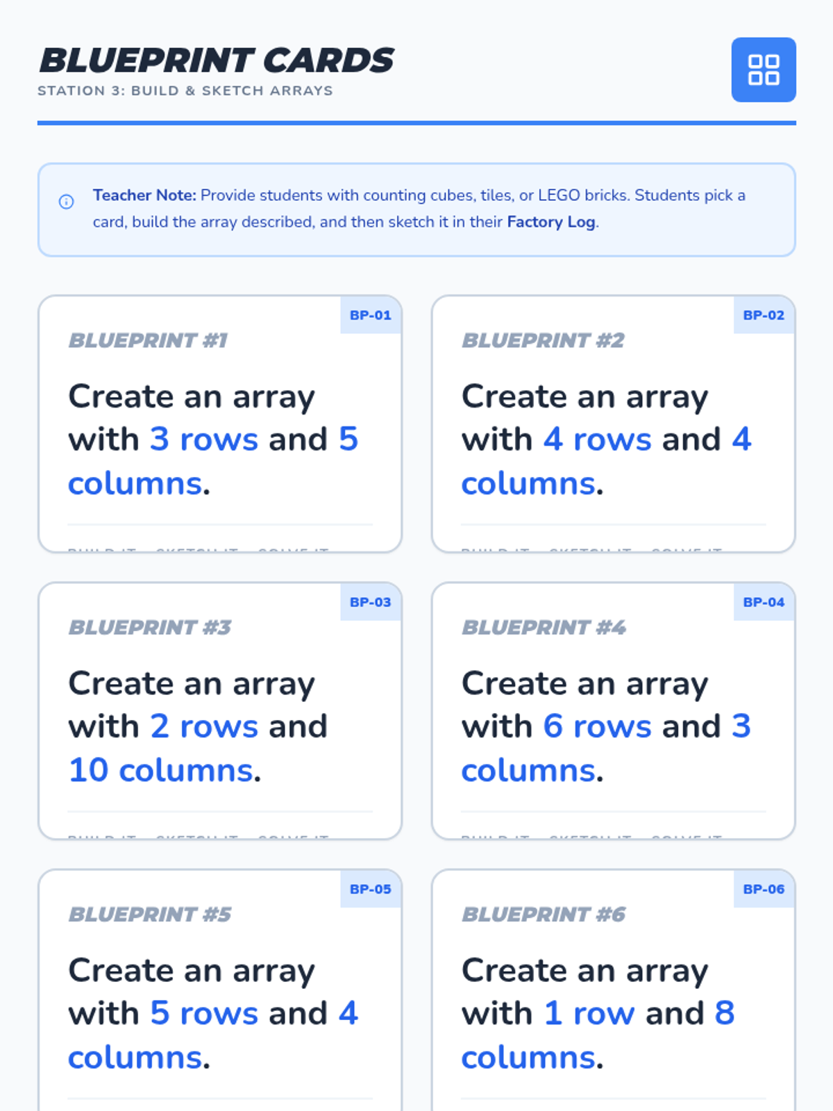 A collection of hands-on math centers designed to master multiplication facts 0-10 through arrays, repeated addition, and problem-solving. Students rotate through various 'factory stations' to build their fluency and conceptual understanding.