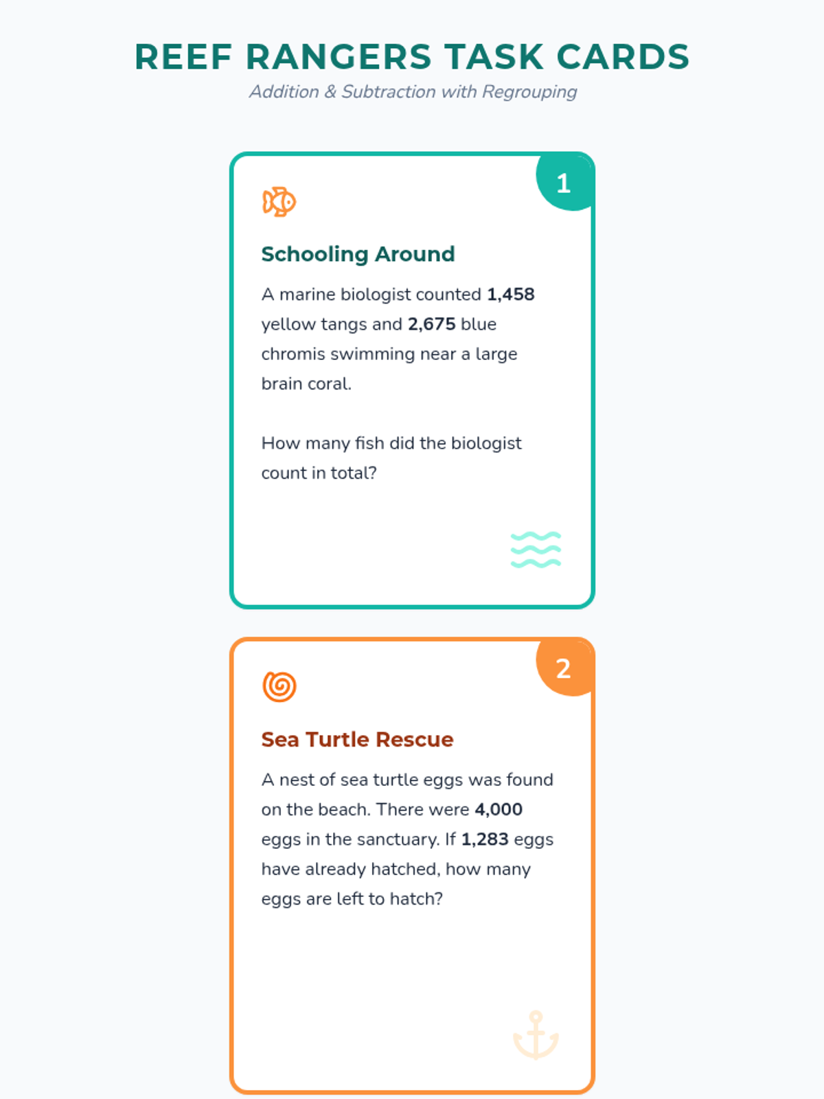 A set of 4th-grade math resources focused on addition and subtraction with regrouping, set in the vibrant ecosystem of a coral reef. Includes task cards, a student recording sheet, and an answer key.