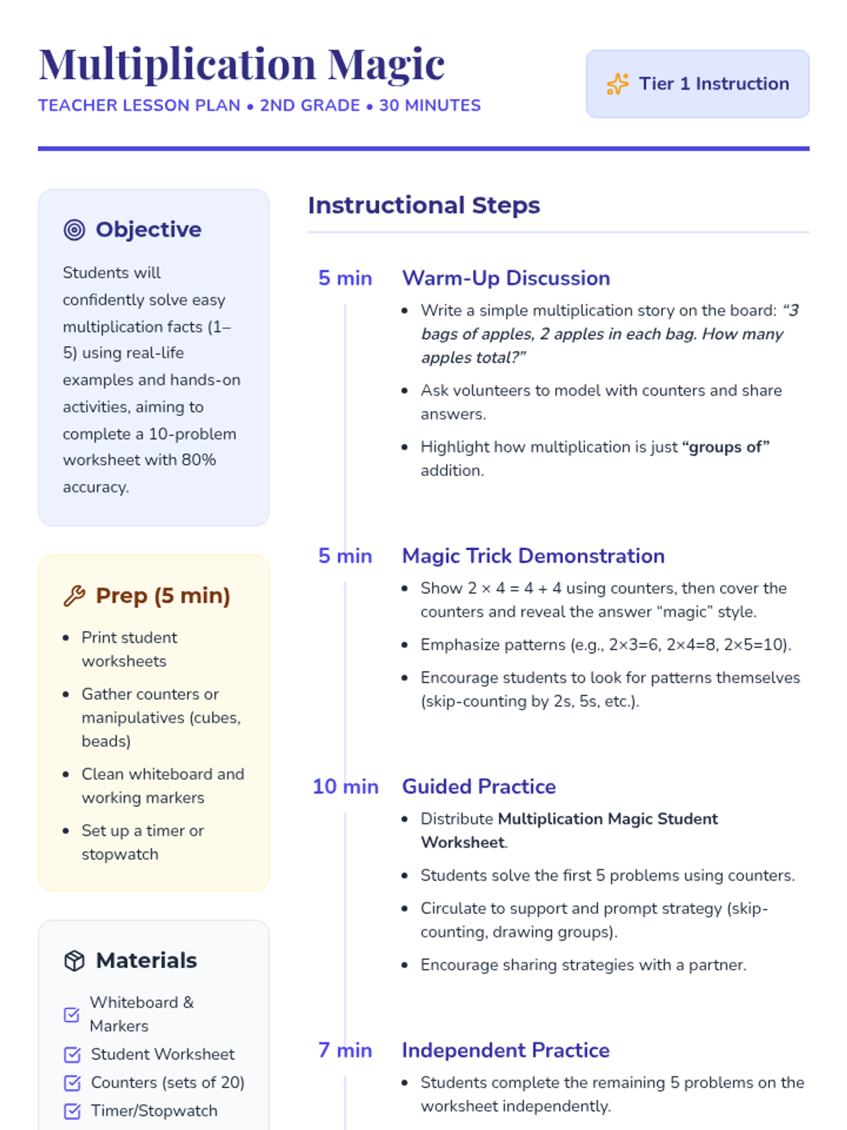 In this fun 30-minute lesson, 2nd graders will build confidence with easy multiplication facts through engaging activities and real-life examples. This Tier 1 classroom lesson boosts foundational math skills, making multiplication feel like a magic trick kids can master!
