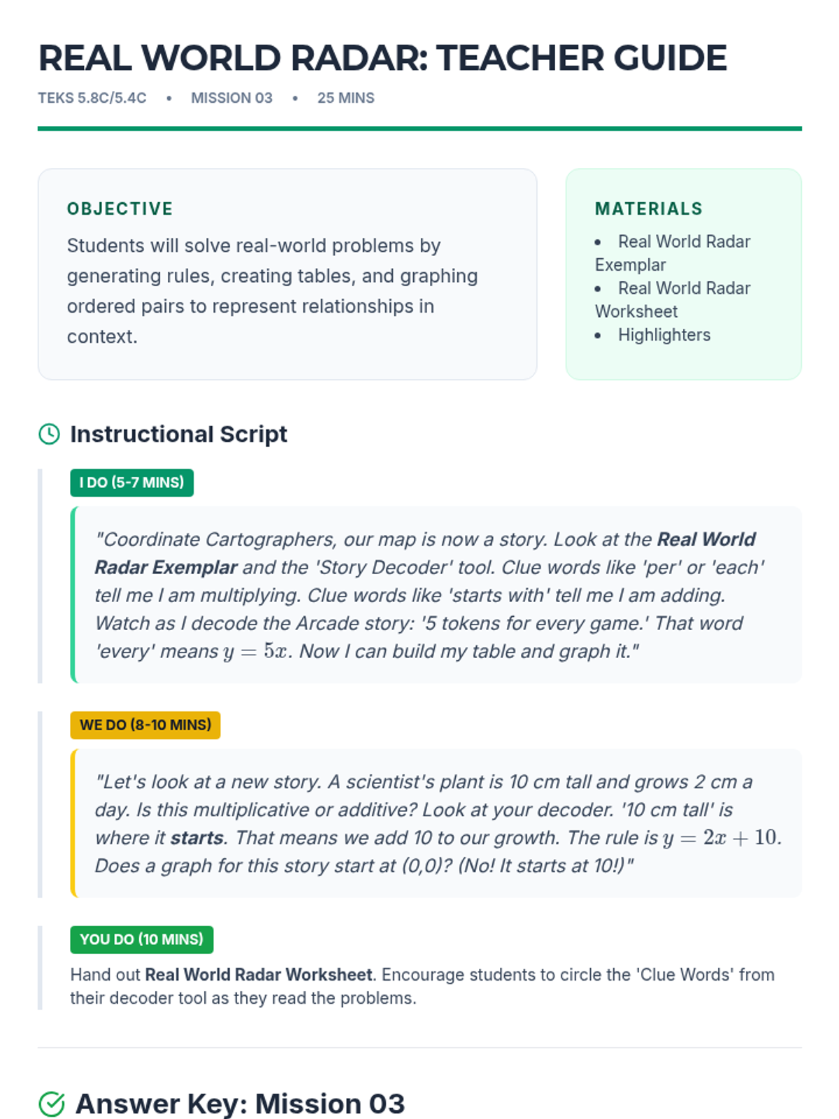 A STAAR-aligned review session that integrates patterns, tables, and graphing. Students tackle complex problems that require moving between all three representations.
