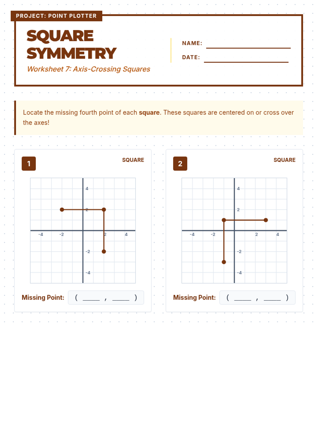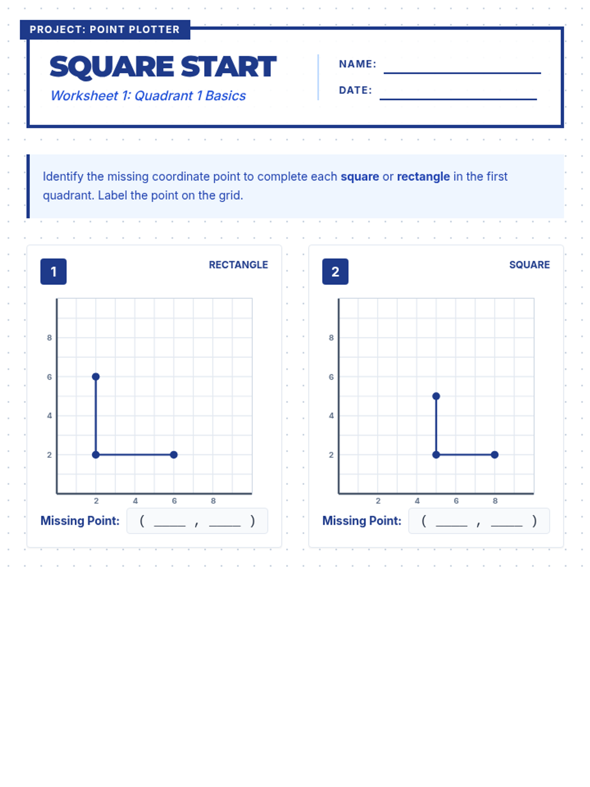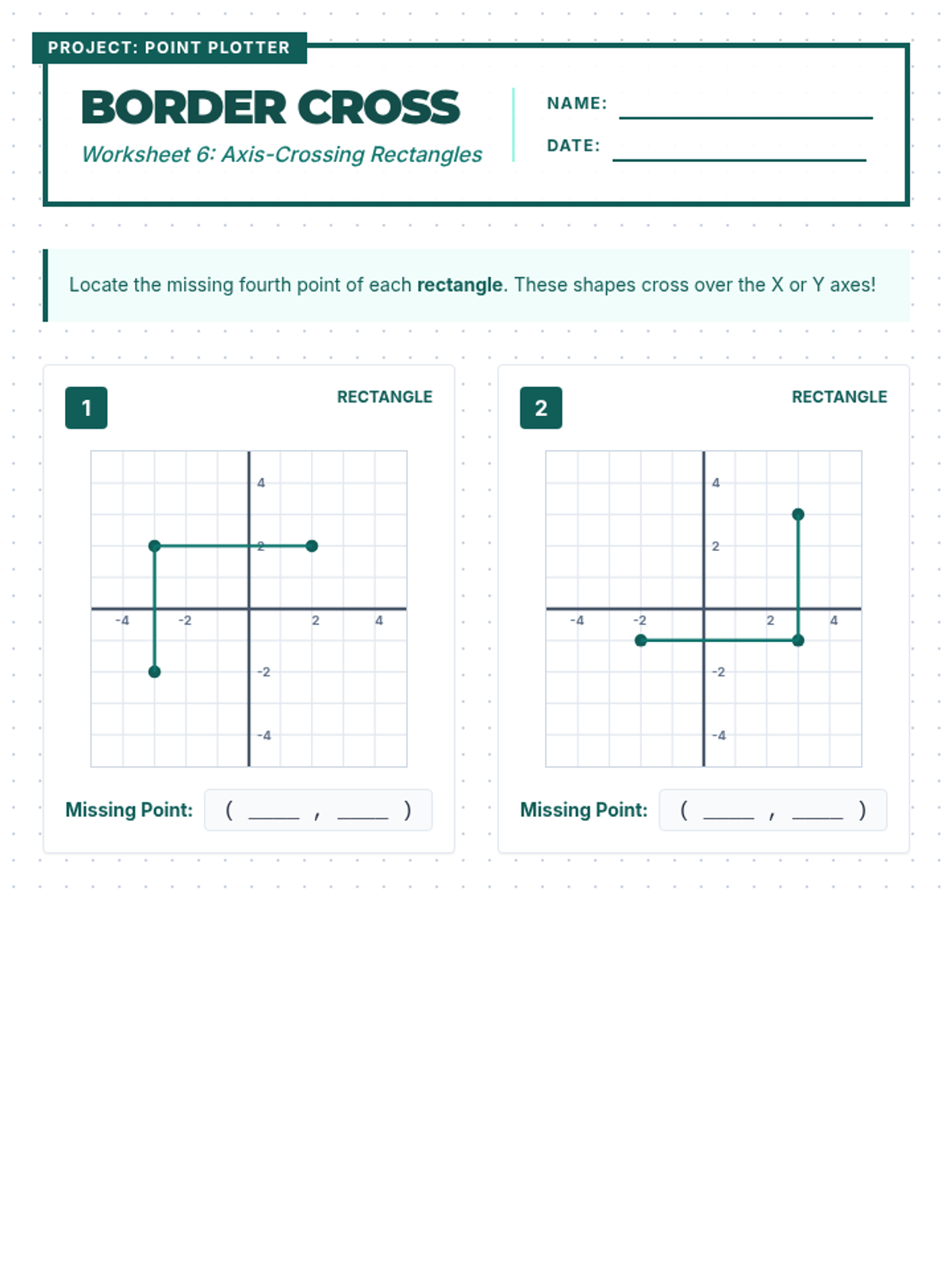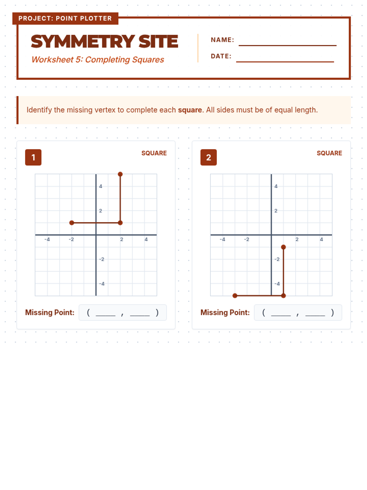 A series of 10 worksheets focused on identifying and plotting the missing vertex to complete rectangles and squares across all four quadrants of the coordinate plane.