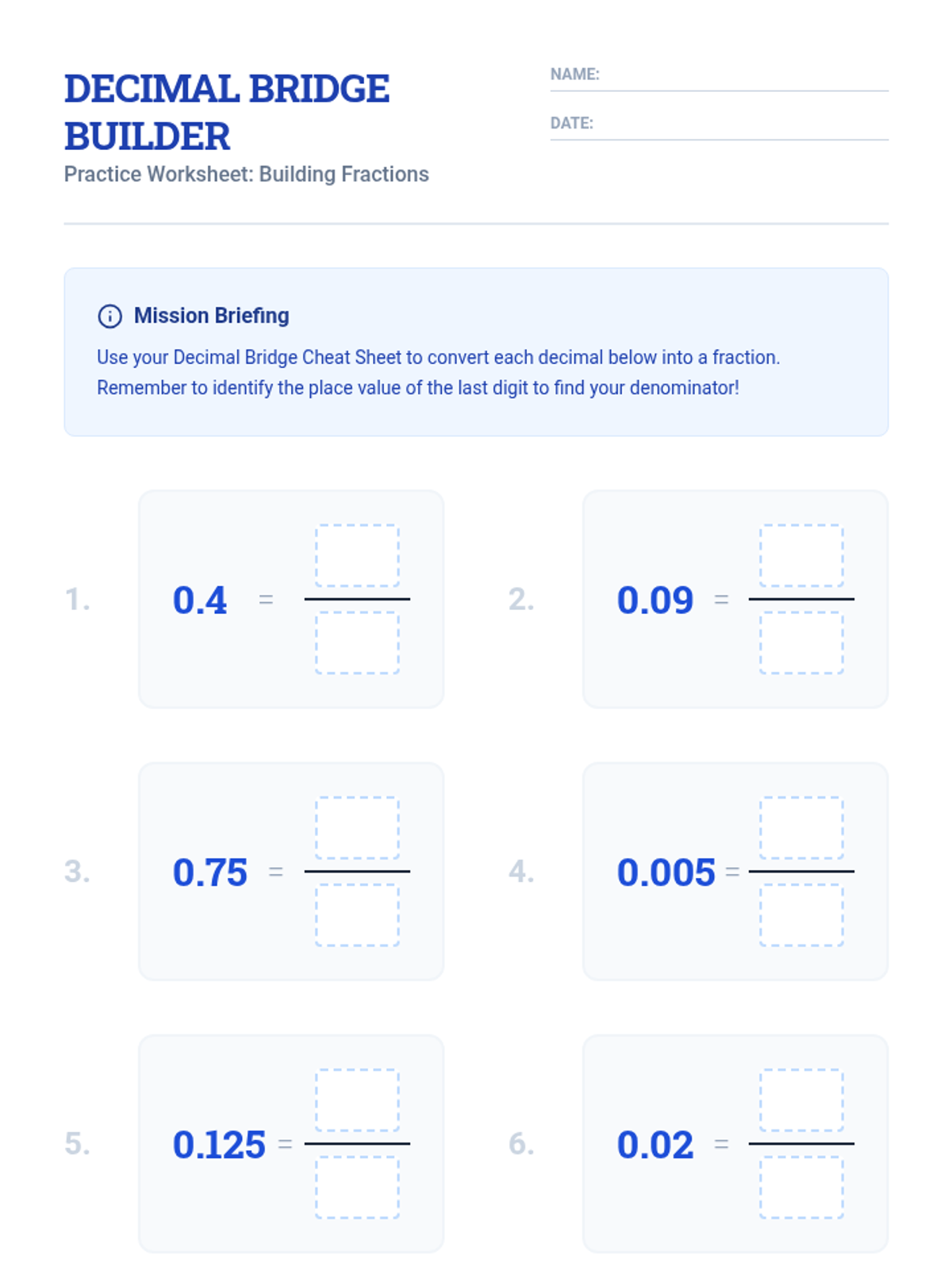 A lesson focused on converting decimals to fractions by identifying place value names and using them as denominators.