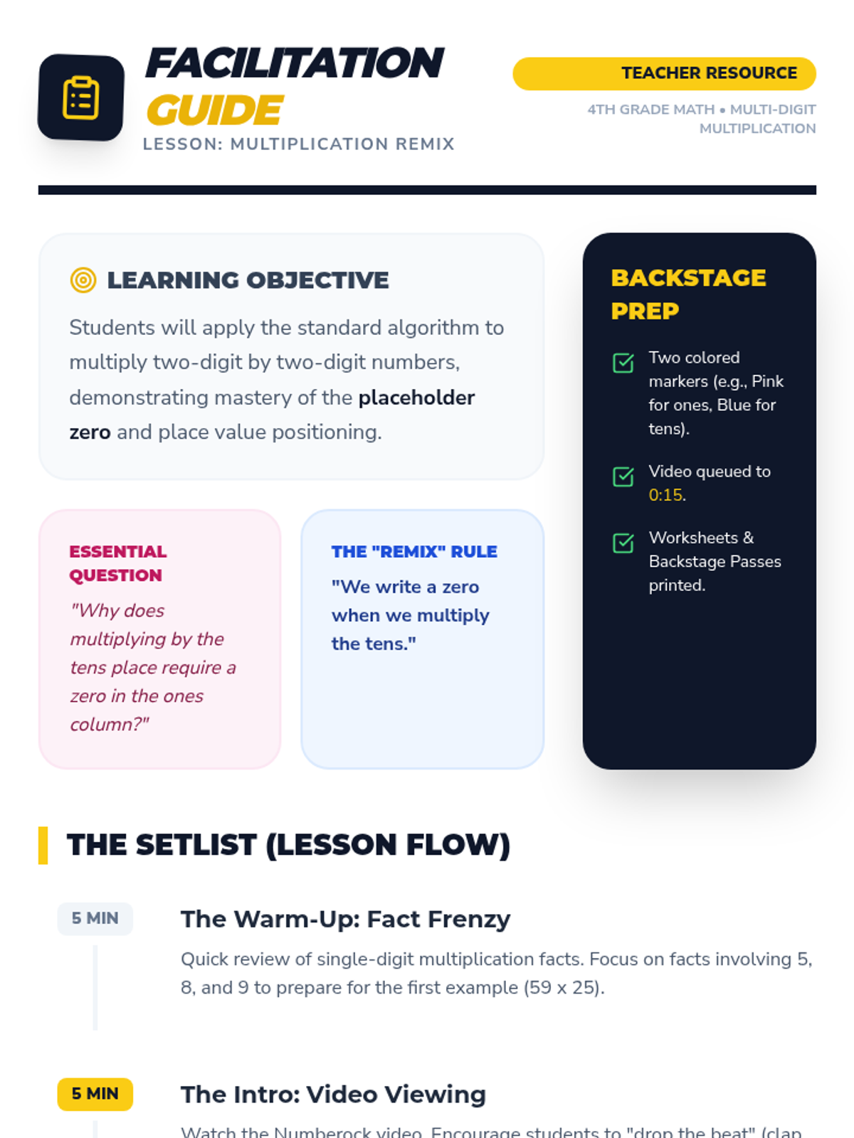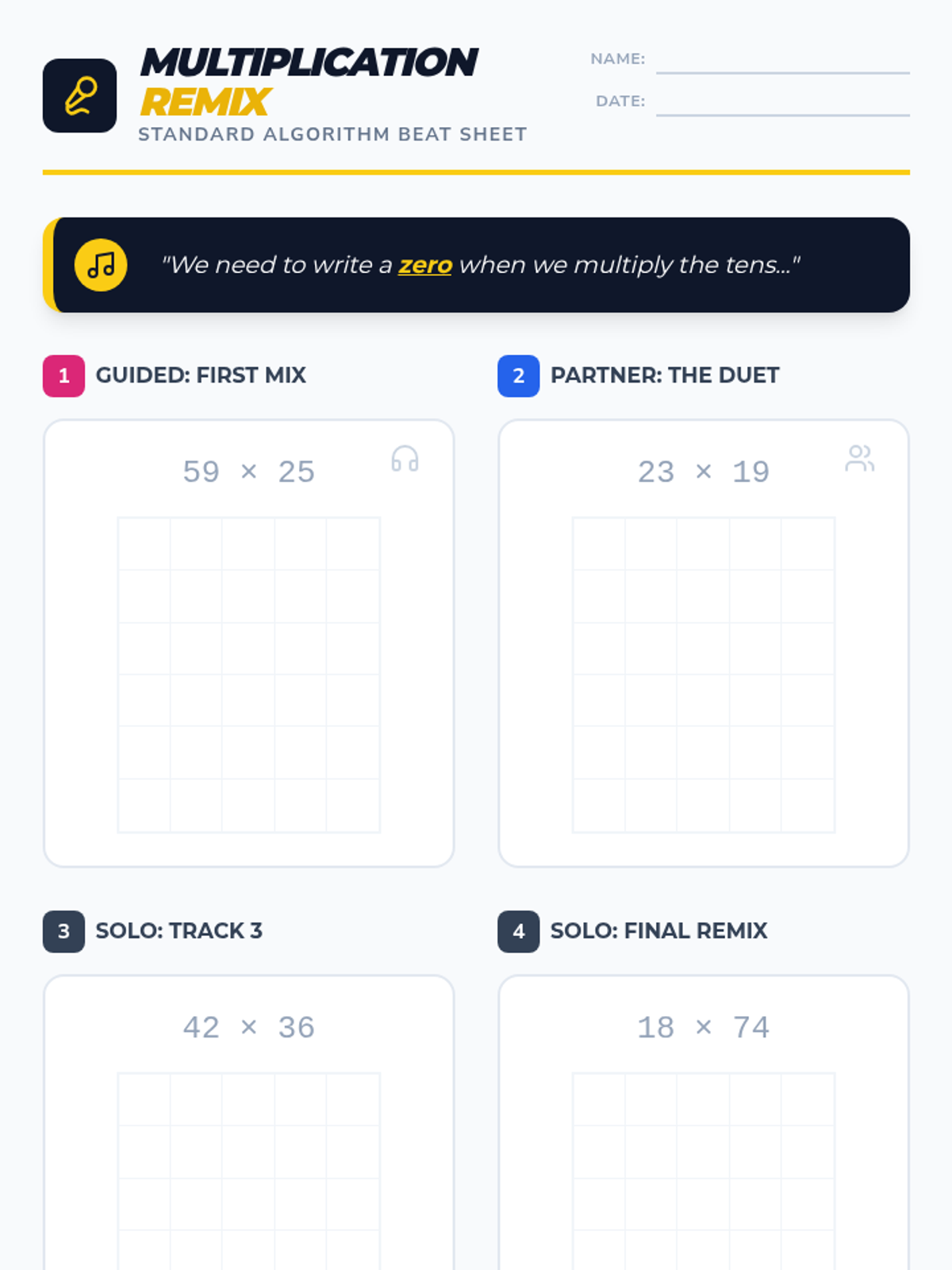 A rhythmic, high-energy lesson that uses a catchy song to teach the standard algorithm for 2-digit by 2-digit multiplication, with a heavy focus on the crucial placeholder zero.