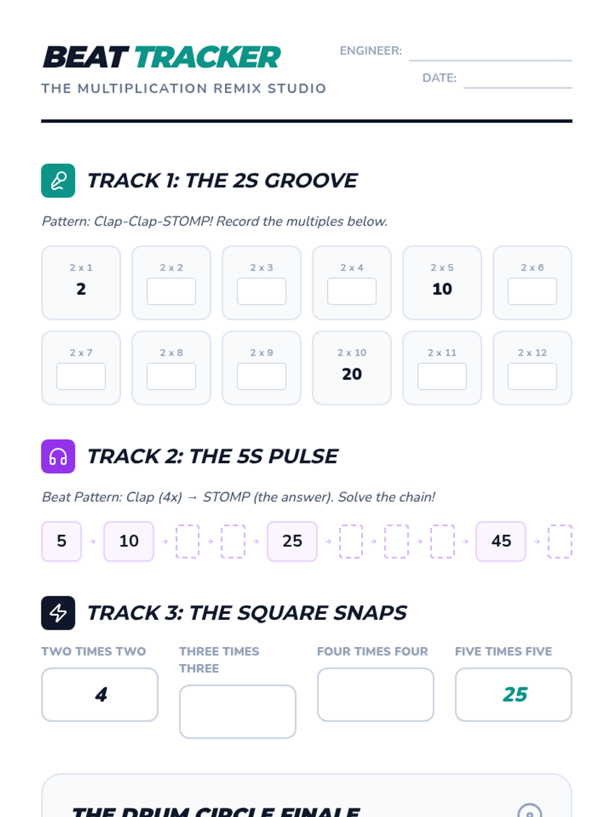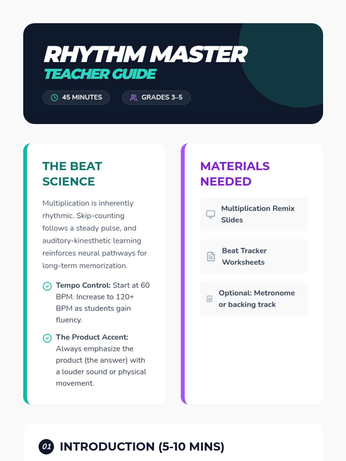 A music-integrated math lesson where students use clapping, stomping, and rhythmic patterns to master multiplication facts for 2s, 5s, 10s, and perfect squares.