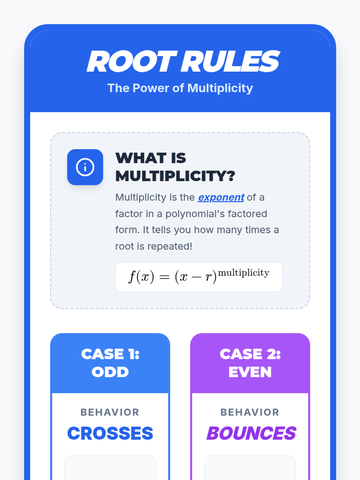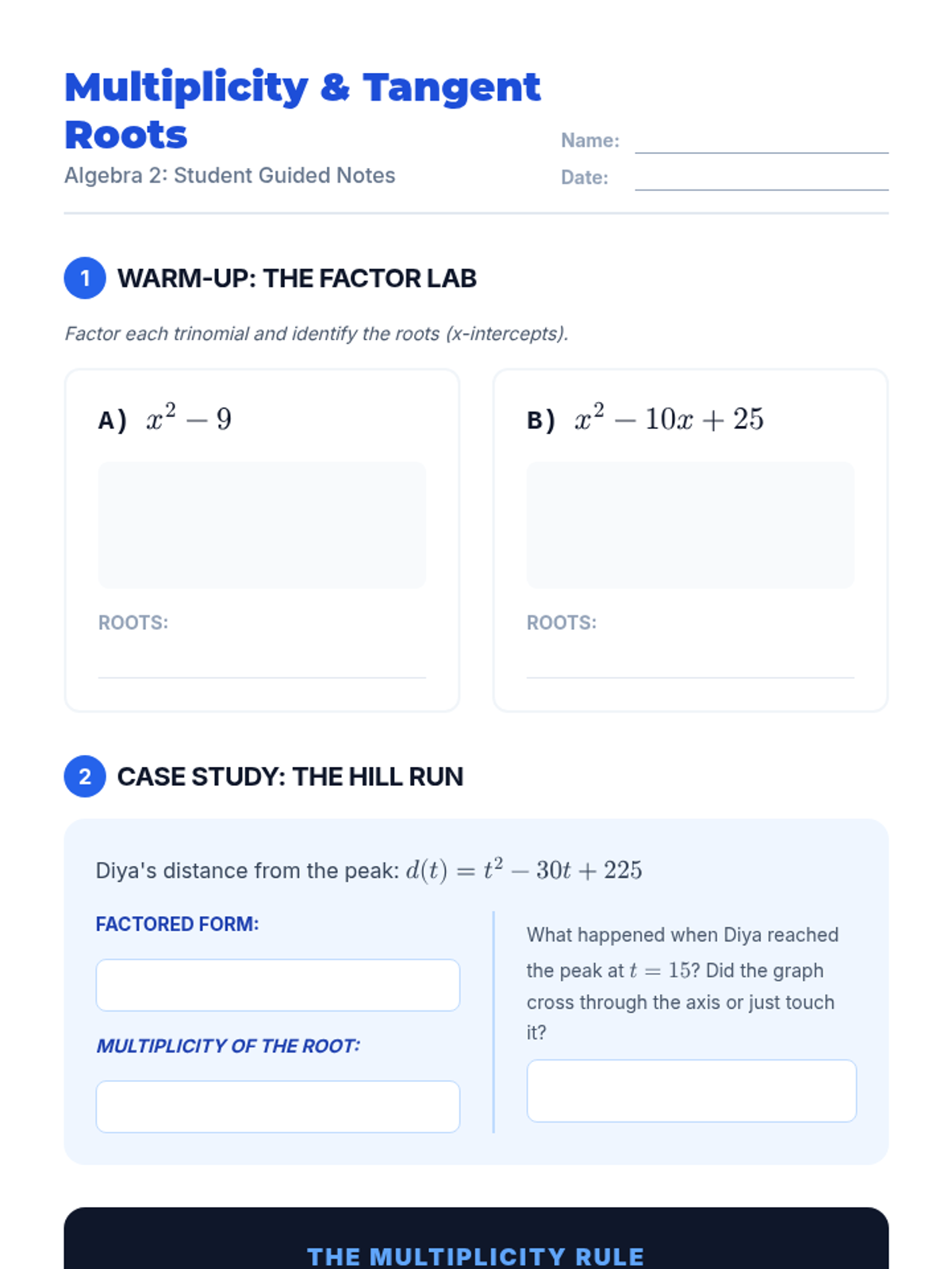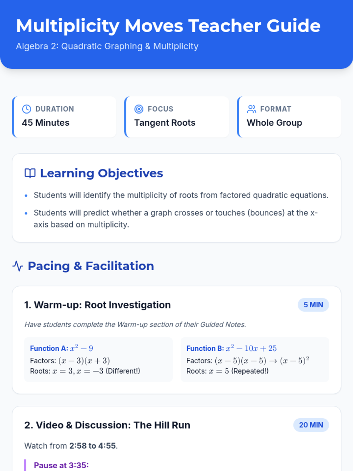 Students will explore how the multiplicity of roots affects the behavior of quadratic graphs at the x-axis, transitioning from crossing to 'bouncing' (tangency). The lesson uses a real-world hill-running scenario to illustrate these concepts visually and algebraically.